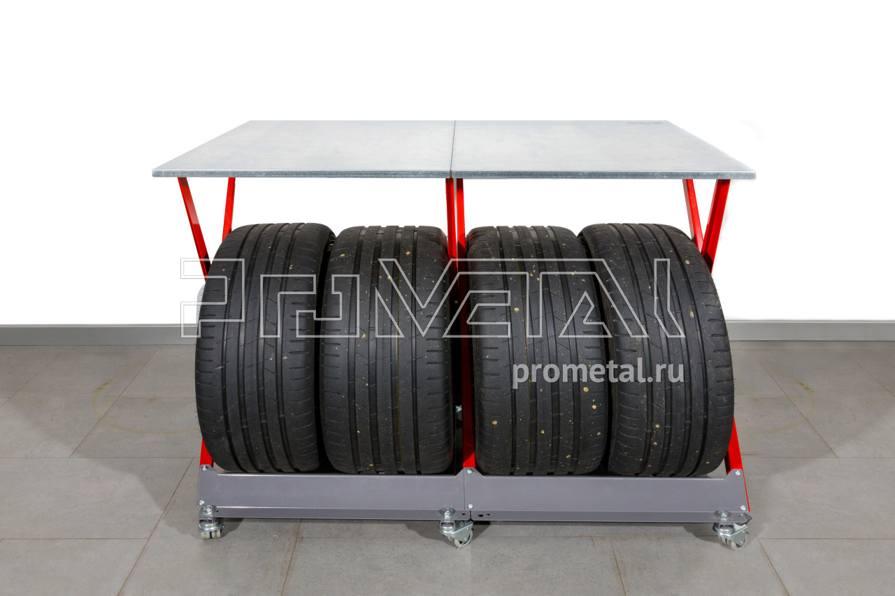 В такой комплектации мы получаем полноценный стол-верстак с хранением колёс - практичное решение для гаража, мастерской, кладовой, хозблока, автосервиса.