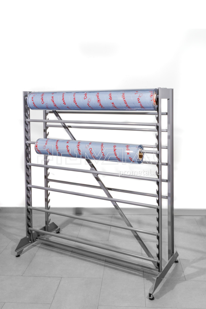 Стенд "10 рулонов" предназначен для размещения материалов в рулонах (на одном стенде могут размещаться 14 шт.). Выдерживает значительные нагрузки.