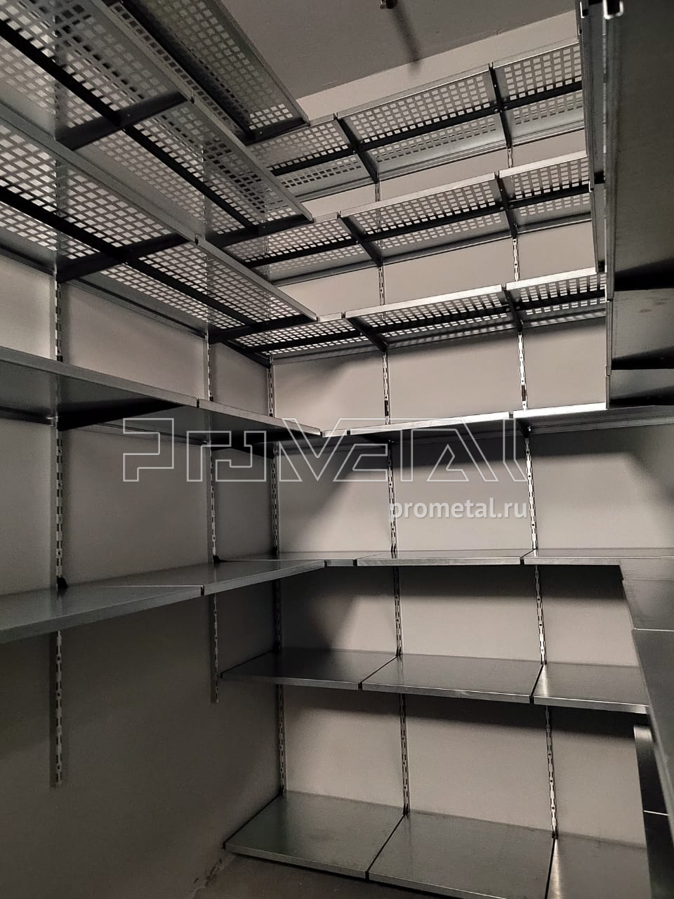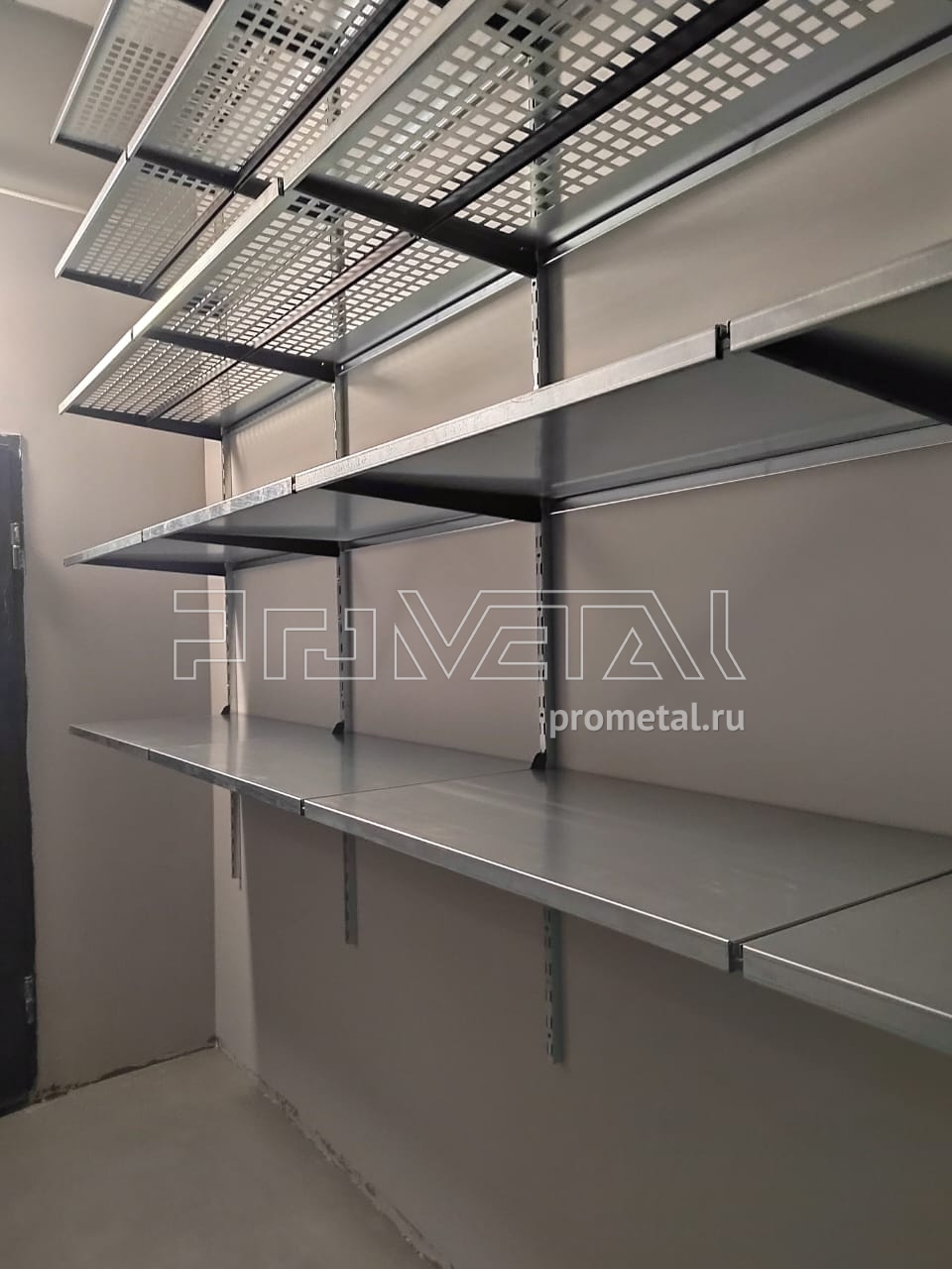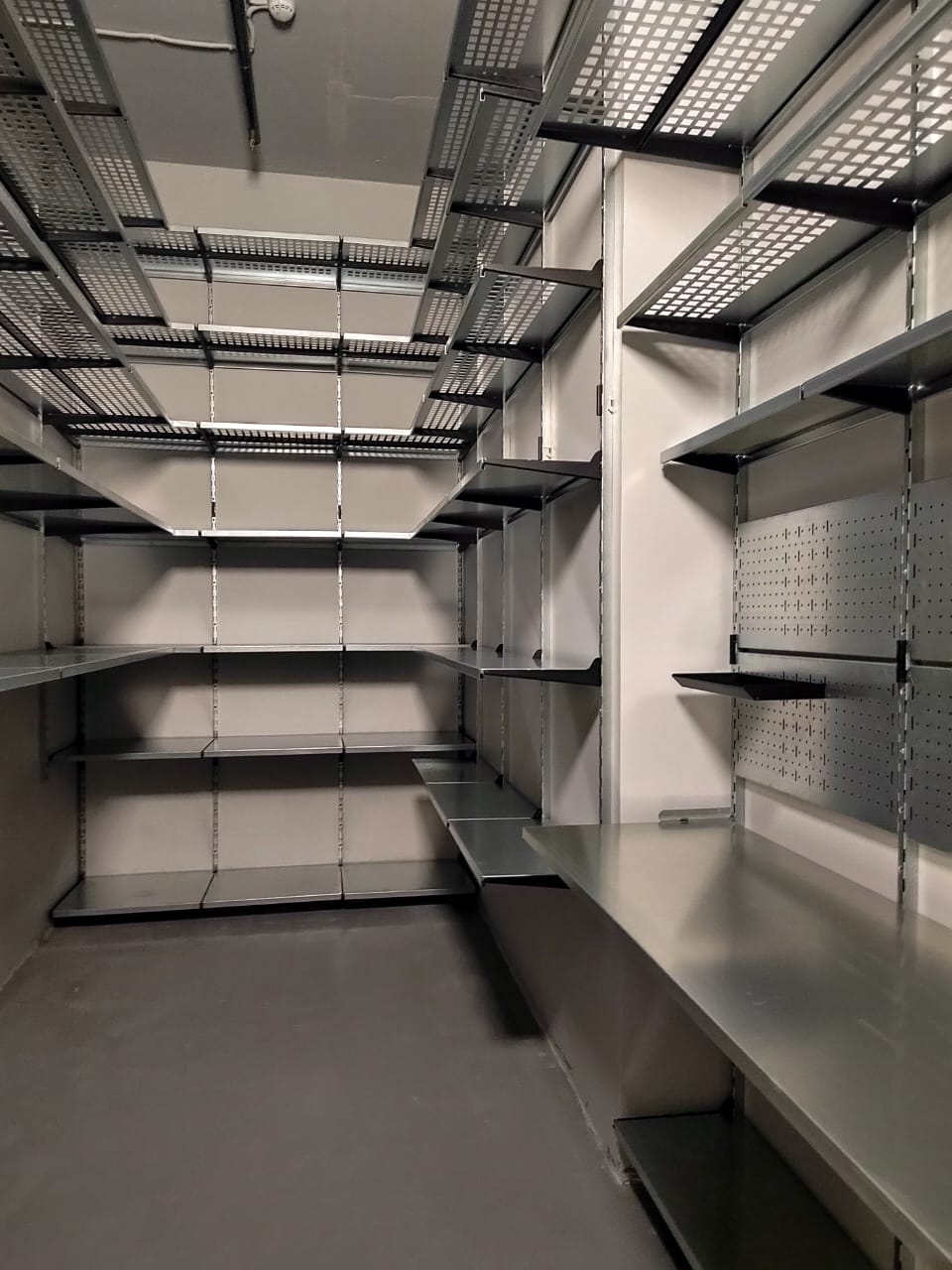 В этом проекте по обустройству кладовой нашей стеллажной системой мы задействовали 3 стены. На одной из них установили 7 рядов полок. Те, что выше человеческого роста - с перфорацией, ниже - цельные. К счастью, в этом помещении хорошие потолки, достаточно высокие, чтобы мы поставили полки на высоте 3м (это максимальная высота, на которую мы устанавливаем верхнюю полку).