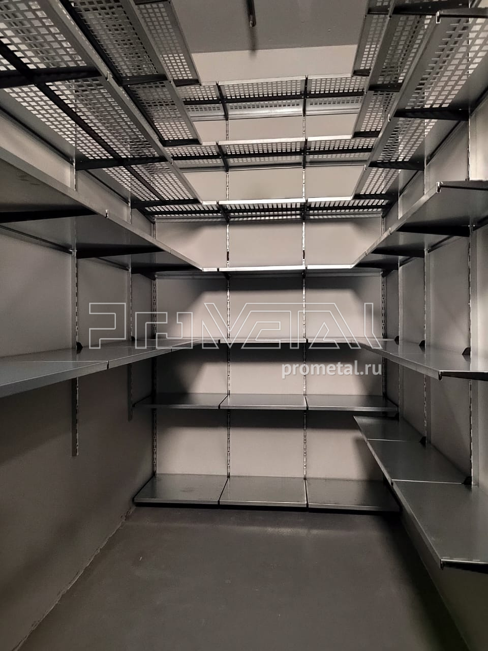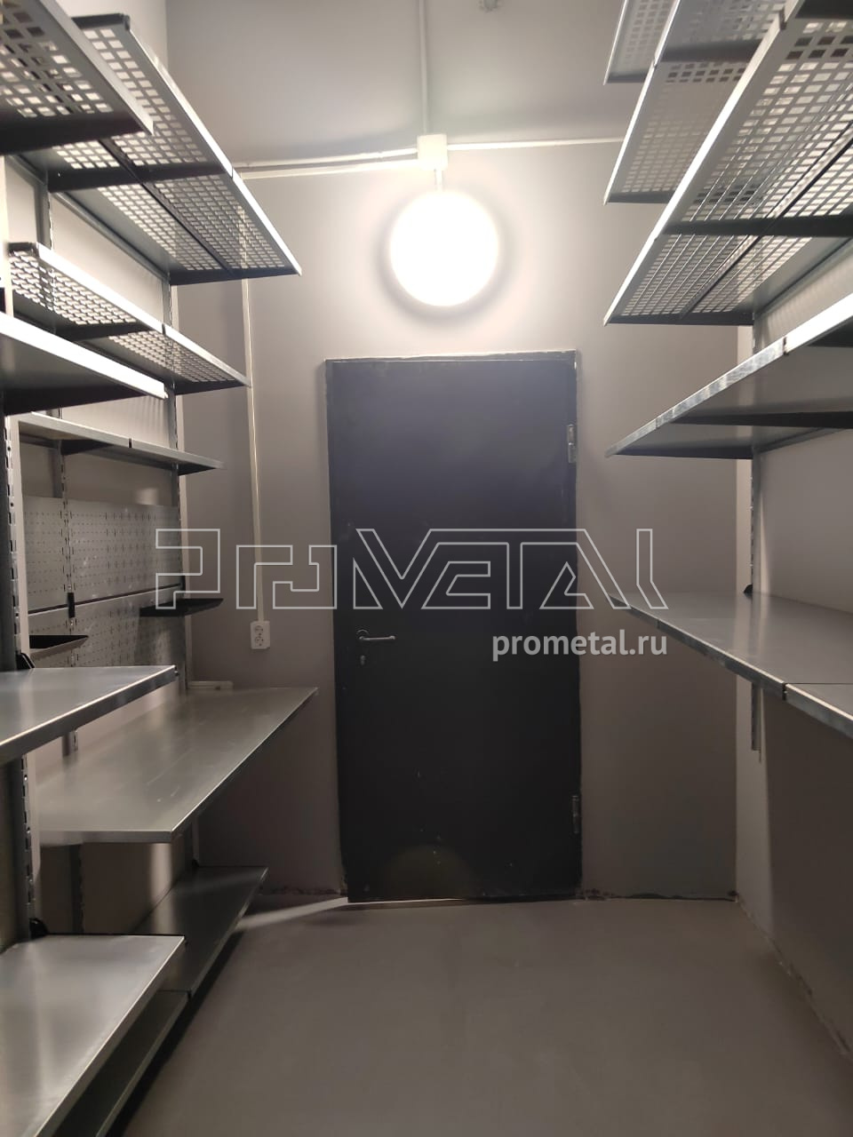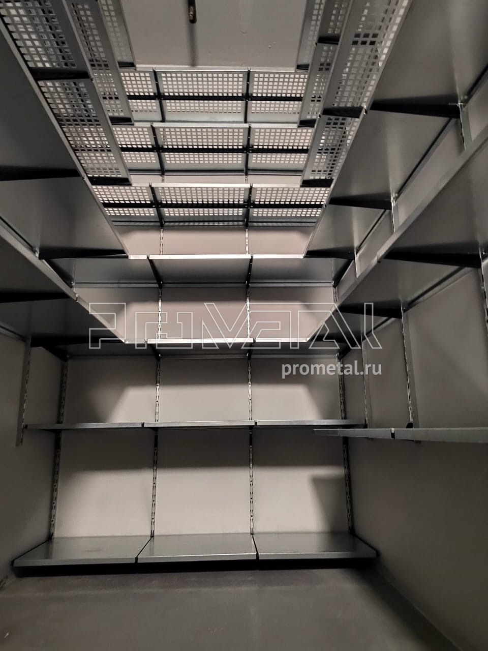 В этом проекте по обустройству кладовой нашей стеллажной системой мы задействовали 3 стены. На одной из них установили 7 рядов полок. Те, что выше человеческого роста - с перфорацией, ниже - цельные. К счастью, в этом помещении хорошие потолки, достаточно высокие, чтобы мы поставили полки на высоте 3м (это максимальная высота, на которую мы устанавливаем верхнюю полку).