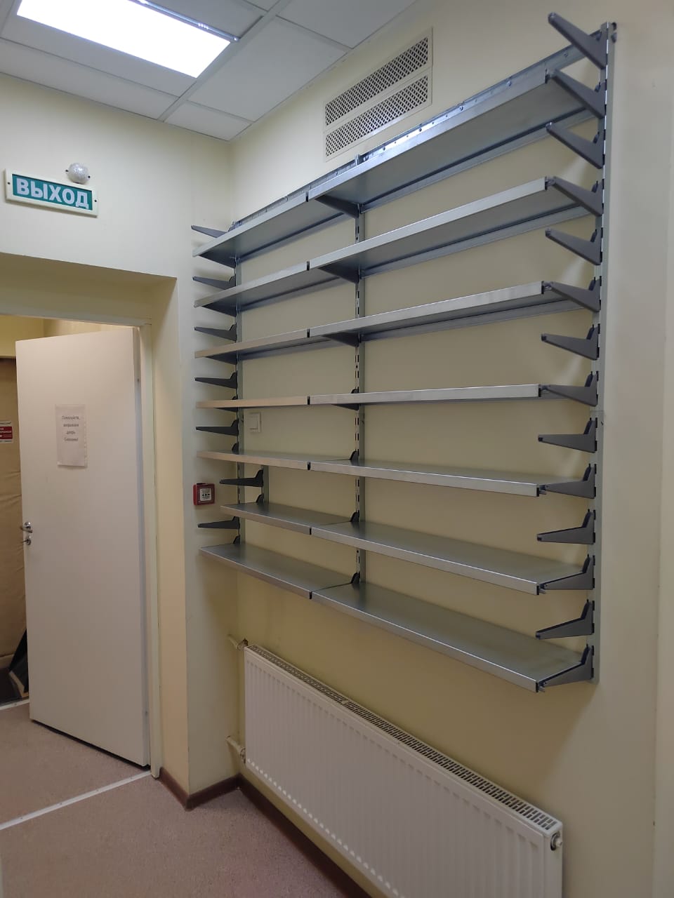 Во время монтажа наш опытный установщик Геннадий внес несколько полезных изменений, включая отступ полок от пожарной кнопки.