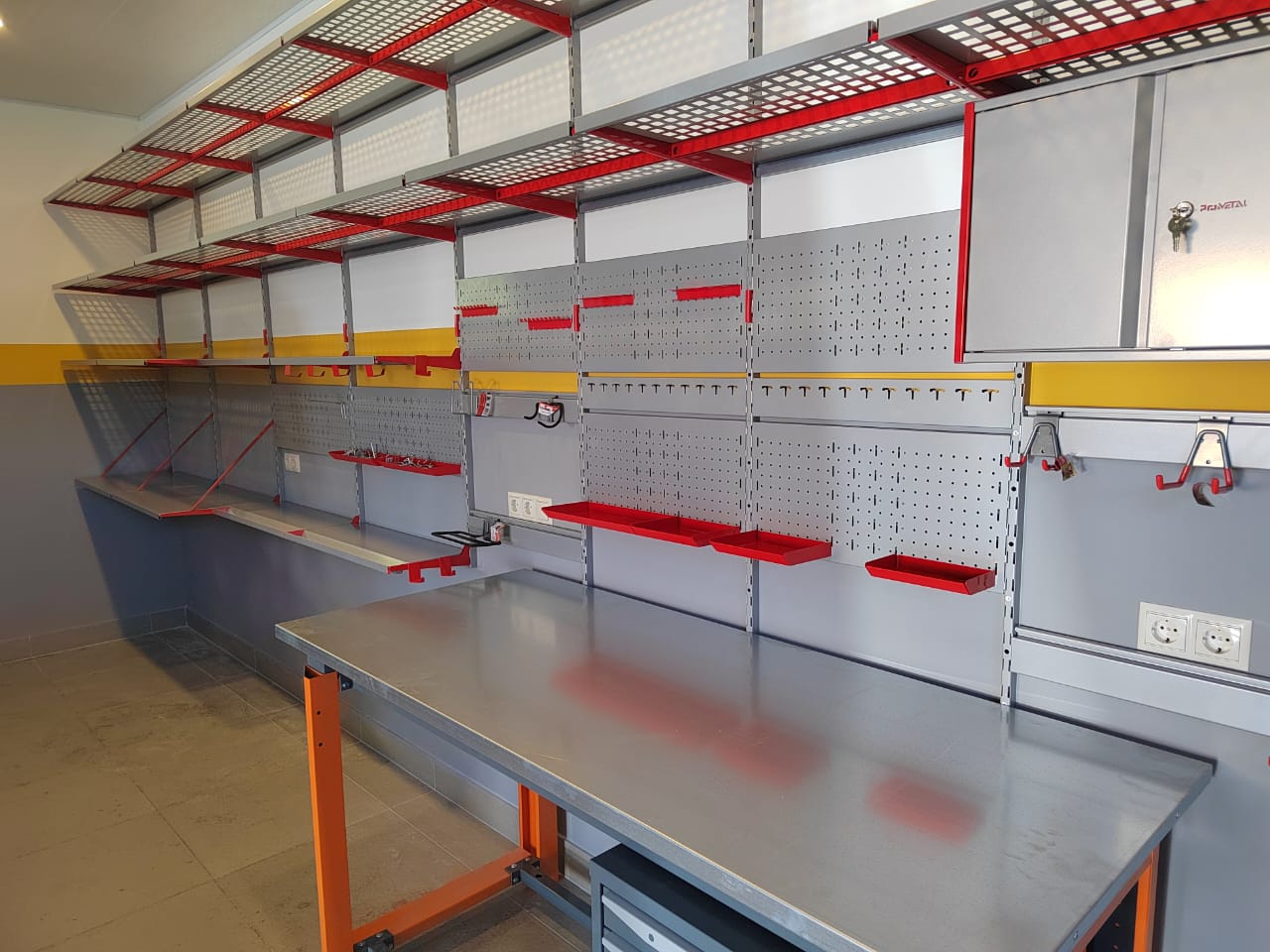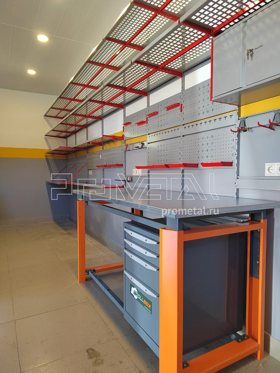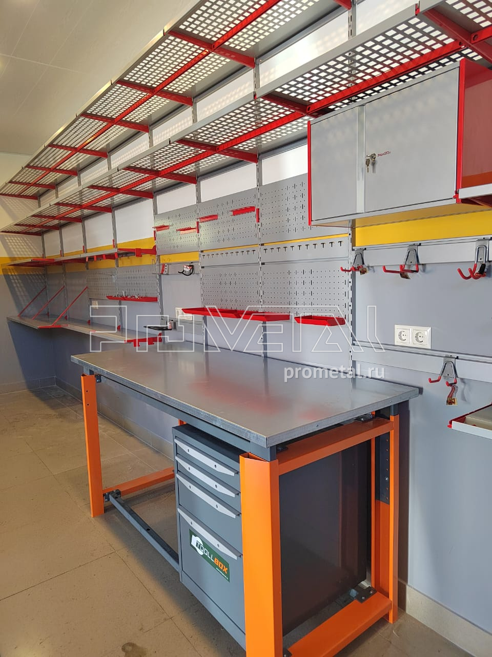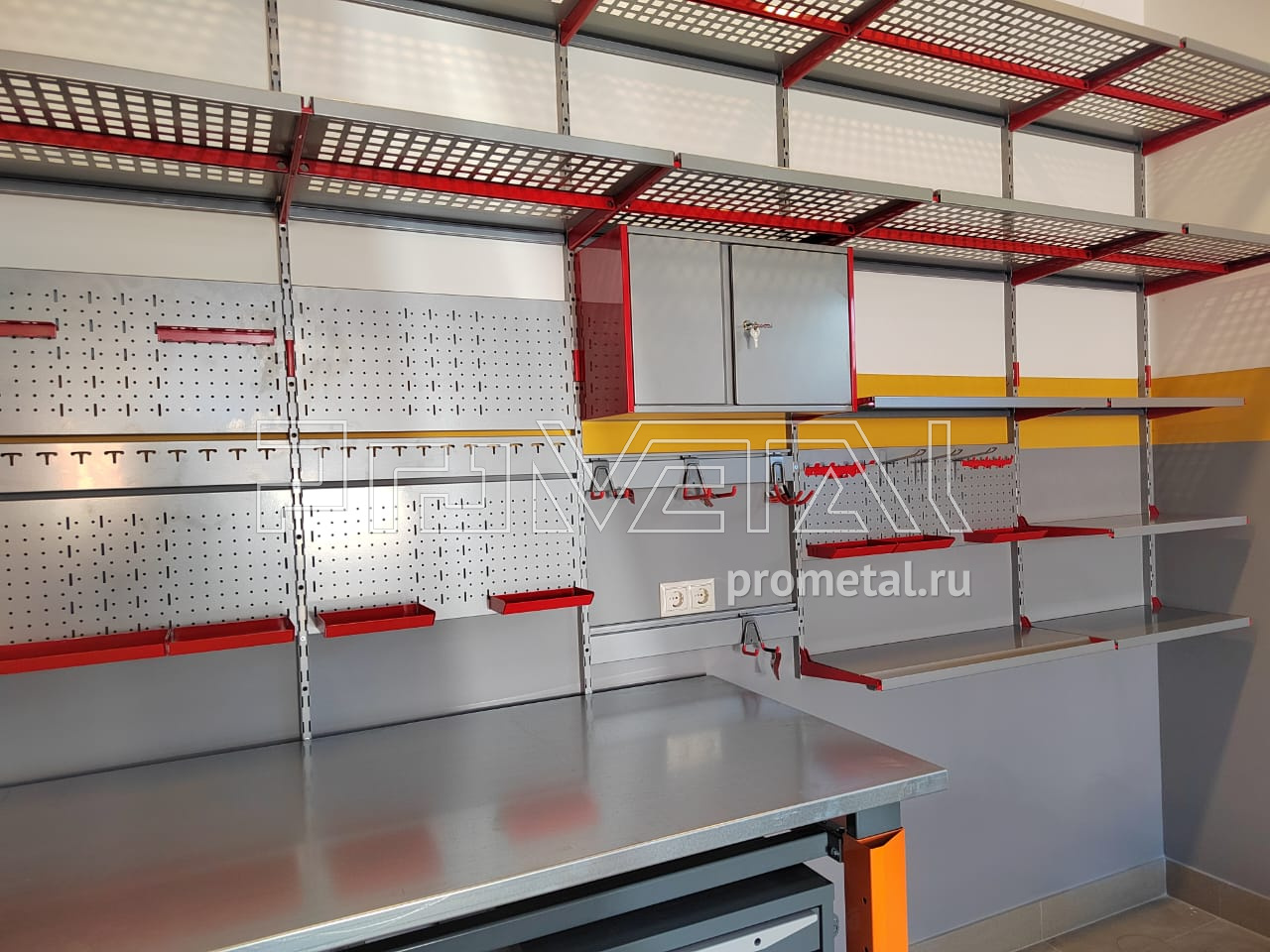 — Над верстаком установлены перфопанели, на которых удобно разместить крючки, держатели инструментов и лотки для мелочей.
