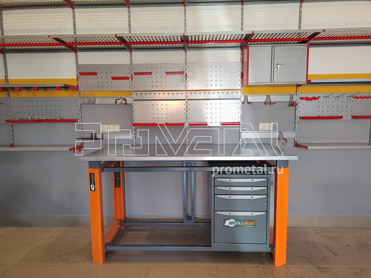 — Рабочий металлический верстак длиной 180 см и глубиной 75 см, с возможностью регулировки высоты от 92 до 104 см. Это позволяет адаптировать его под любой рост и задачи. У верстака - тумба с выдвижными ящиками.