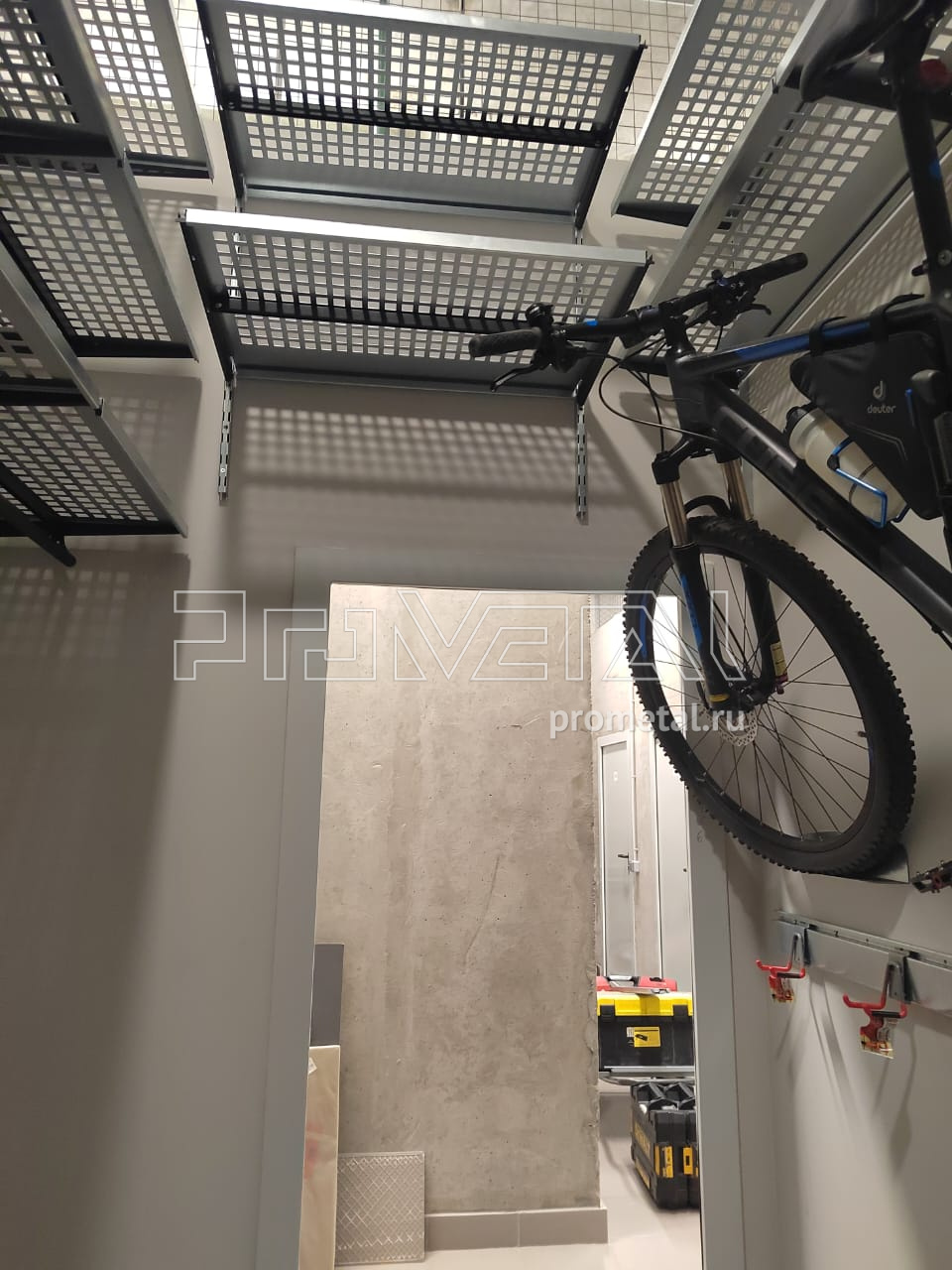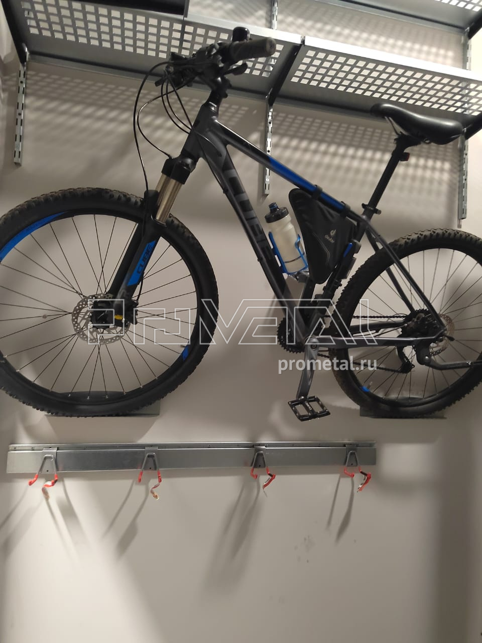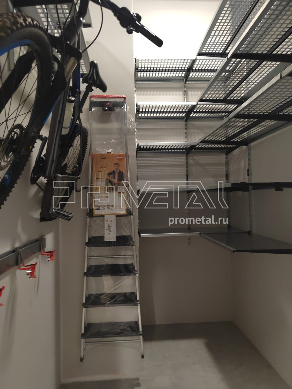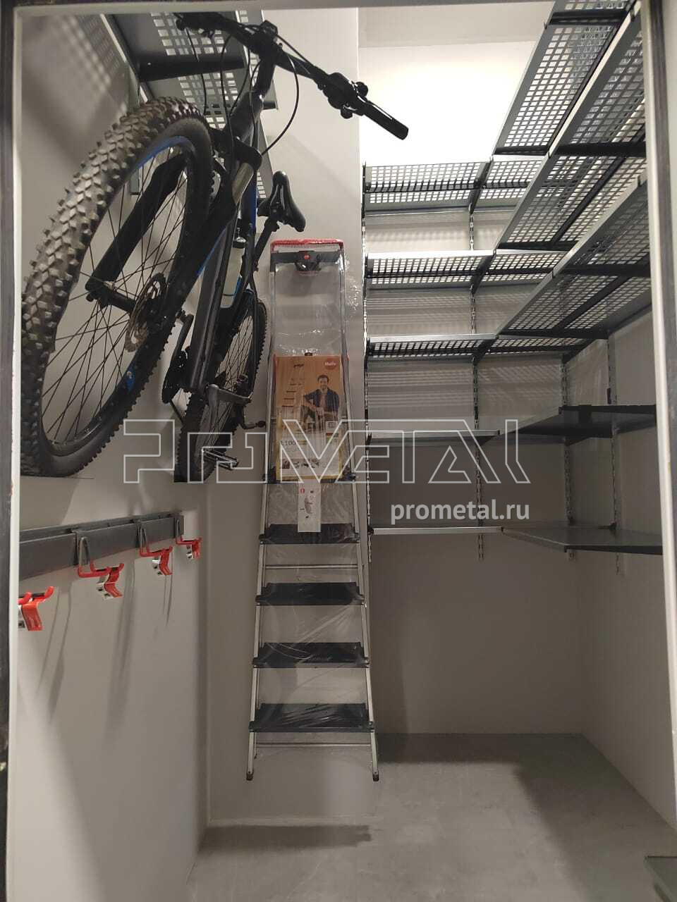 Слева от входа предусмотрено место для велосипеда, который можно повесить на специальный кронштейн за педаль. Также есть место для стремянки. Мы установили систему на всех четырех стенах, при этом сохранив удобный проход в кладовую — ничего не мешает движению. После монтажа заказчики сразу же заказали дополнительные полки, которые мы доставили без задержек.