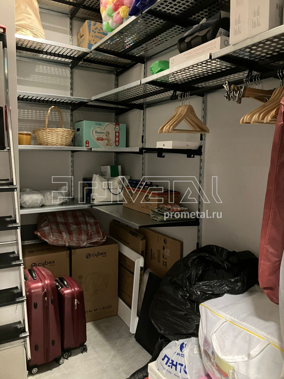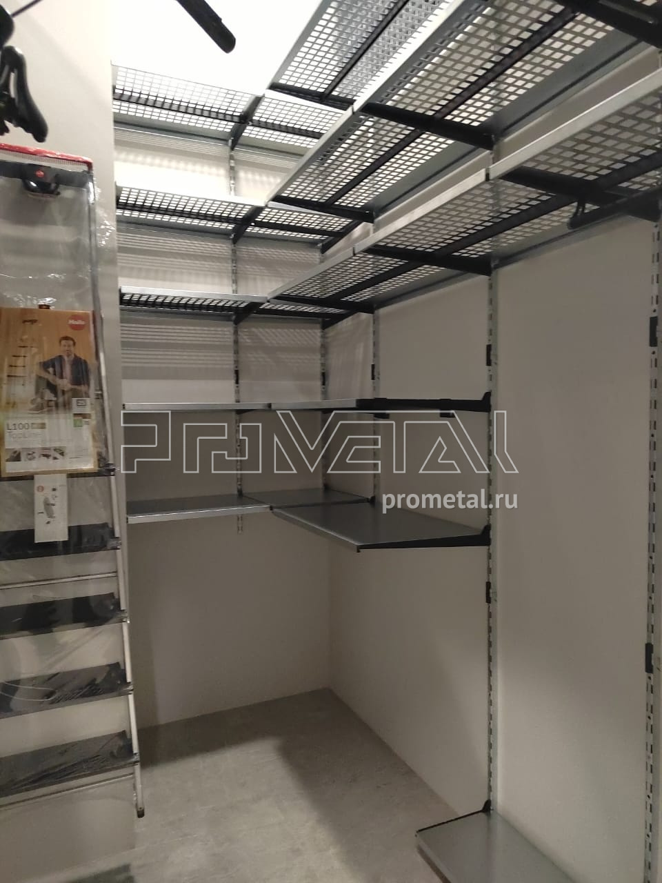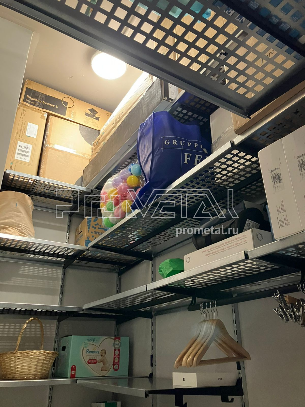 Полки выше роста человека сделали с перфорацией, что особенно важно для такой высокой кладовой — снизу будет видно, что там лежит, и они пропускают свет.