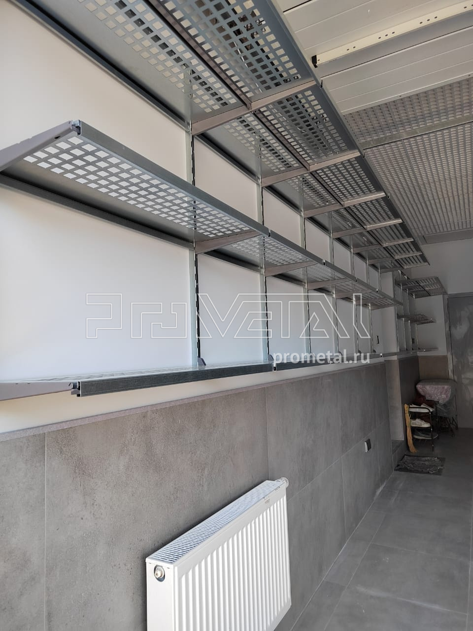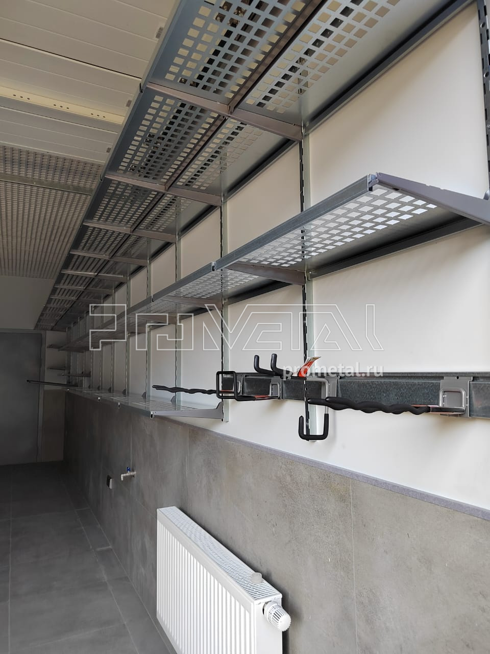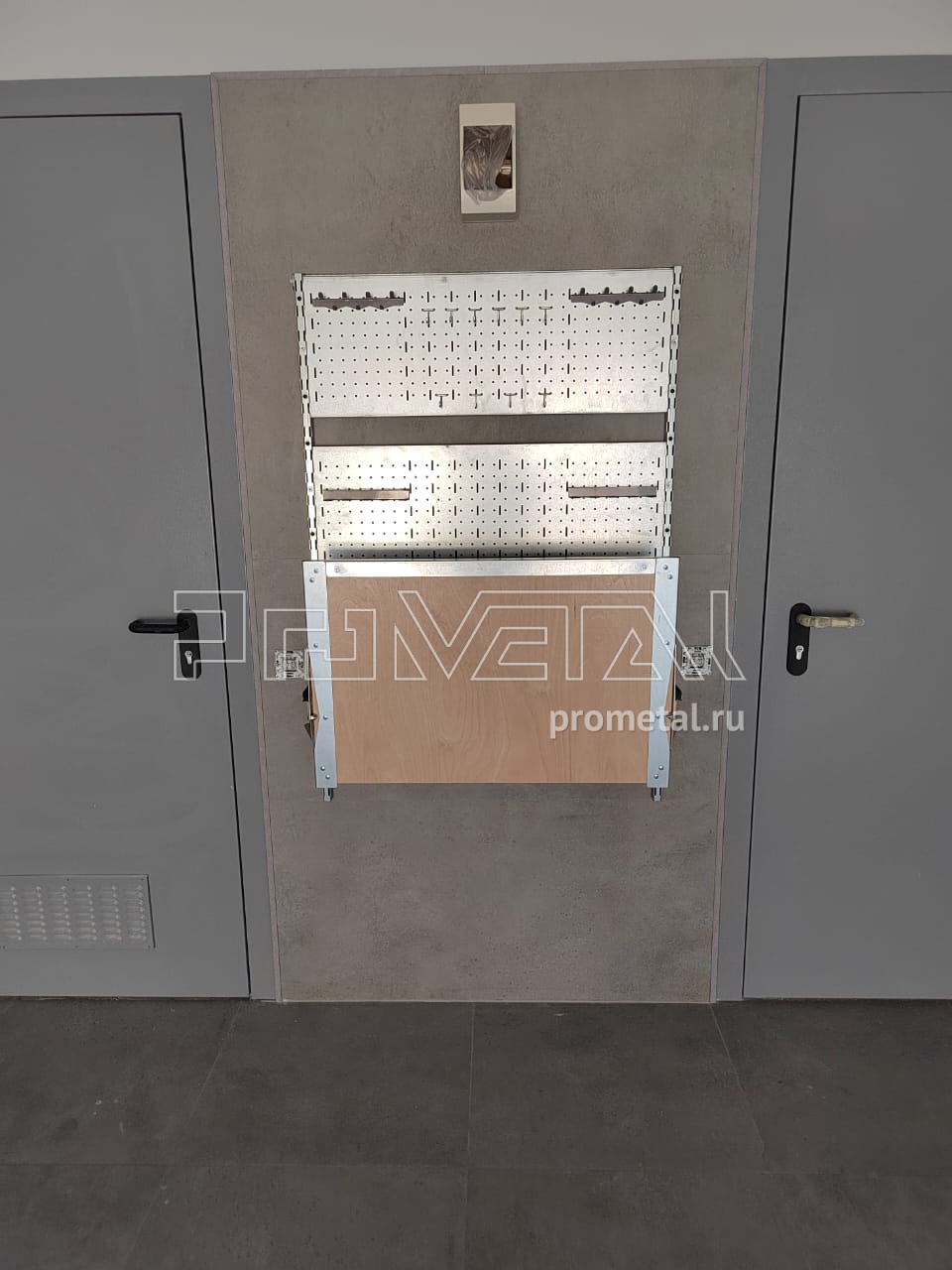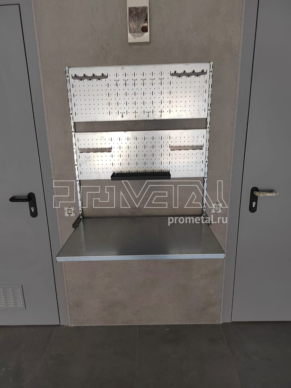 По центральной стене размещен откидной стол-верстак шириной 80 см (с оцинкованной поверхностью). Над верстаком установлены перфопанели для размещения инструментов. Такой верстак идеально подходит для тех, кто иногда нуждается в рабочем месте.