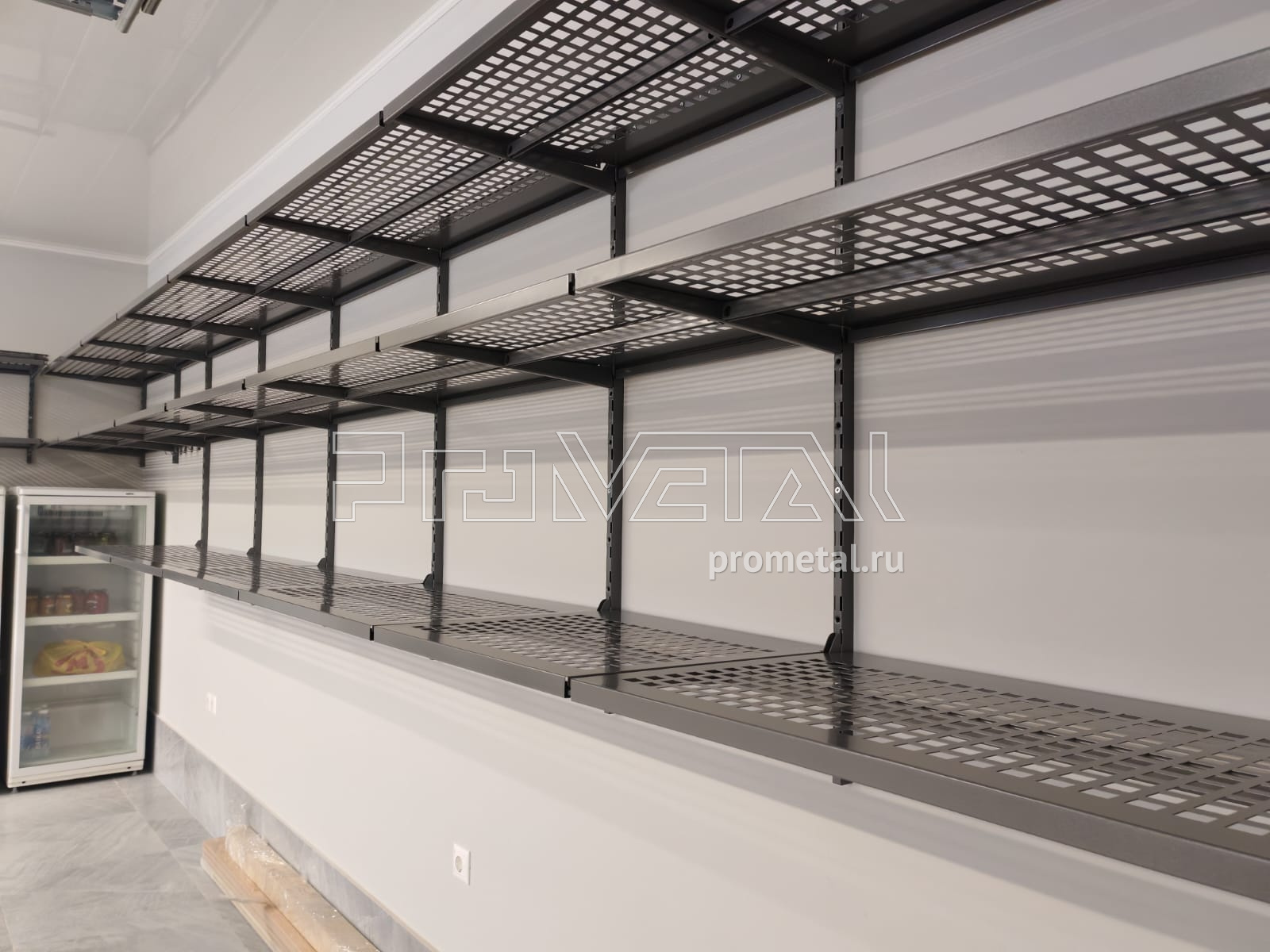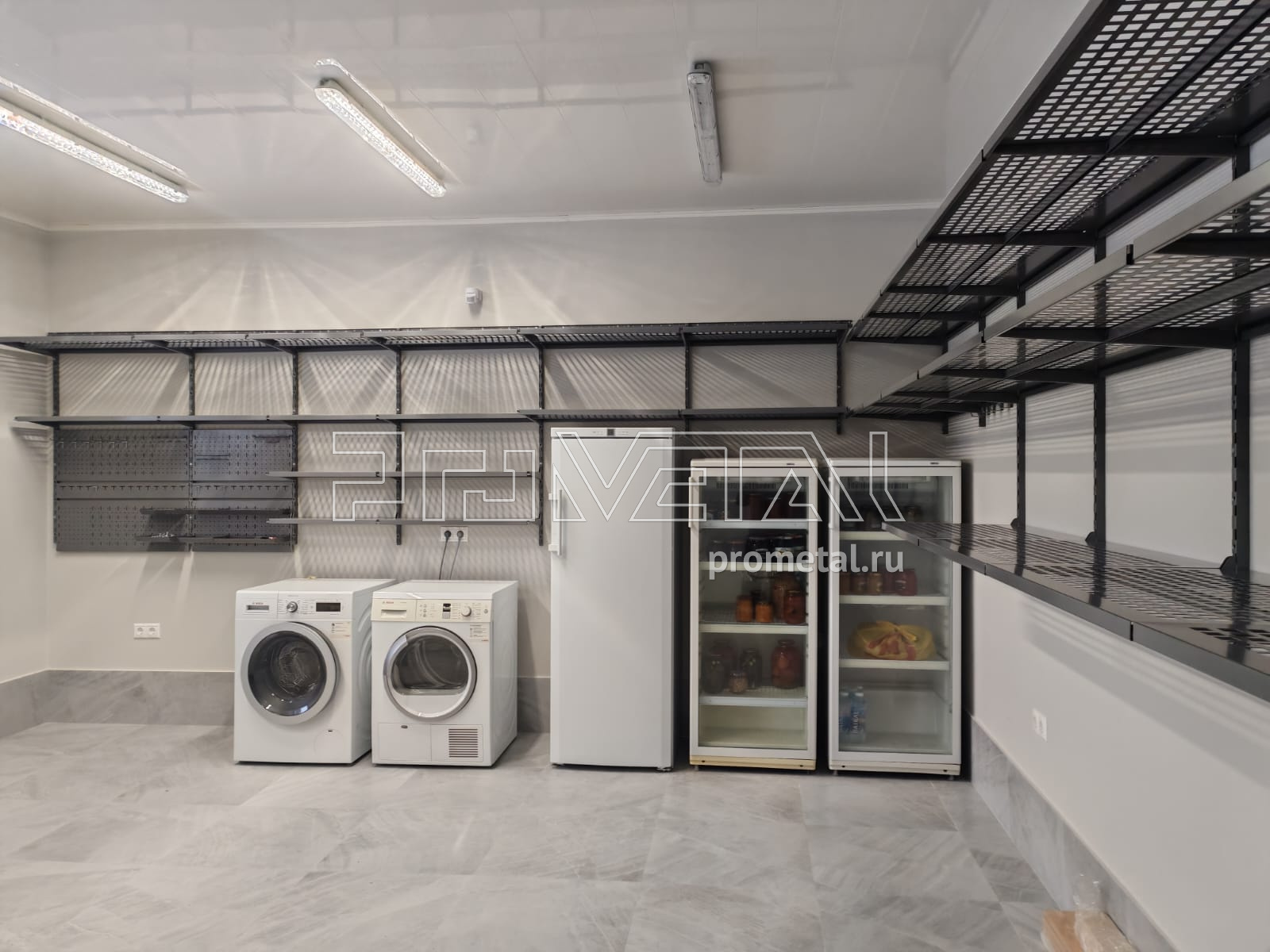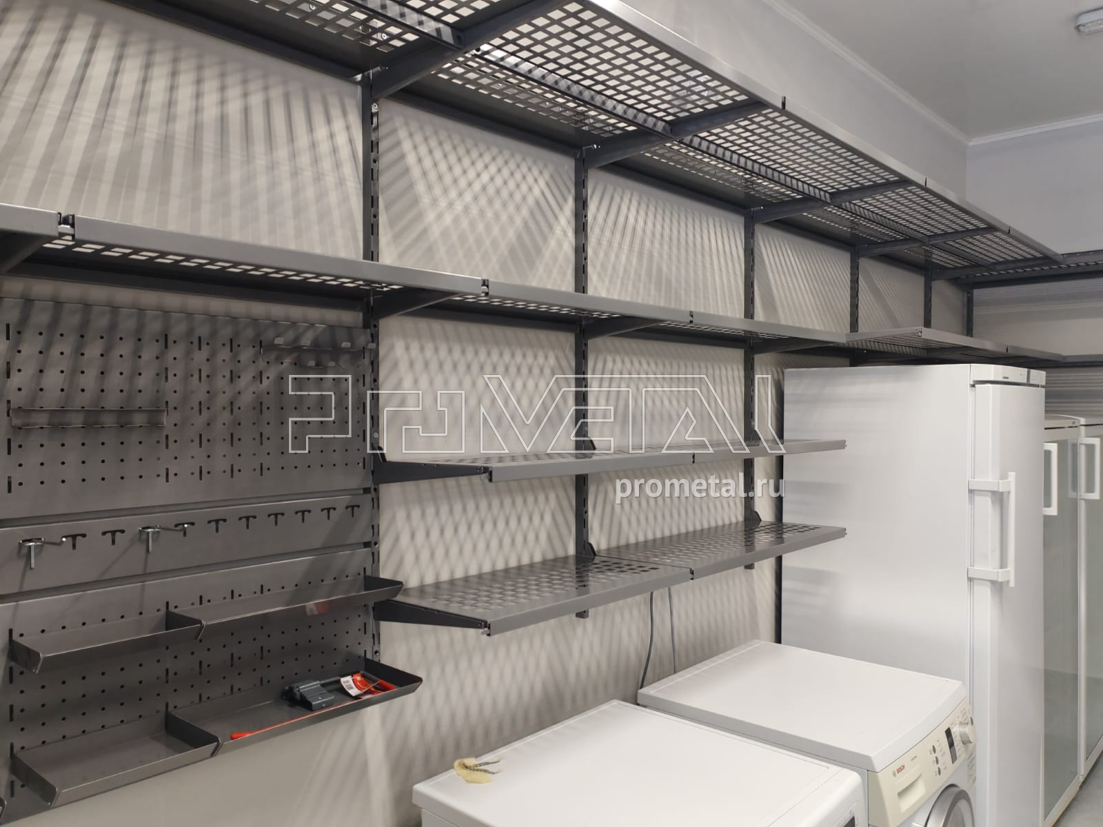Продуманная геометрия хранения: Чтобы максимально использовать пространство, полки спроектировали разной глубины, учитывая особенности помещения. Например, над морозильными камерами установили широкие полки, создав единую визуальную линию. Перфорация полок обеспечивает достаточную освещённость и визуальную лёгкость конструкции.