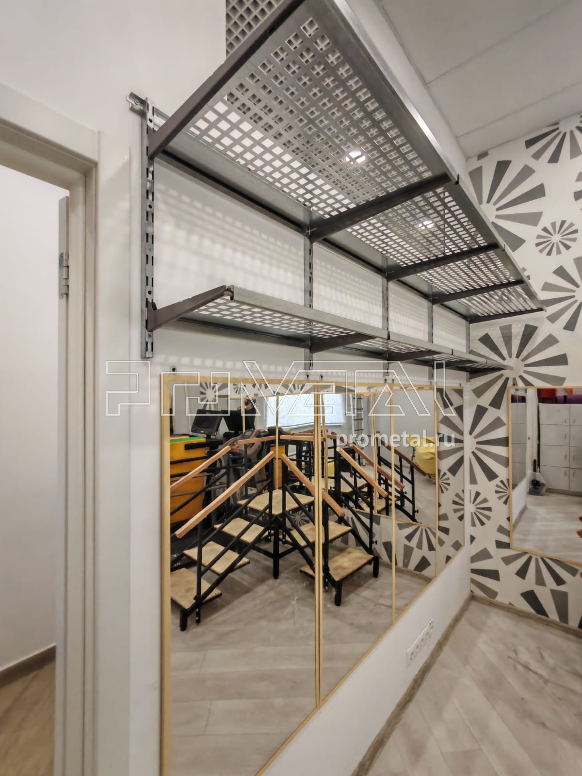 Это вторая наша работа для них. И на этот раз мы установили удобные полки для хранения инвентаря. Помещение светлое и приятное, полки выбрали с перфорацией - для поддержания лёгкости восприятия пространства и удобства - снизу видно, что хранится наверху. Всего установили 2 ряда полок шириной 520 и 315 мм.