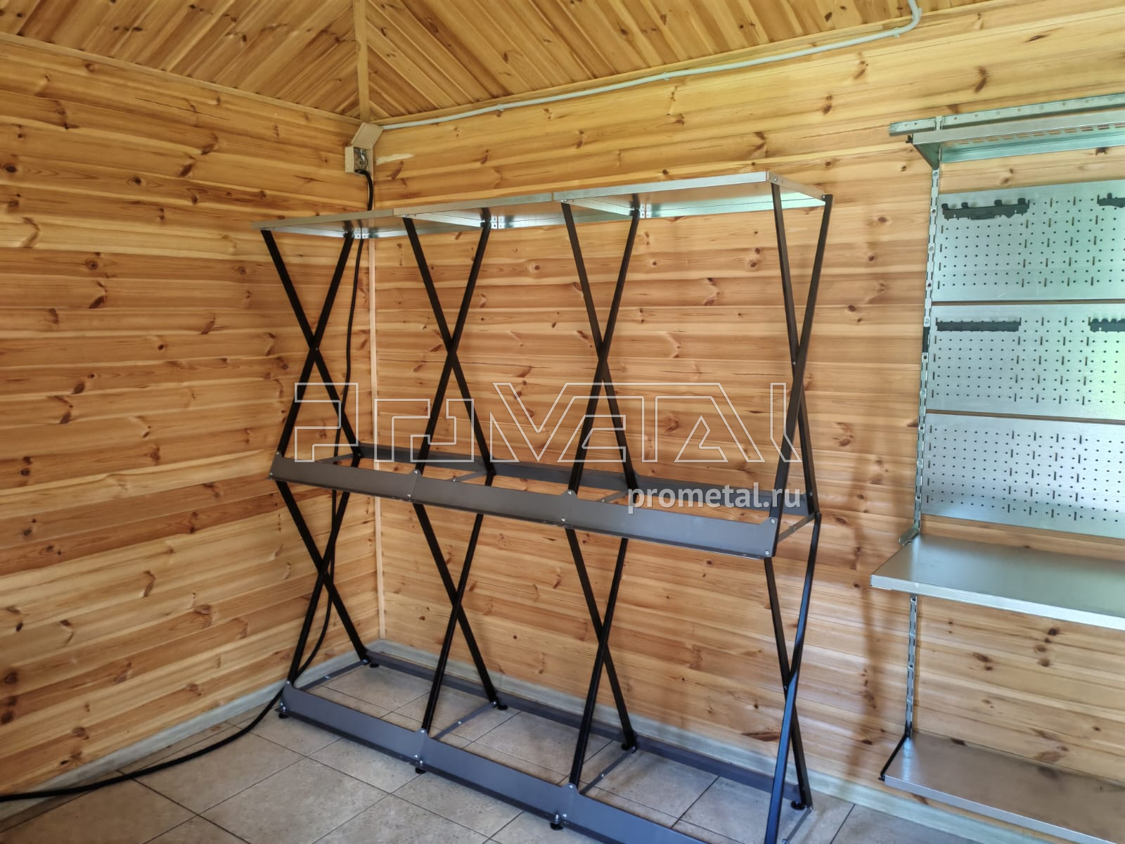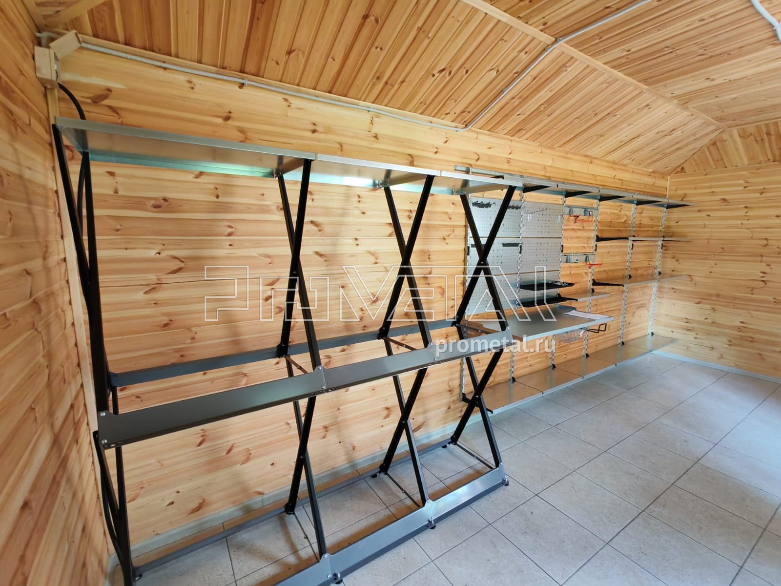 • Для шин: передвижная стойка, где легко поместятся 3 комплекта колес. Сверху — антресольная полка для вещей, которые используются редко.