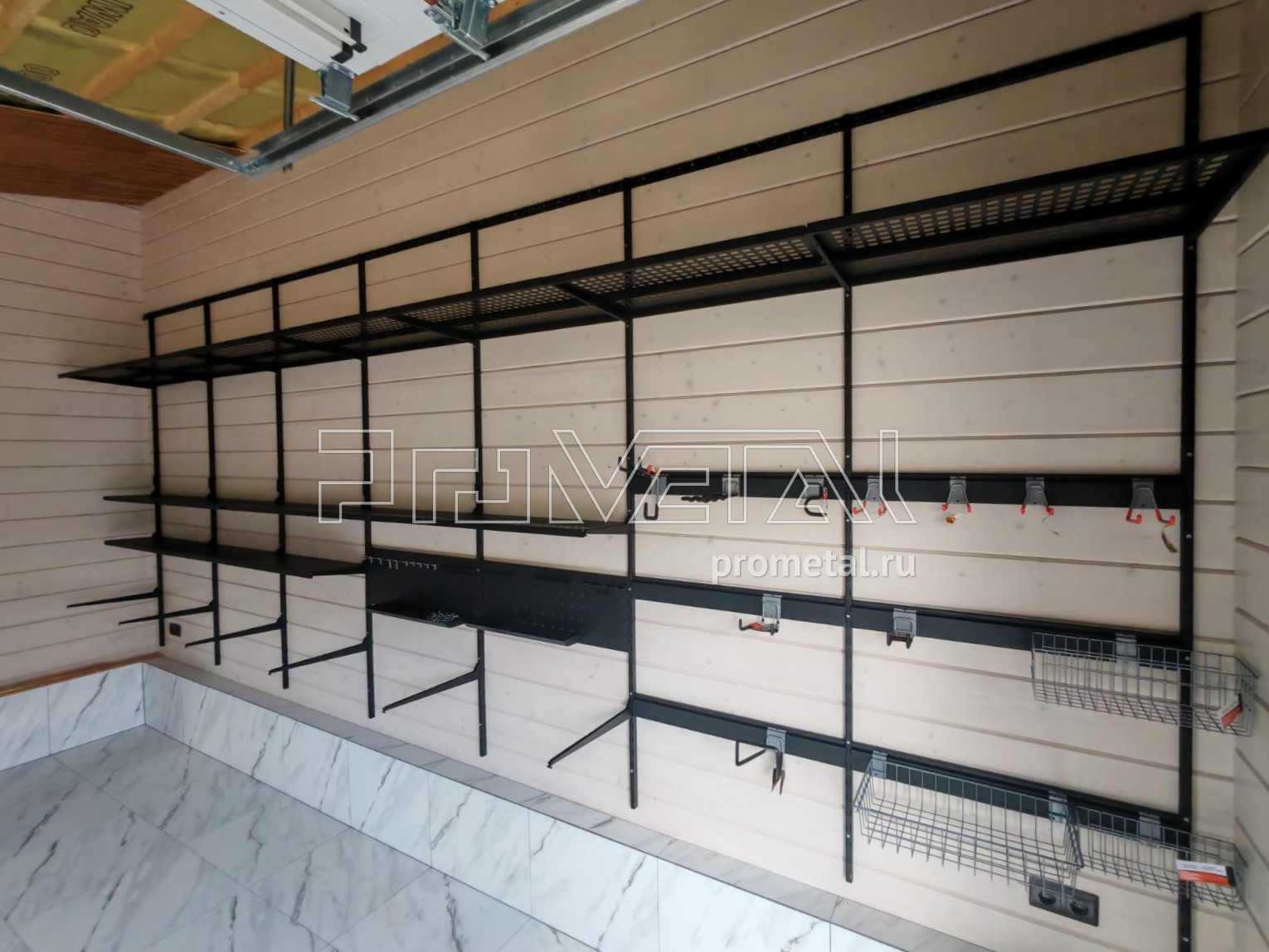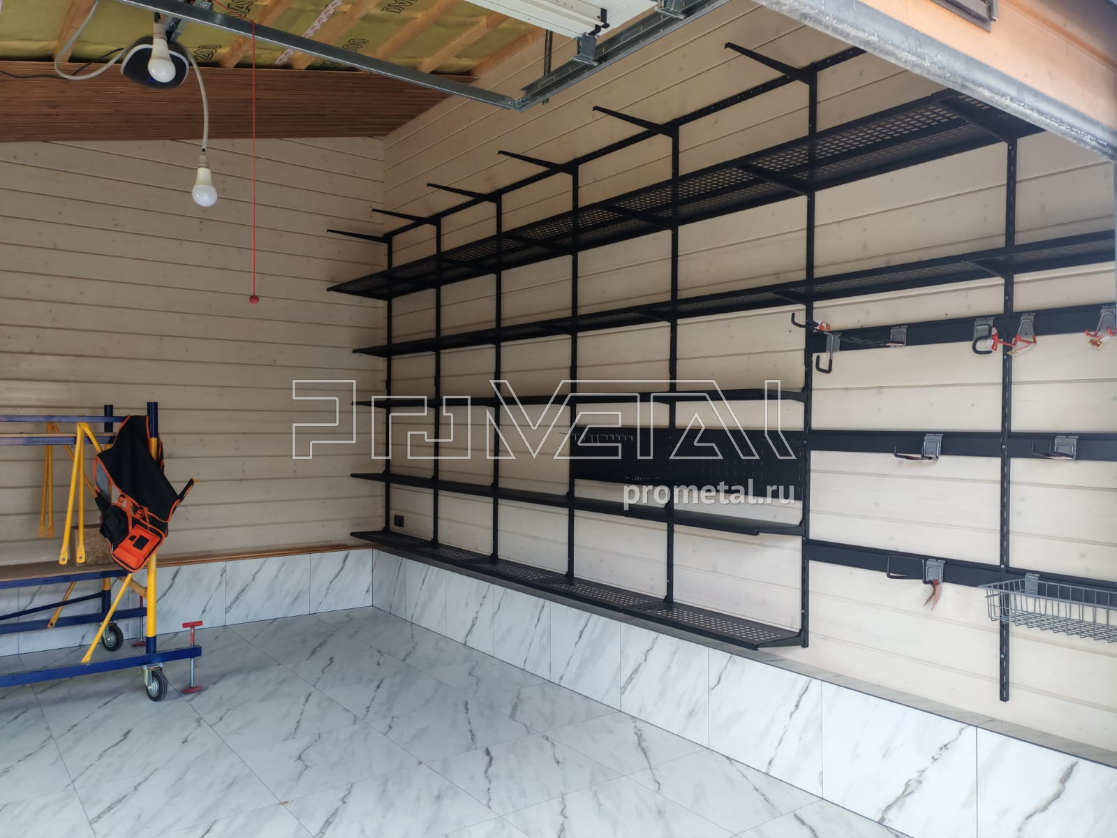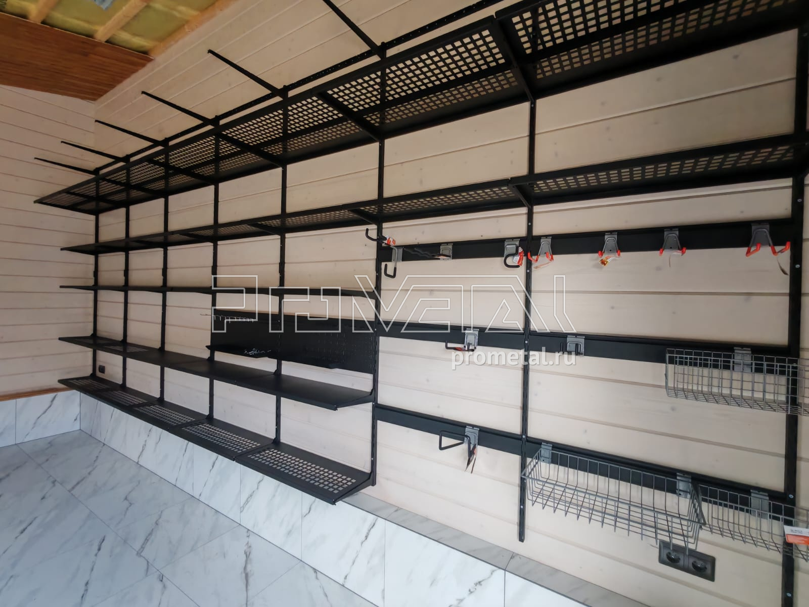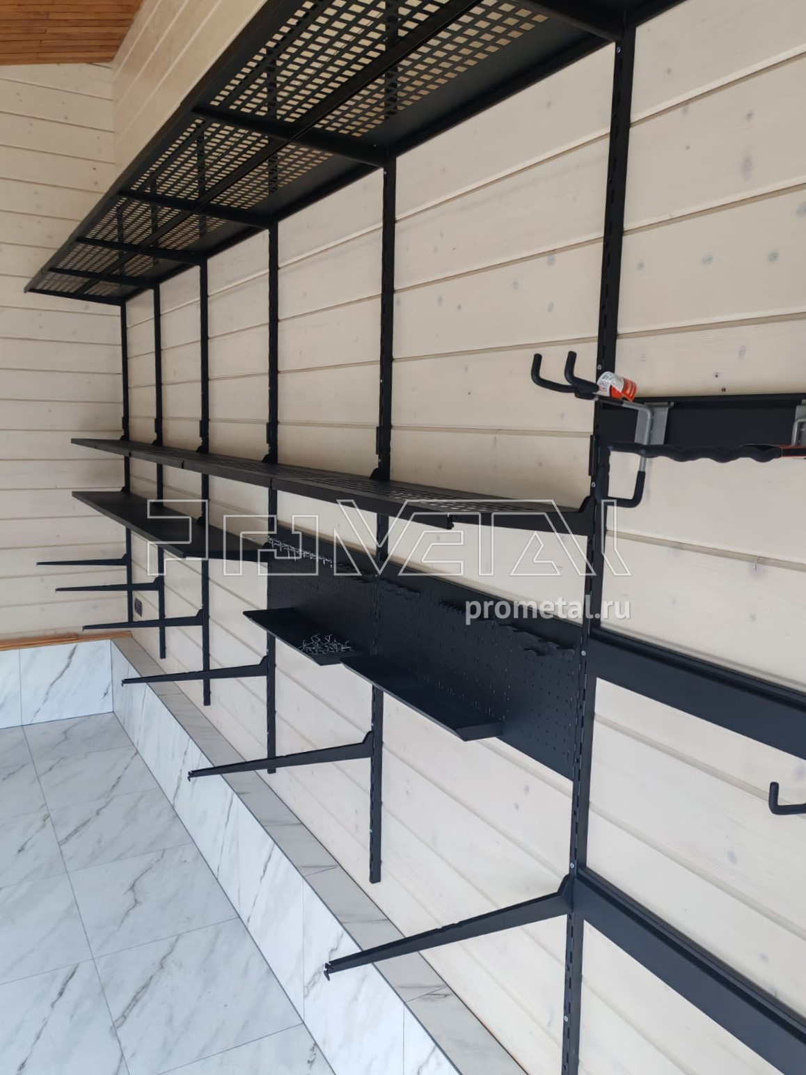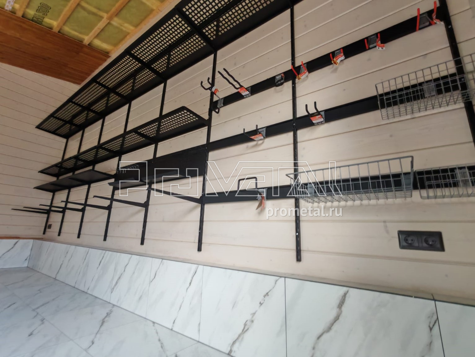 • Рейлинги с S-образными крюками: Установлены для удобного размещения часто используемого инвентаря. Их стратегическое расположение в непосредственной близости от ворот гарантирует оперативный доступ к необходимым предметам.
