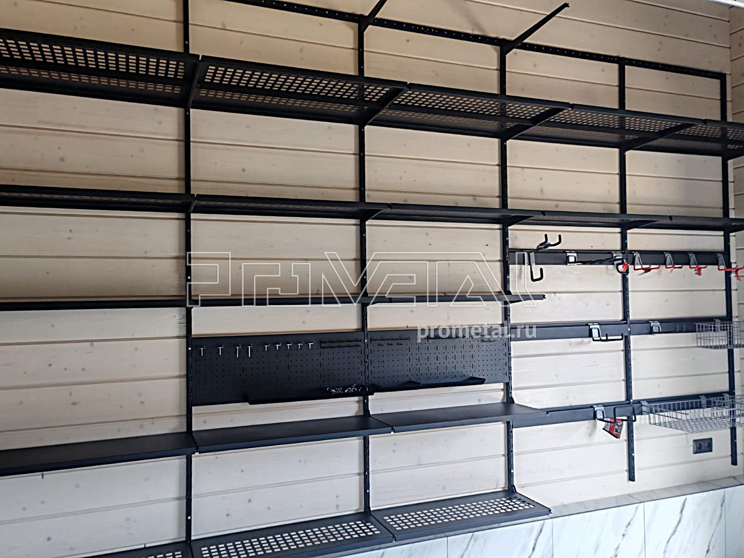 • Система перфопанелей: Предназначена для систематизированного хранения мелких предметов, инструментов и расходных материалов с помощью специализированных крючков, подвесов и лотков, обеспечивая быстрый визуальный доступ и порядок.