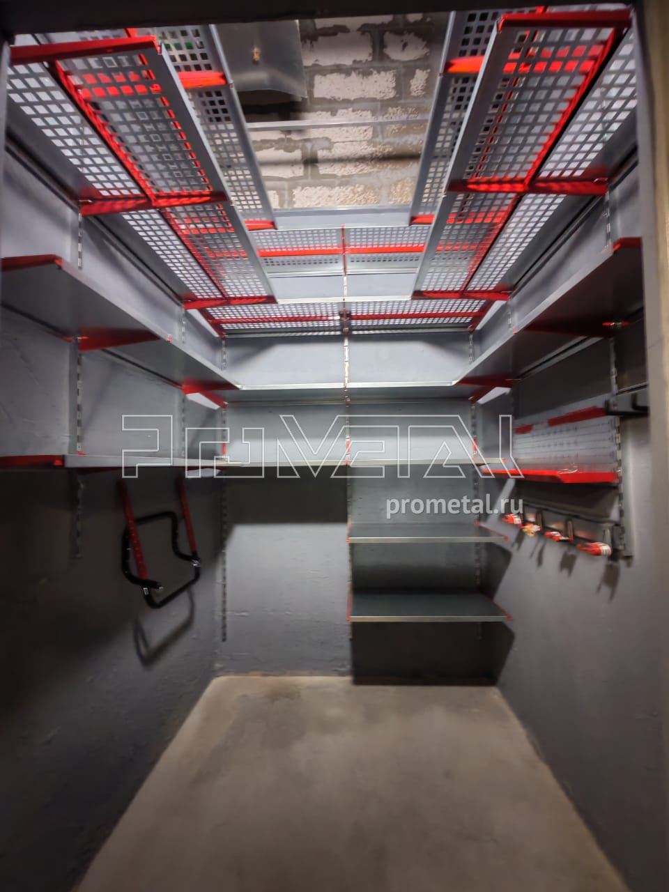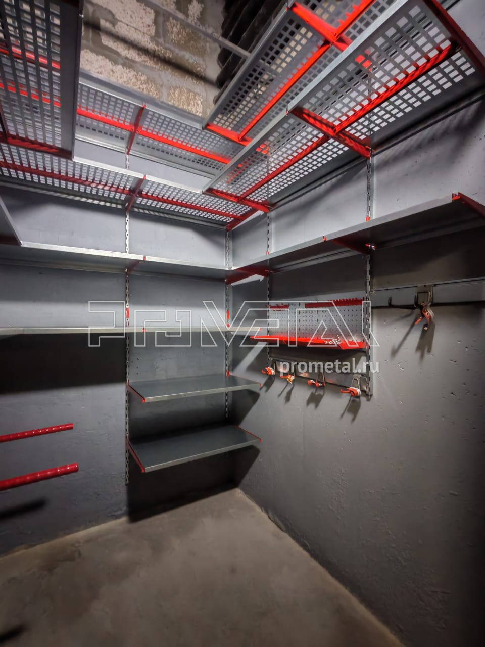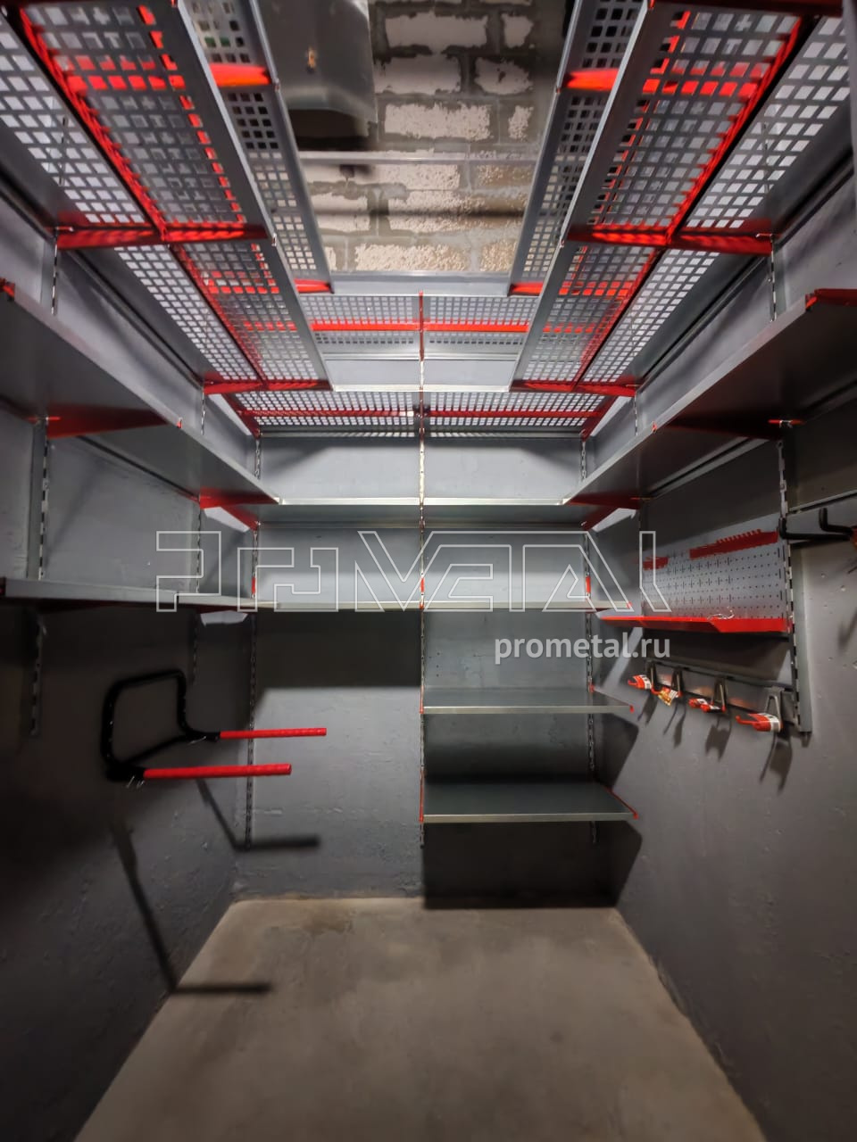Выше головы и по центральной стене установили полки с перфорацией 520 мм, усилили рёбрами жёсткости. На уровне роста - более узкие полки, 315 мм, чтобы было комфортно находиться. Нижние ряды полок уже цельные.