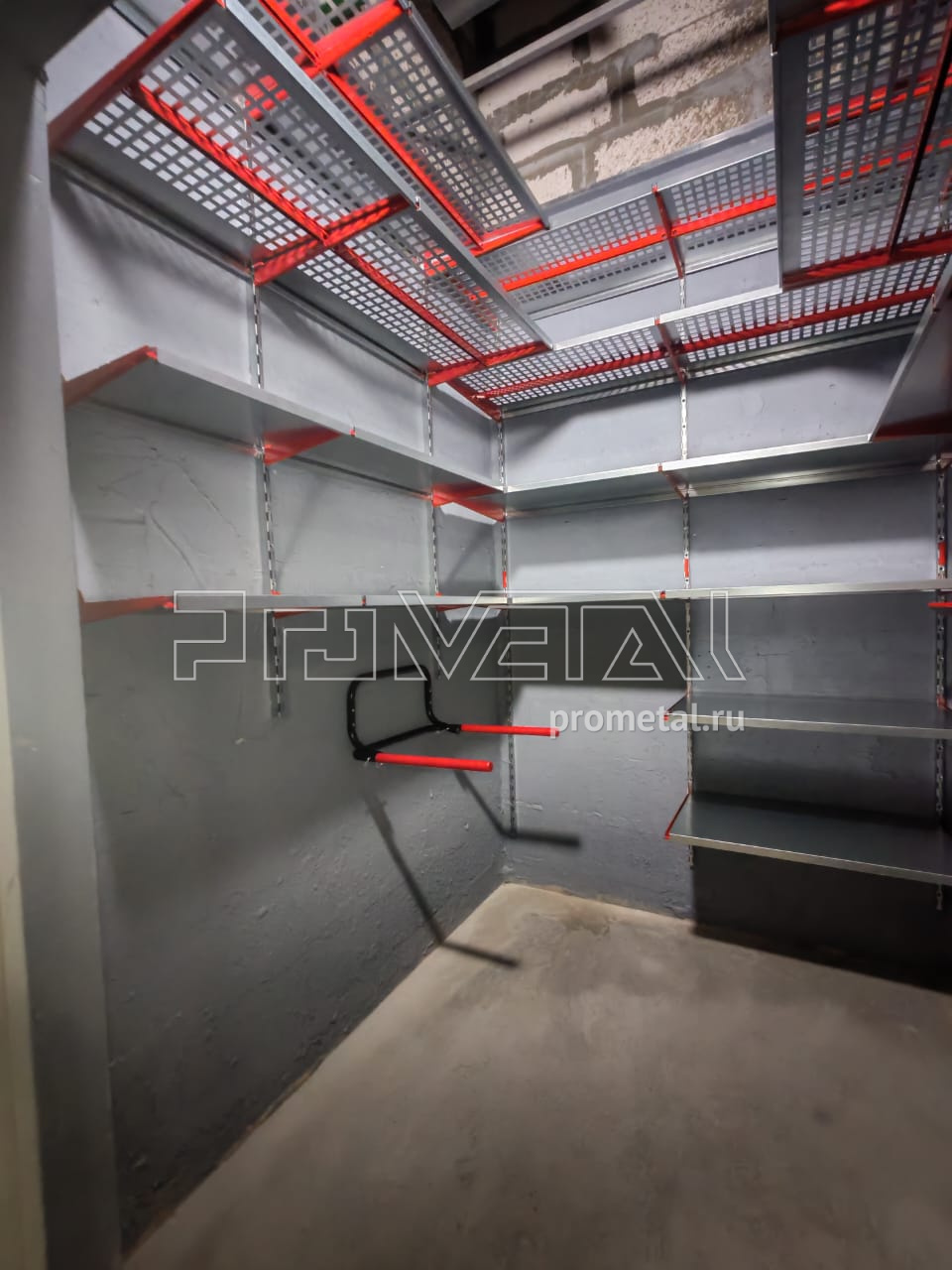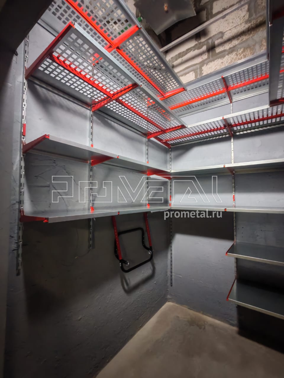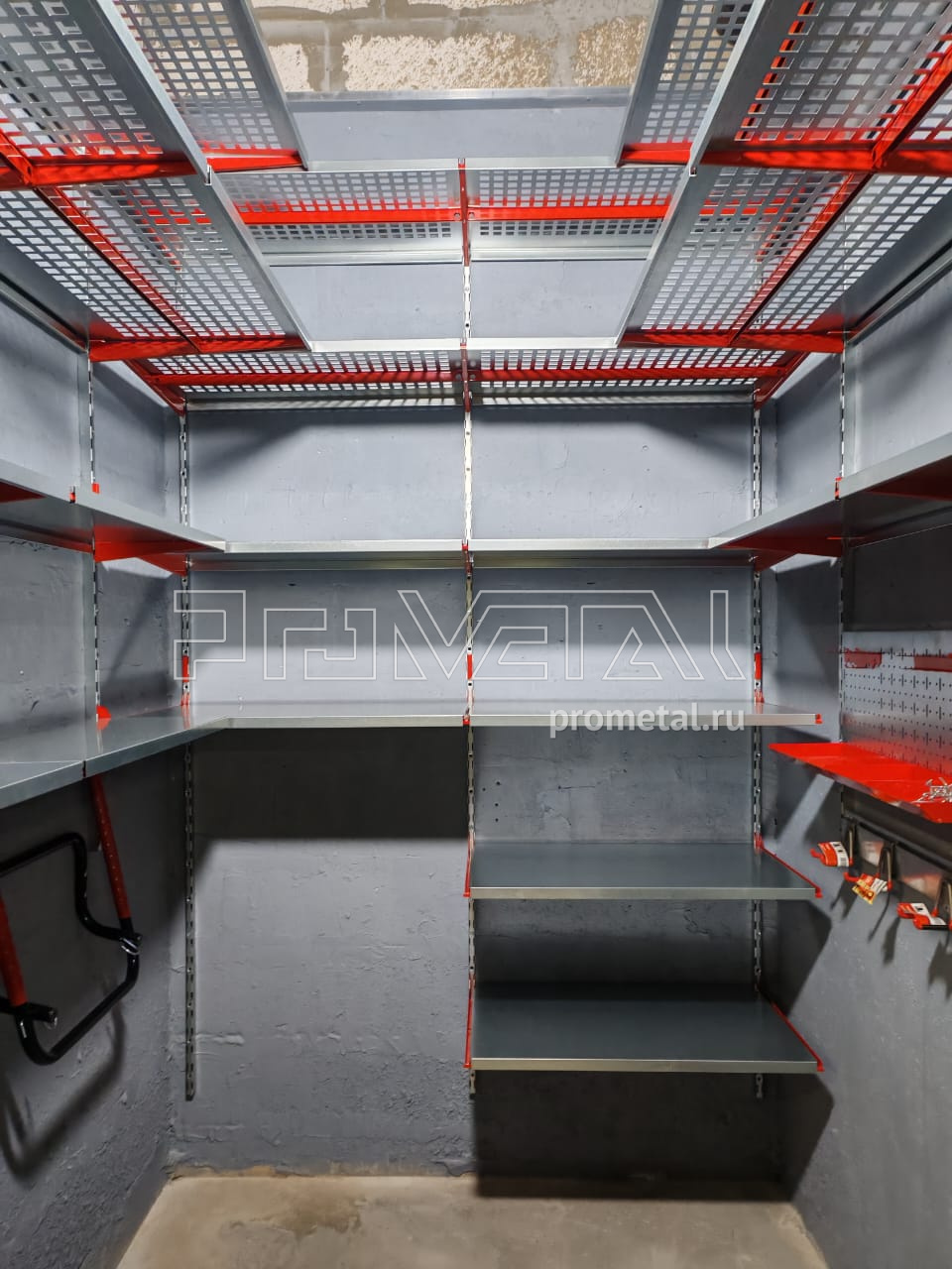 Выше головы и по центральной стене установили полки с перфорацией 520 мм, усилили рёбрами жёсткости. На уровне роста - более узкие полки, 315 мм, чтобы было комфортно находиться. Нижние ряды полок уже цельные.