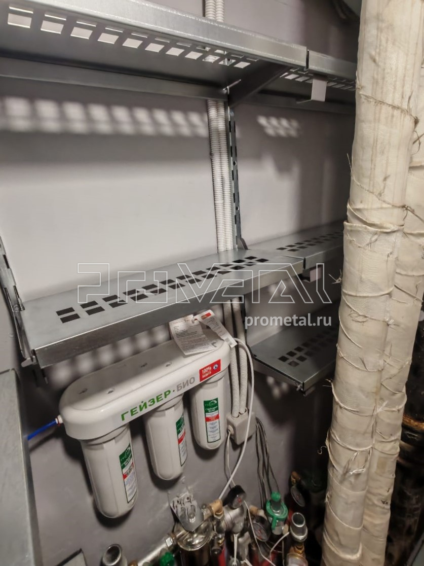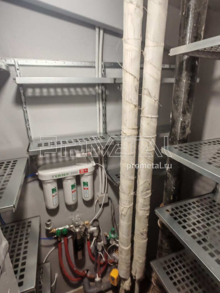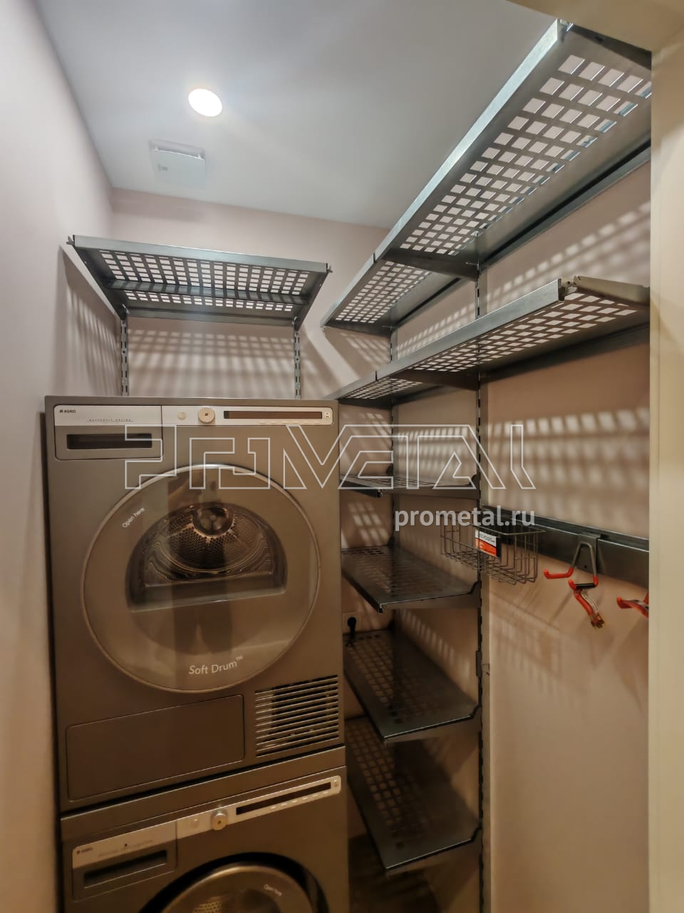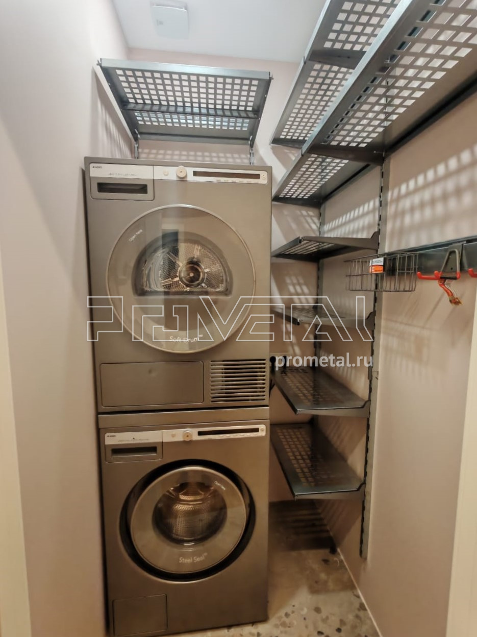 На металлических полках в постирочной удобно хранить как белье, так и средства для стирки. Серый цвет конструкции отлично сочетается с цветом стиральной и сушильной машин.