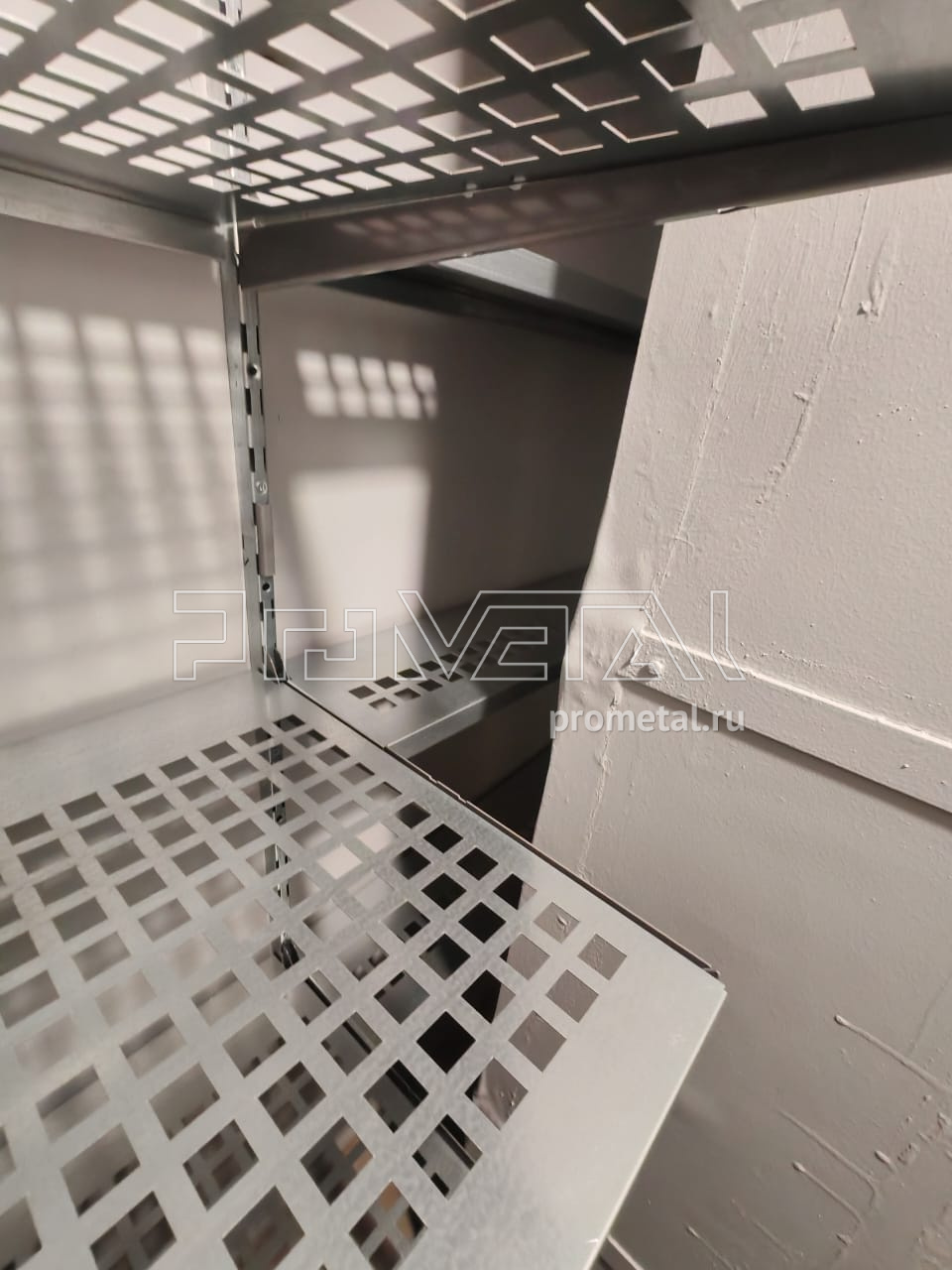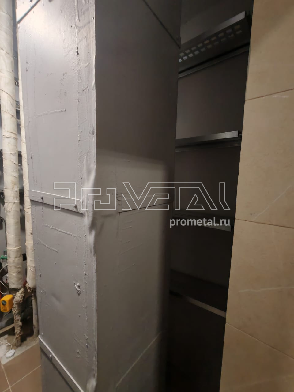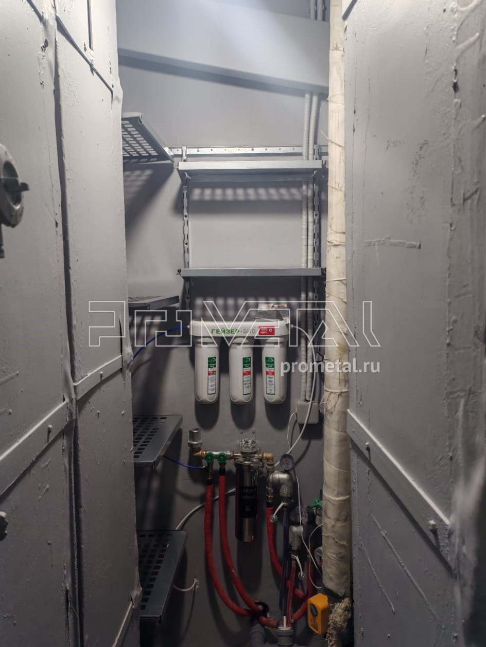На металлических полках в постирочной удобно хранить как белье, так и средства для стирки. Серый цвет конструкции отлично сочетается с цветом стиральной и сушильной машин.