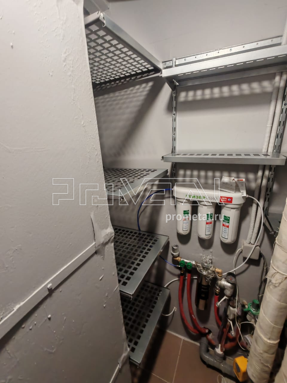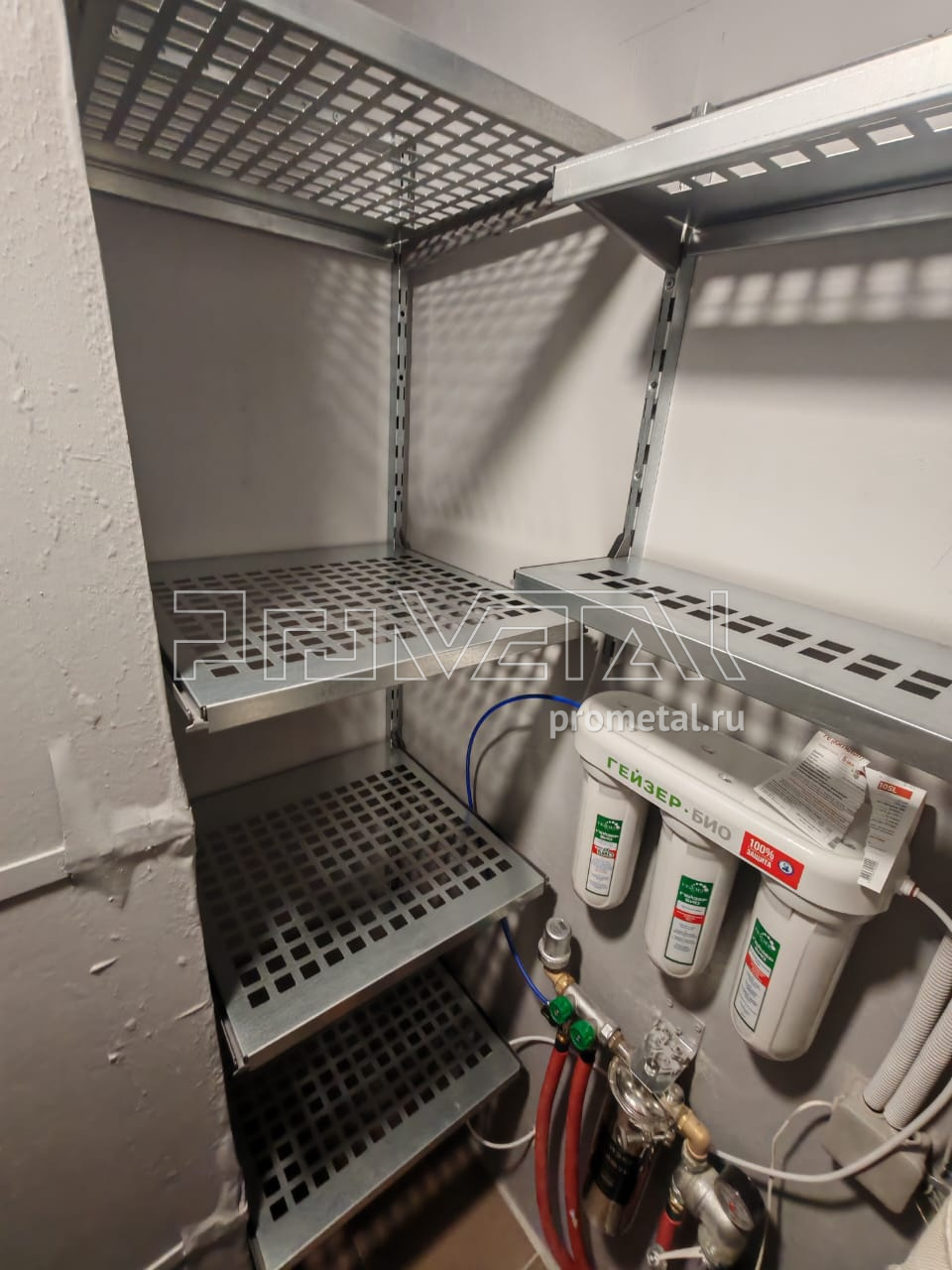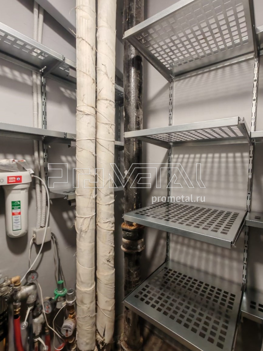 Удобное кладовка с функцией прачечной - и мы комплексно обустроили ее стеллажной навесной системой хранения, состоящей из металлических полок, корзинок и подвесов. Полки - с перфорацией, свет свободно проникает на нижние ряды.