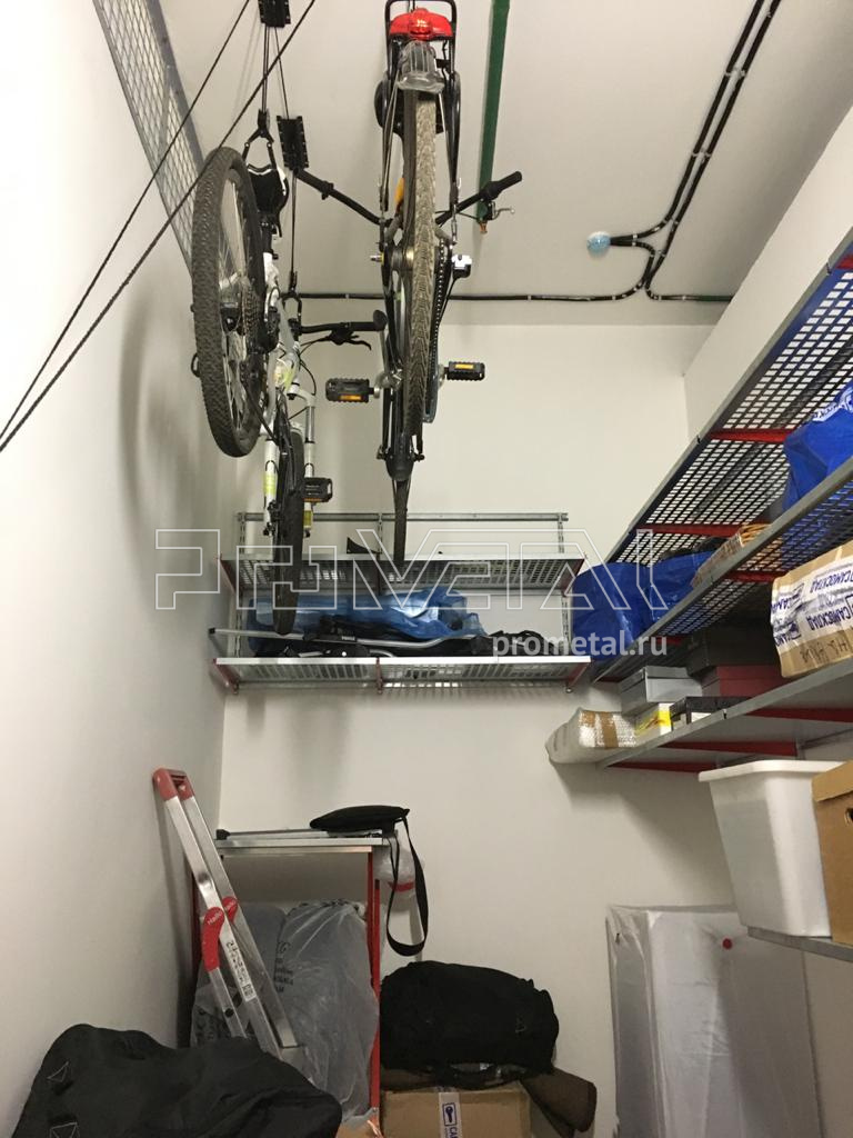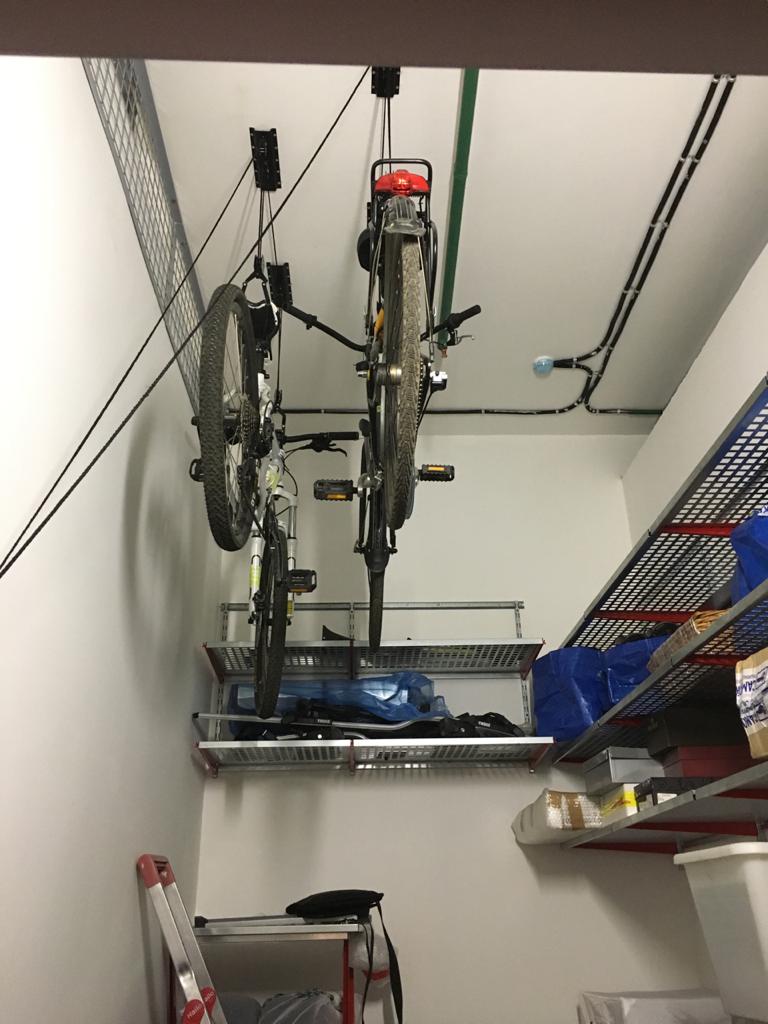 От Андрея поступил запрос оборудовать очень узкую кладовую, причем разместить в ней 2 велосипеда. Если размещать велосипеды на стенах, потеряем драгоценное пространство. Приняли решение размещать велосипеды на потолке (мы и так можем :)) - для этого у нас есть специальный подъемник для велосипеда, тем самым сохранили пространства на стенах для размещения там полок! Андрей остался очень доволен проектом!