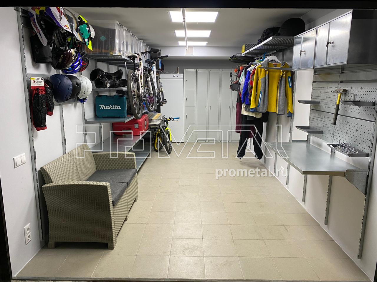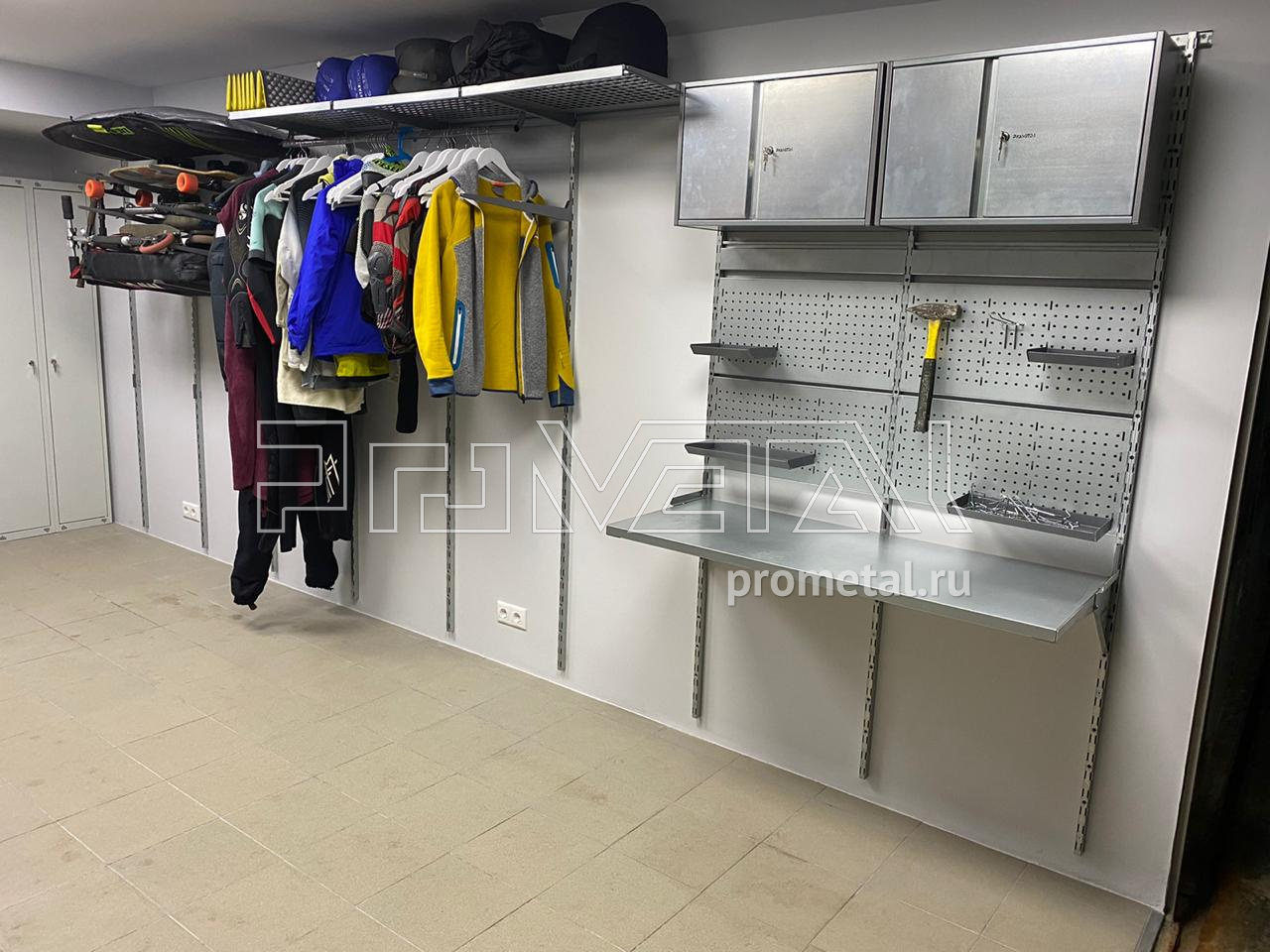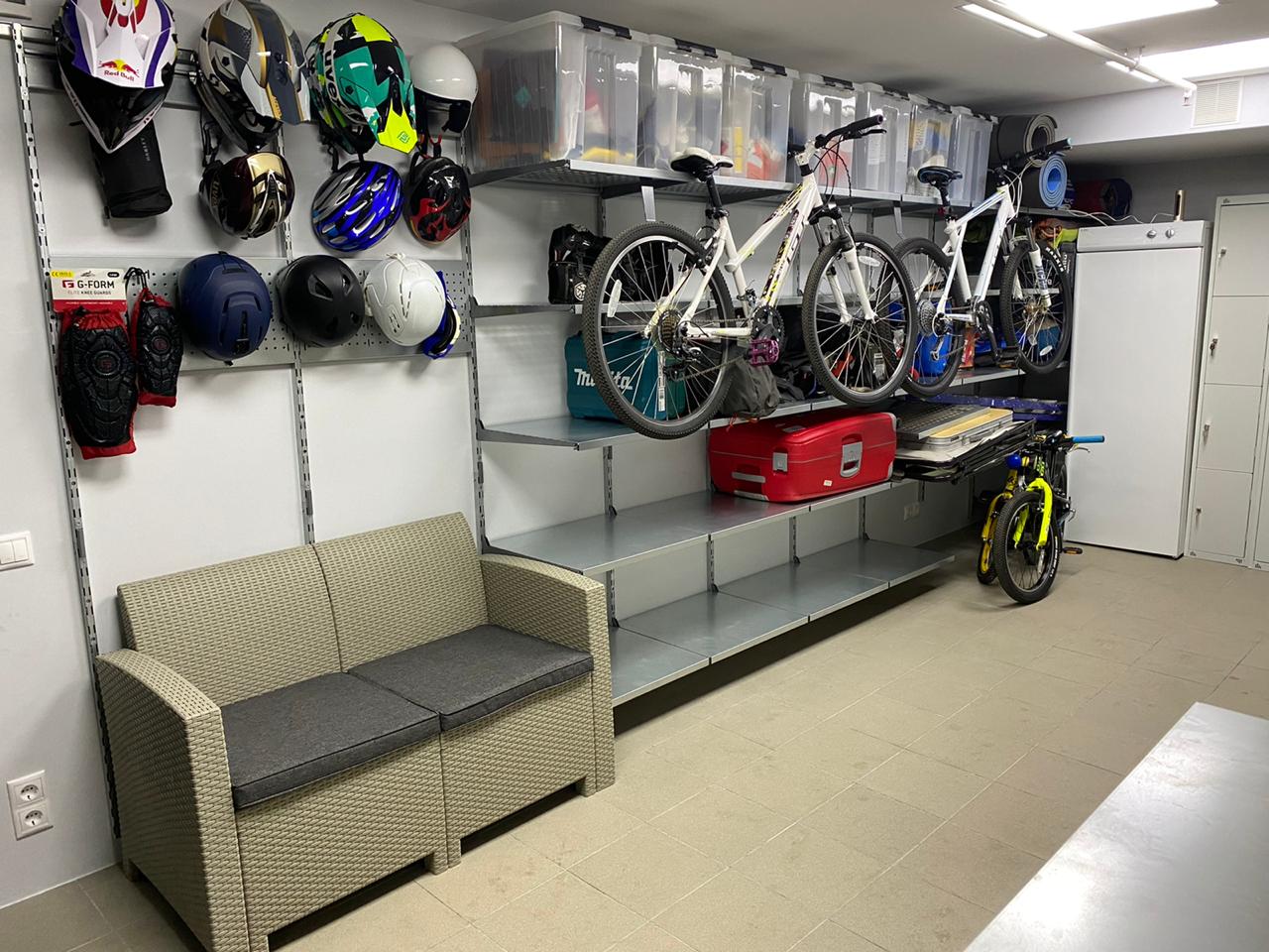 Гараж в Москве, в районе станции метро Киевская! Обустроили гаражный бокс для Андрея! У Андрея очень много спортивного инвентаря - доски, велики, шлемы и тд. Разместили все) Хватило места для небольшого верстака и диванчика! Хозяин очень доволен! В дальнейшем заказчик еще докупал крюки.