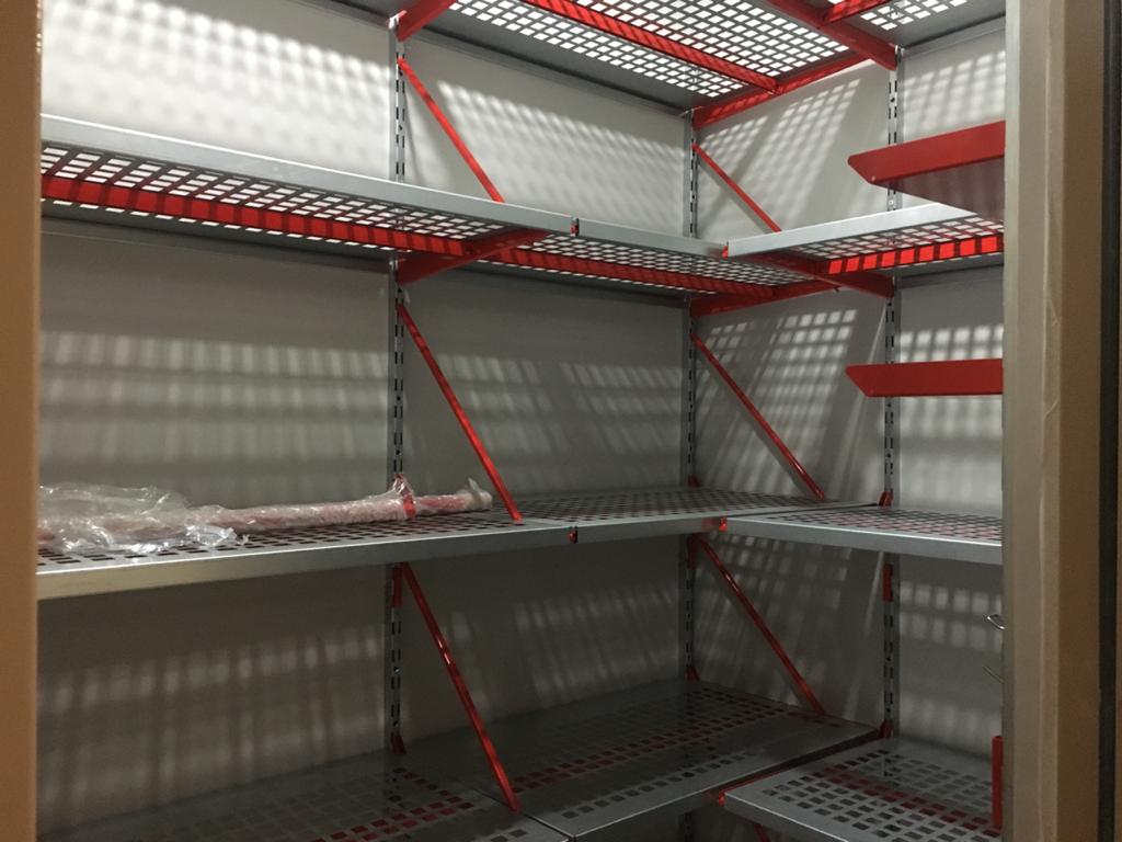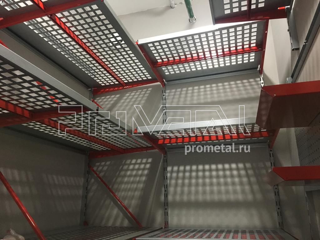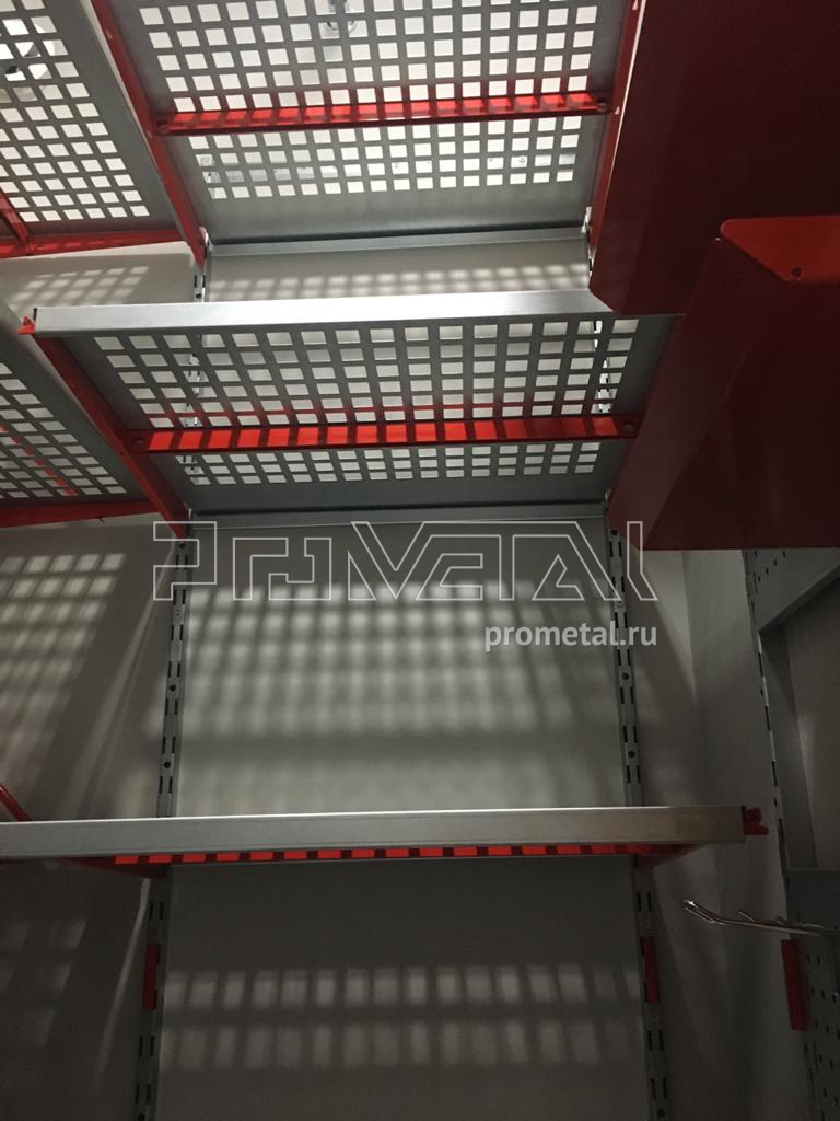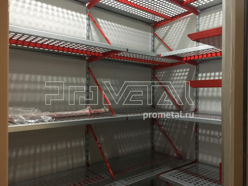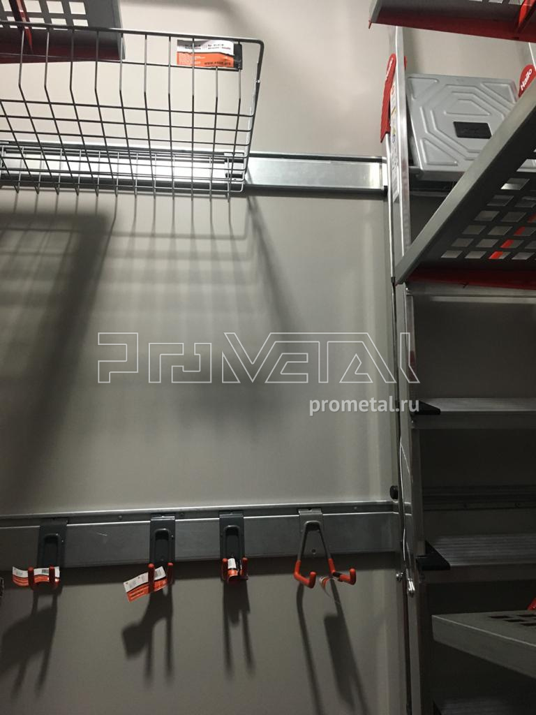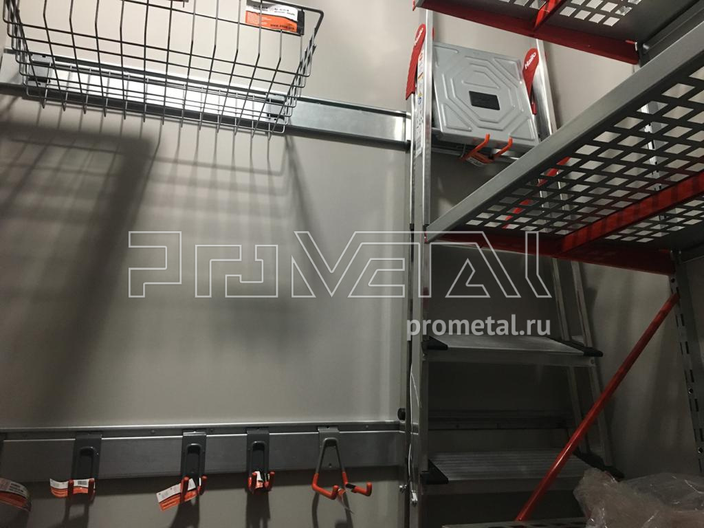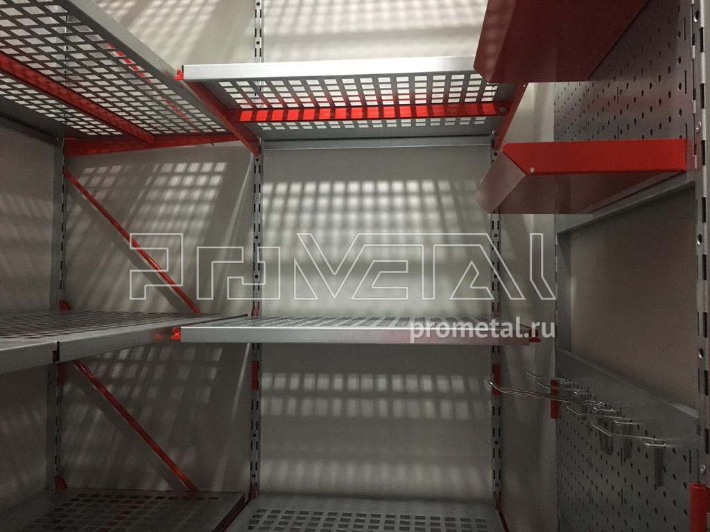 Серые полки с красными элементами (кронштейны, лотки) смотрятся стильно, подчеркивая строгость и стиль. Детальная функциональность для хранения любых вещей: от стремянки до шурупов и прочей мелочи.