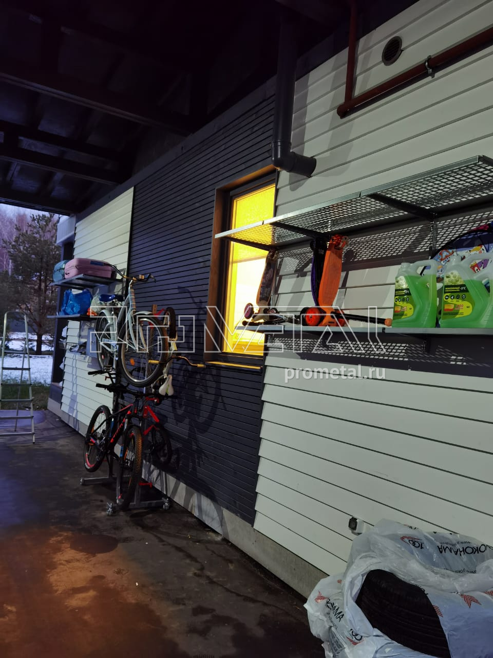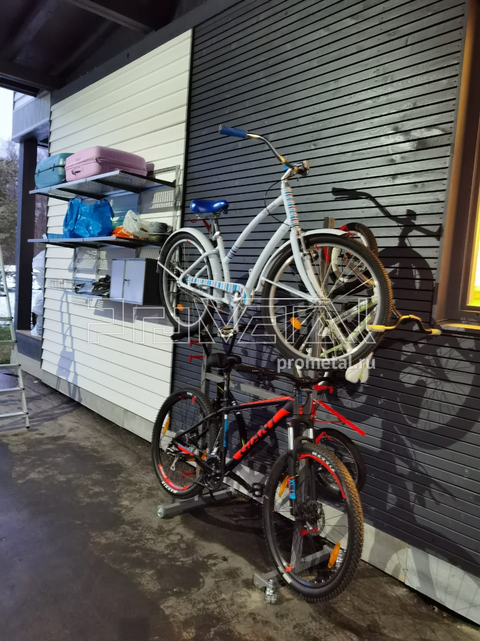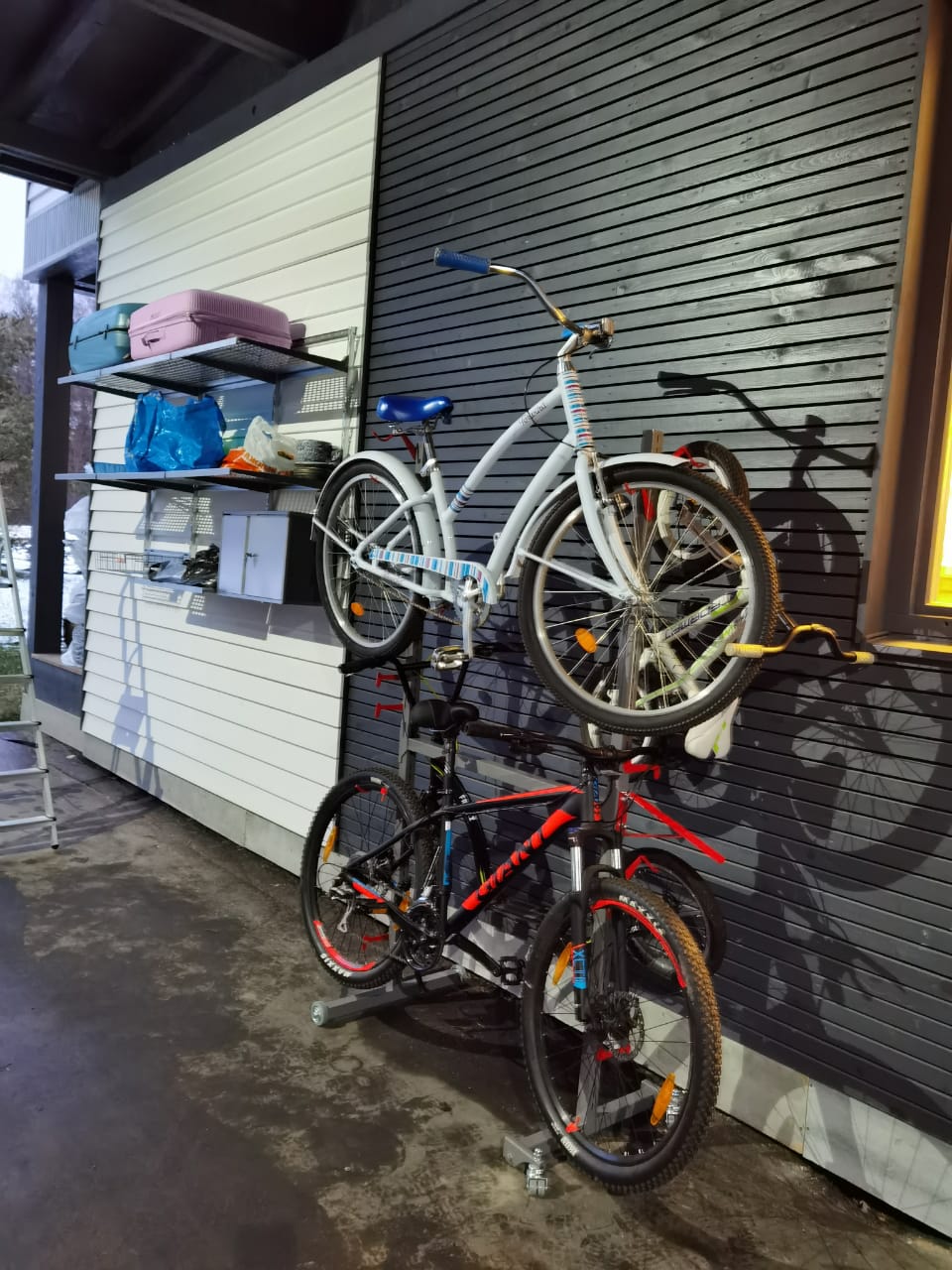 Эти фотографии нам прислала замечательная девушка Оля из Московской области! Вдохновилась примером соседей и решила обустроить для себя место под навесом у дома! Дистанционно разработали проект и отправили комплект ТК. Монтаж выполнялся силами заказчика. Разместили 4 велика и немного полок под чемоданы и прочие полезные вещи)