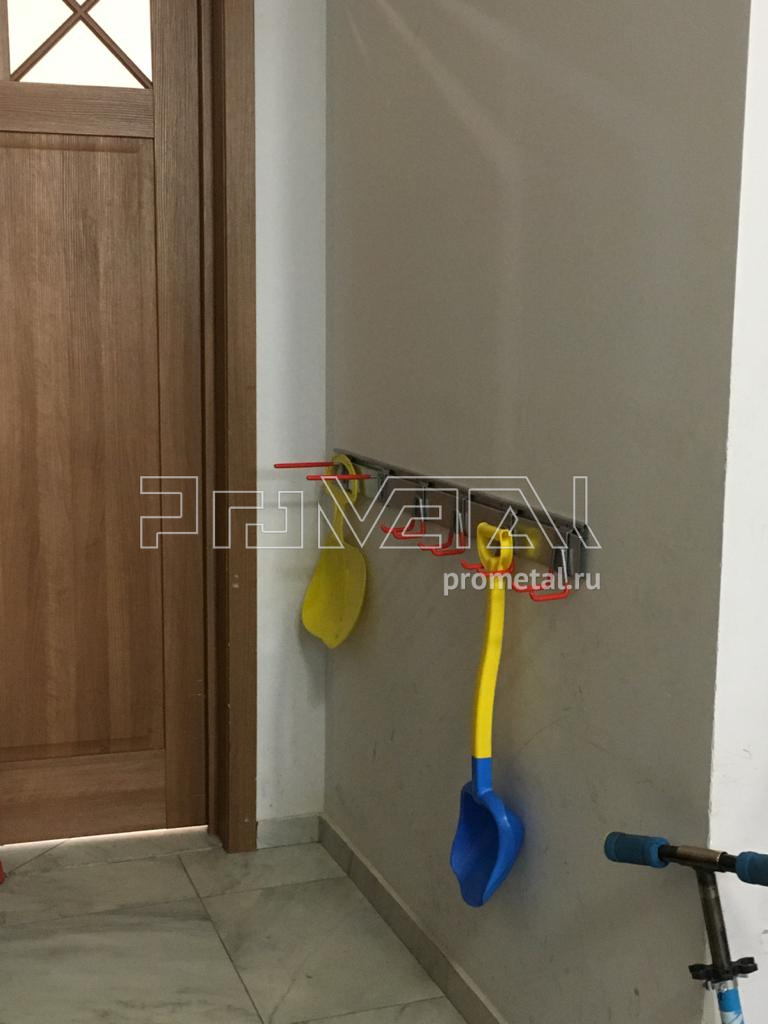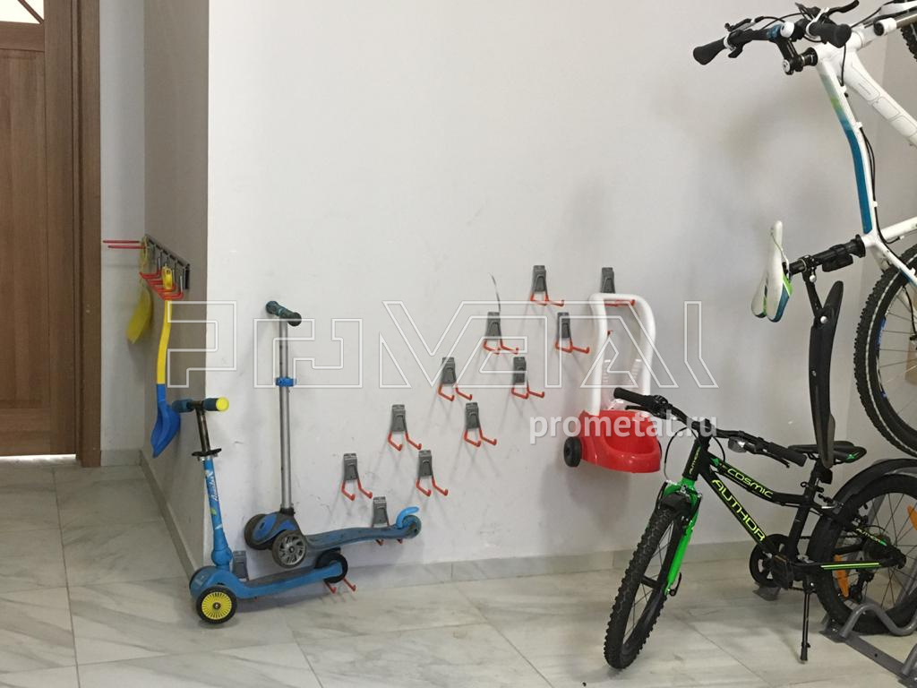 Колясочная рассчитана на хранение 21 велосипеда (10 велопарковок, 11 крюков на стену), 7 самокатов на крюках, хранение уличных игрушек, полки под тюбинг, свободный пол - для колясок. Высота монтажа крюков подбиралась исходя из велосипедов которыу там будут храниться, все велосипеды - детские, либо подростковые.