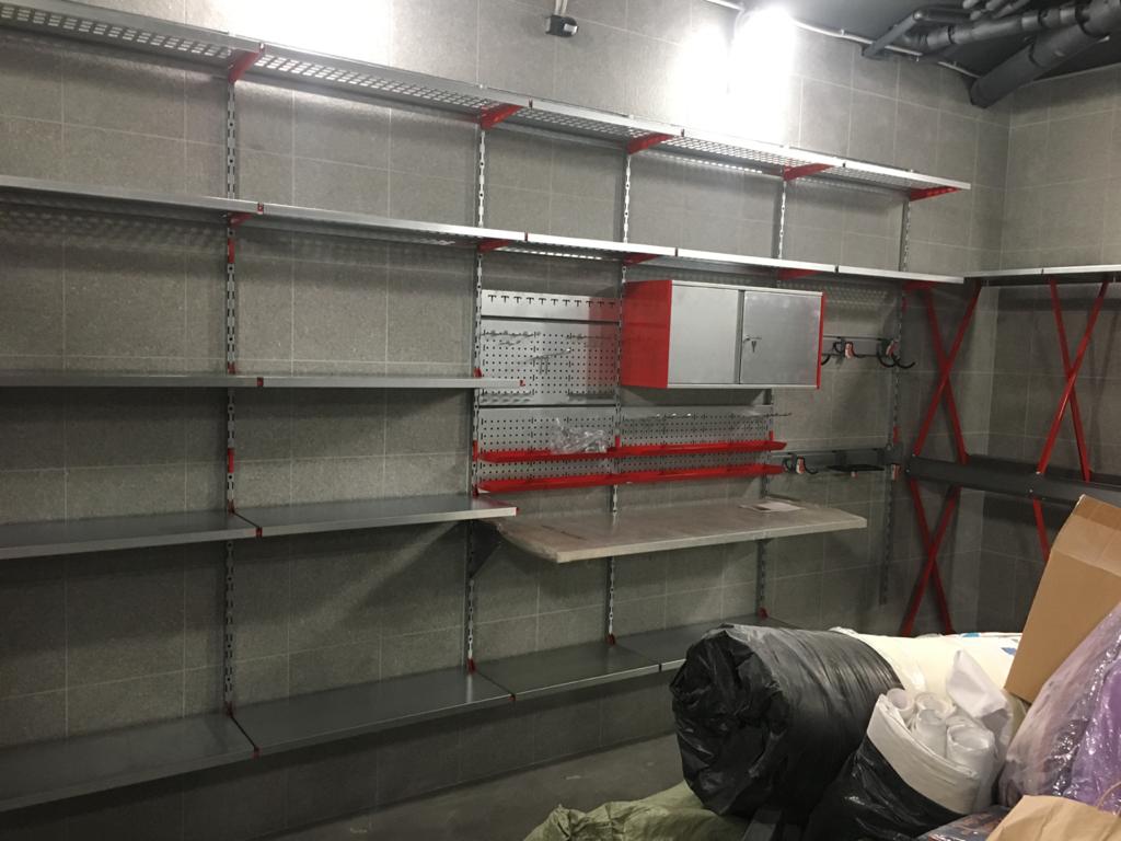 Предусмотрели рабочую зону с верстаком и перфопанелями, с крюками и держателями для инструментов.