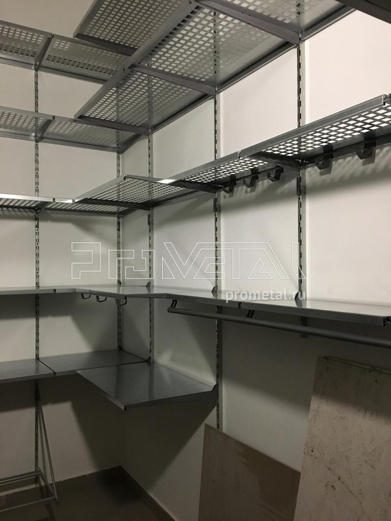 Пространство на стенах отдаем под полки, традиционно верхние полки с перфорацией, нижние - цельные. Для хранения сезонной верхней одежды предусматриваем штанги под плечики.
