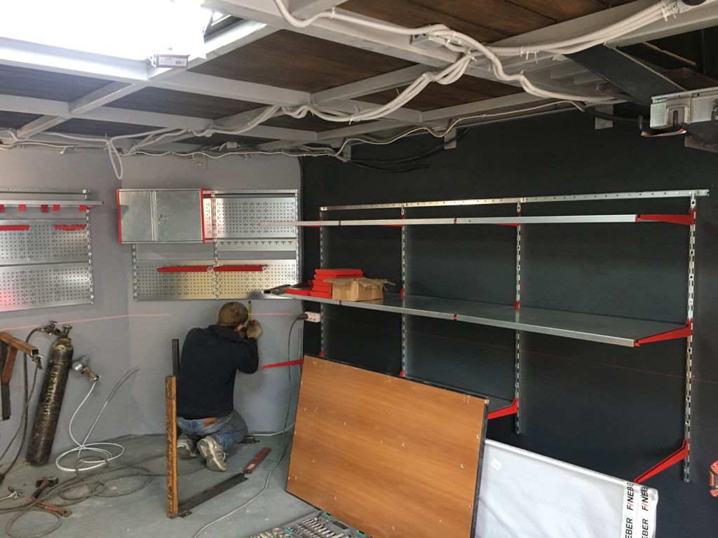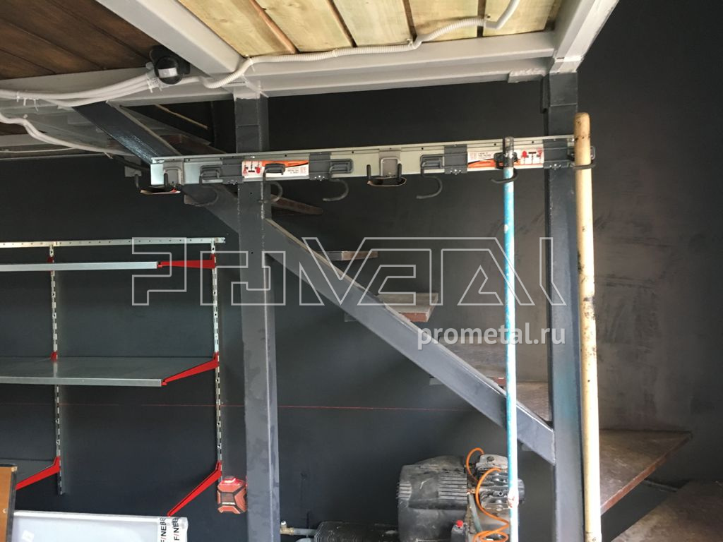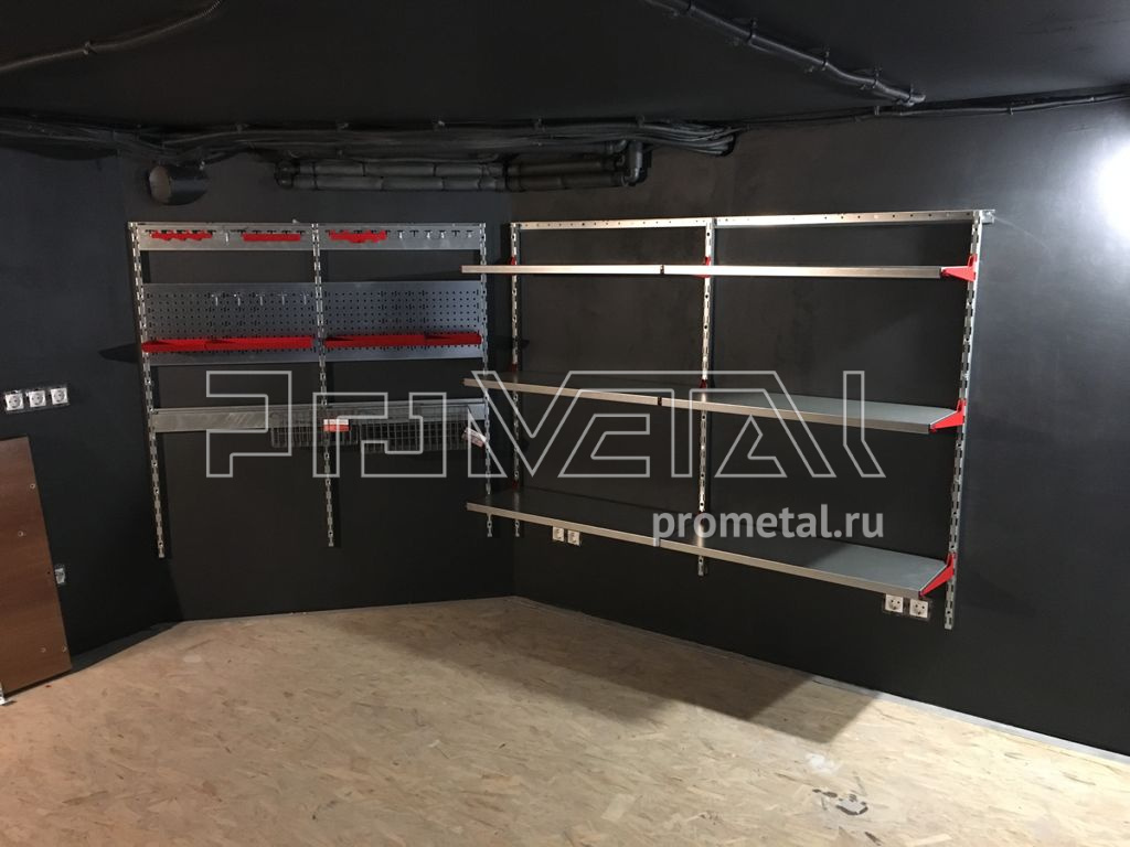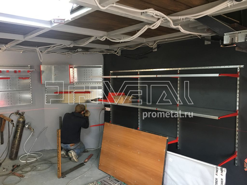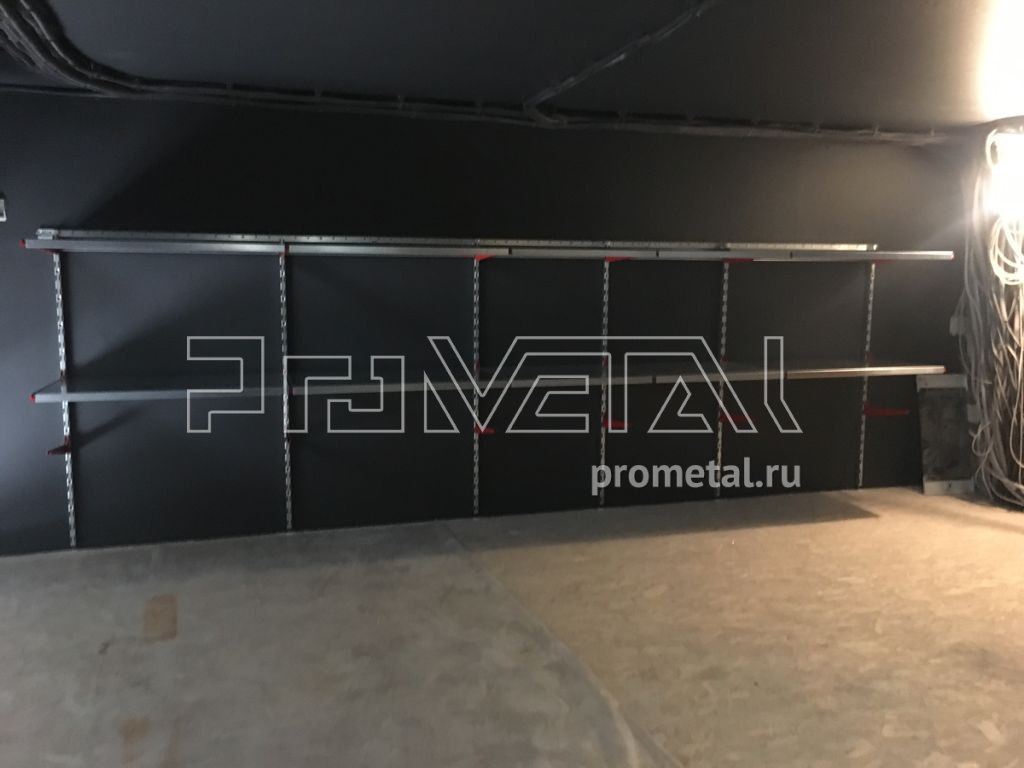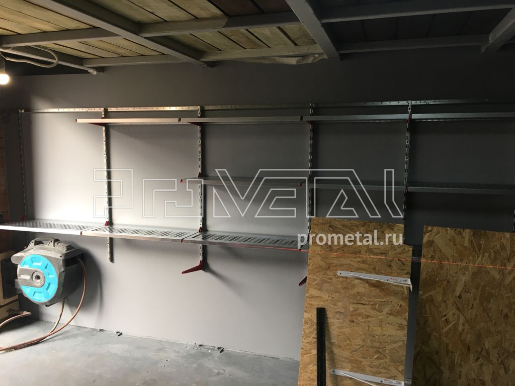 На втором этаже зона хранения с цельными полками глубиной 520 и 315мм. Кронштейны для длинномеров используем для хранения удочек в чехлах.