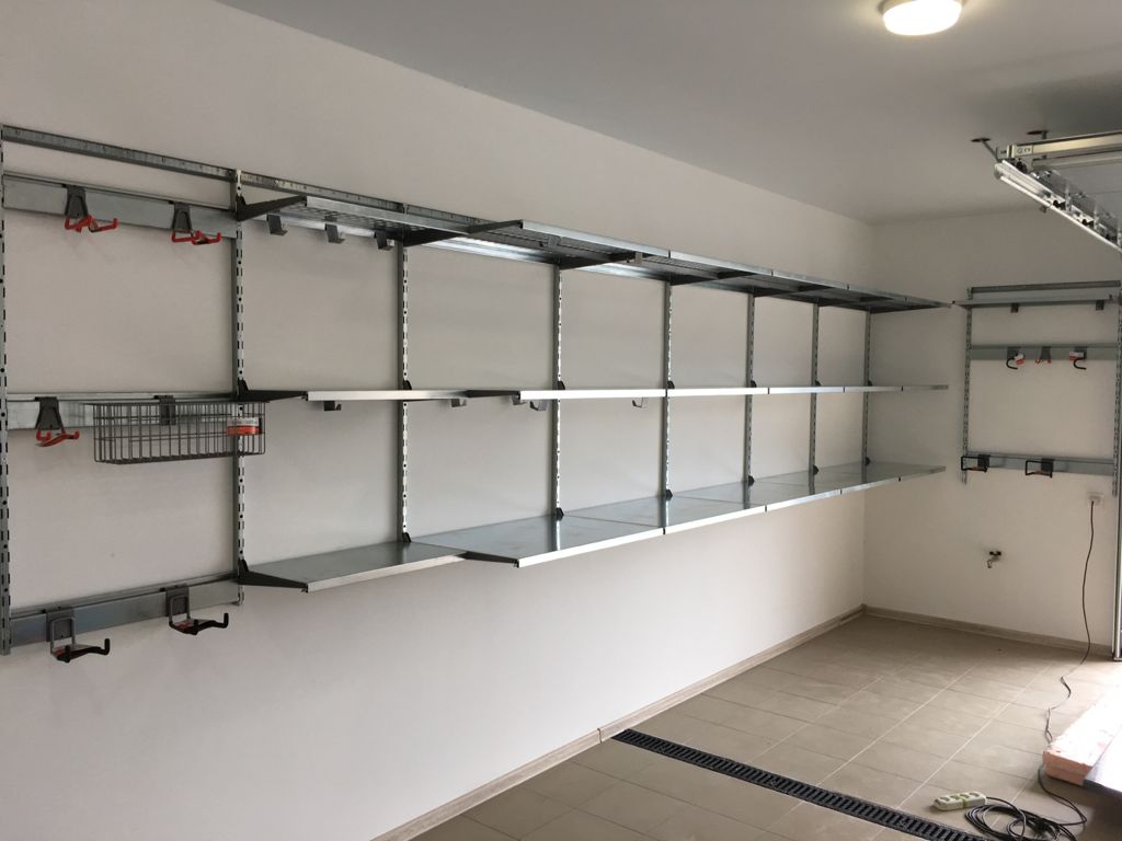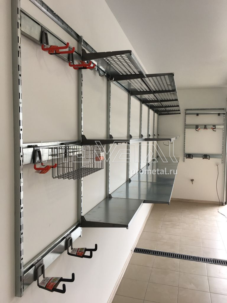 Колеса мы расположили на дальней стене, в углу на подвесах для колес и кронштейнах держателях. На правой стене от ворот, расположили полки глубиной 520мм, исключением стали полки у двери, они 315мм. Верхний ряд полок мы по умолчанию сделали перфорированный, усилив их ребрами жесткости, нижние ряды - цельные. У двери и у ворот (там где делать полки не удобно) расположили рейлинги на вертикалях с крюками Эссе. Проект получился красивый и не перегруженный, монтаж выполнил наш мастер, за несколько часов.