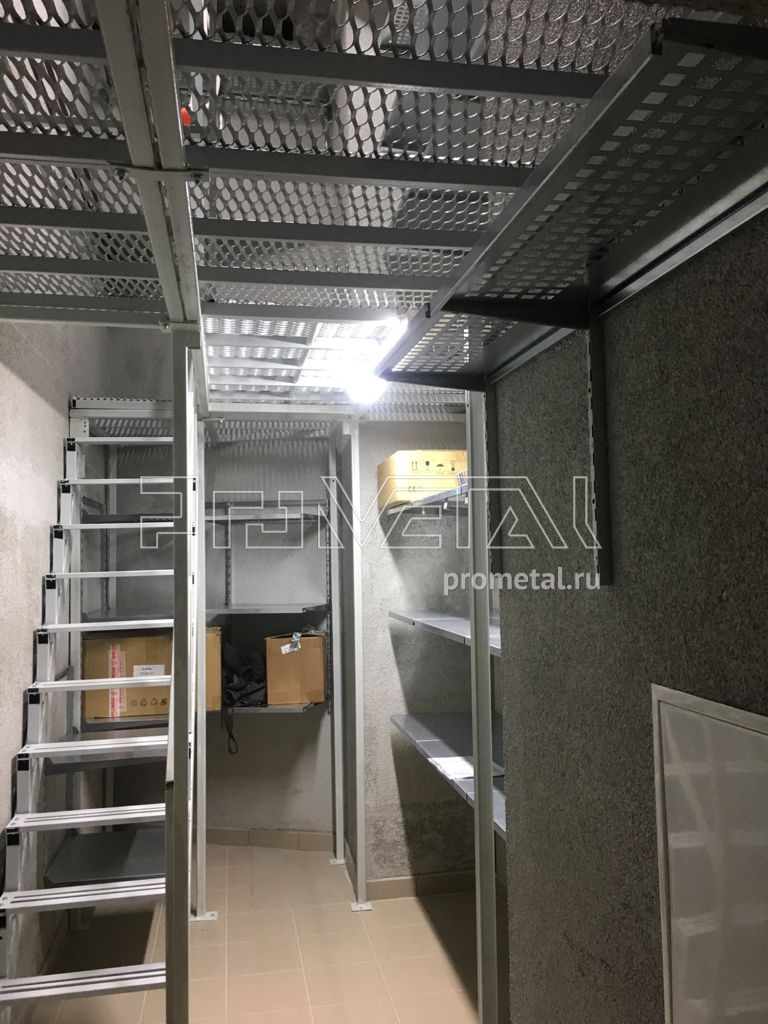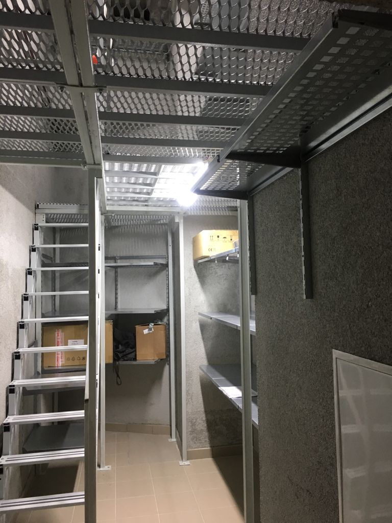 Обустраивая кладовки в Москве, часто мы работаем с высокими помещениями, оборудованными мезонином. Бывает, высота кладовок составляет более 4-ёх метров. Наши навесные стеллажные системы идеально подходят для таких помещений, т.к. нагрузка передается на стены и не влияет на конструкцию перекрытия 2-го этажа.