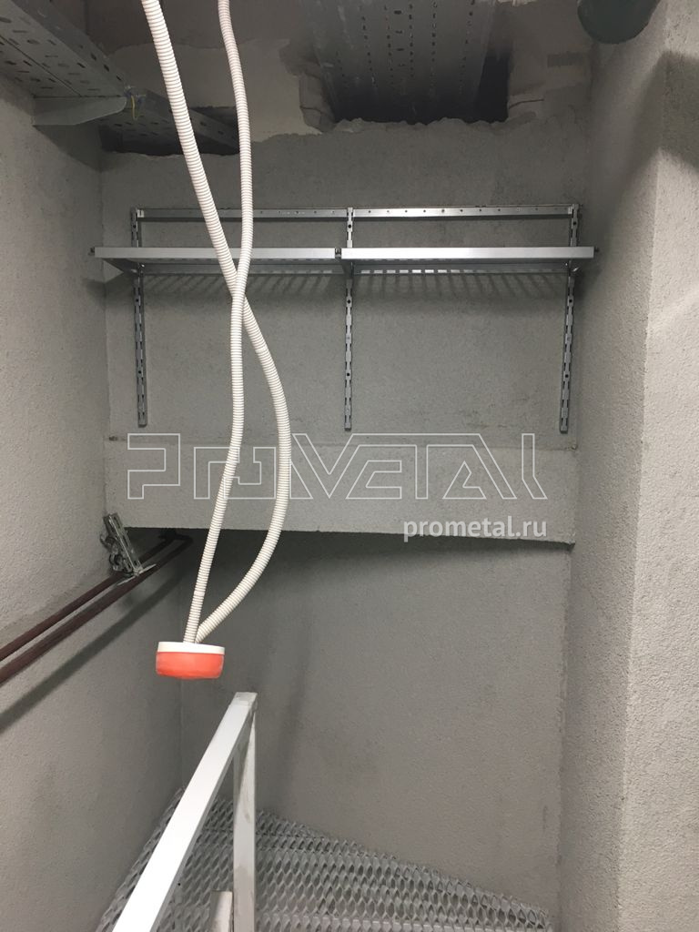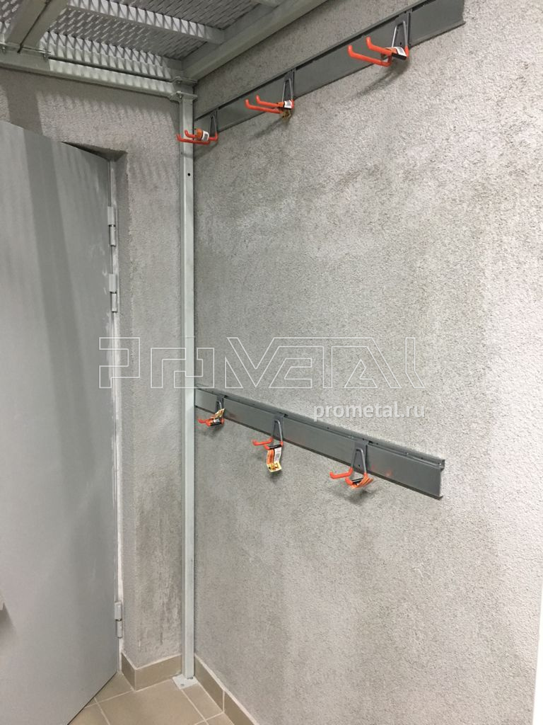 Основа проекта - полки, т.к. заказчик собирается хранить вещи в коробках. Верхний ряд полок сделали с перфорацией, нижний ряд полок цельный. Перфополки глубиной 520мм мы усиливаем с помощью ребер жесткости. При входе, где невозможно сделать полки из-за двери и узкого прохода, предусмотрели рейлинг с крюками Эссе. Монтаж произвел наш мастер за один день.