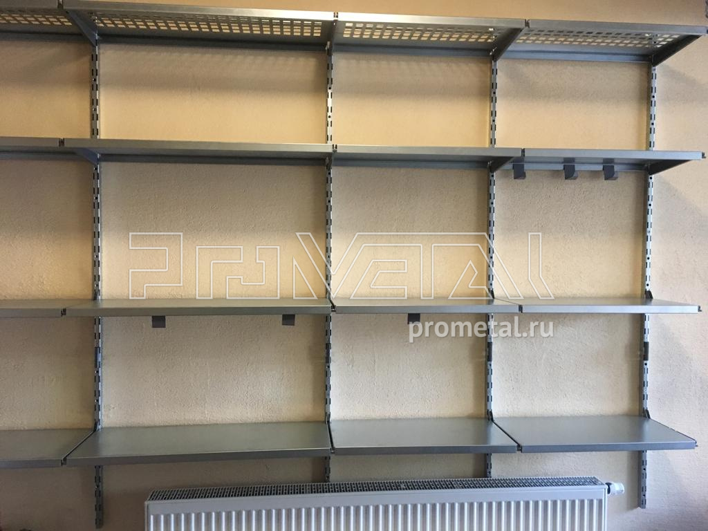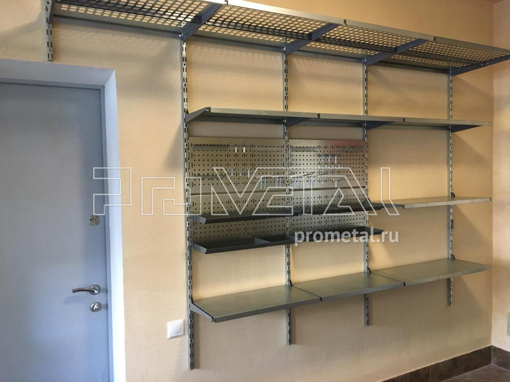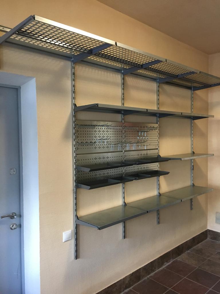 Проект получился достаточно простой, не перегруженный. Основа проекте - полки, глубиной 315 и 520мм. Верхний ряд полок с перфорацией, нижний ряд полок - цельный. На верхние полки глубиной 520мм предусмотрели ребра жесткости. На одной стене заказчик попросил установить 4 перфопанели размером 600х290мм, на перфопанели повесили лотки, крюки и держатели для инструментов.