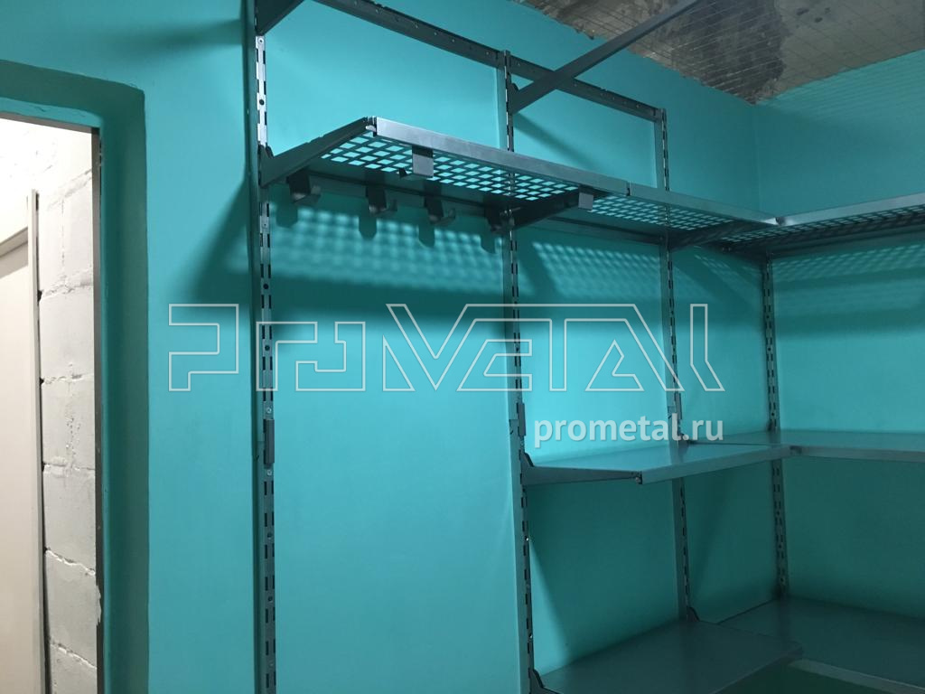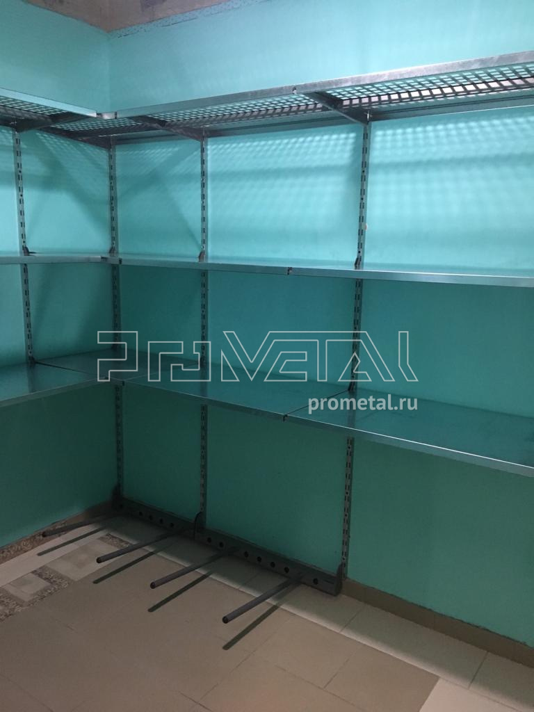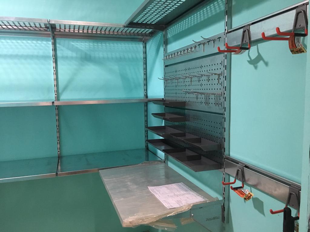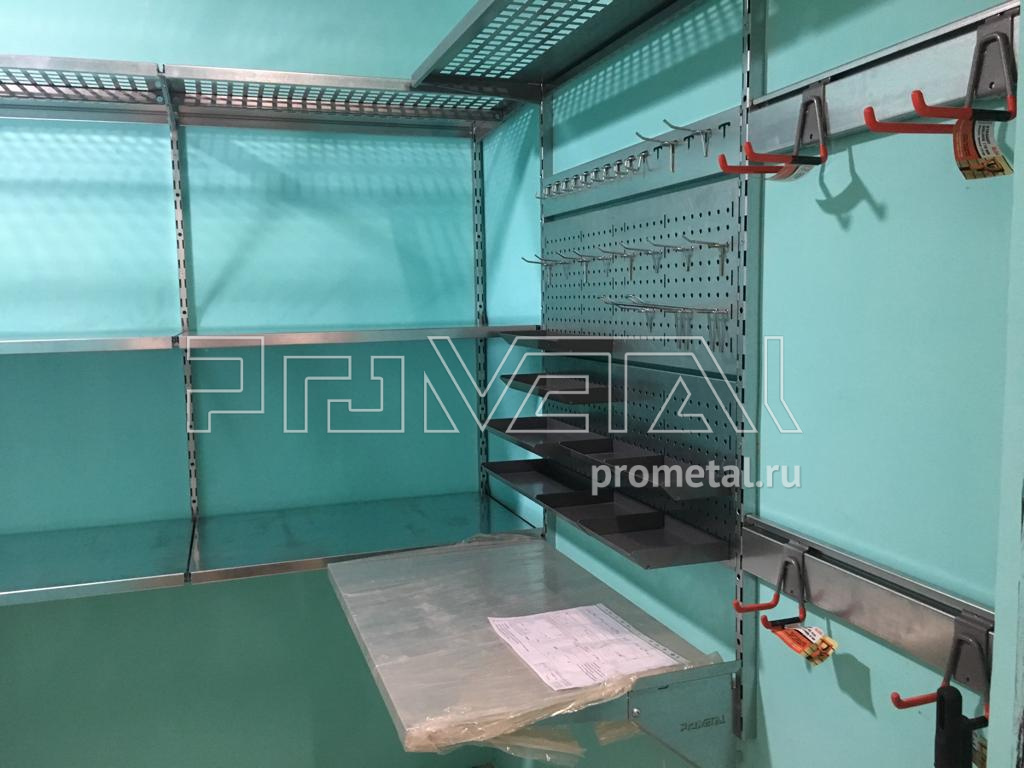 Проектом предусмотрена рабочая зона с откидным фанерным верстаком, перфопанелями с крюками, лотками и держателями для инструментов, над ним. При входе установили рейлинги с крюками Эссе. Колеса храним в дальнем углу на кронштейнах-держателях для колес. Остальную площадь стен занимаем полками, нижние ряды полок цельные, верхний ряд перфорированный. Перфополки глубиной 520мм усиливаем дополнительными ребрами жесткости. Пол оставляем свободным для парковки велосипедов, самокатов и прочего крупного инвентаря.