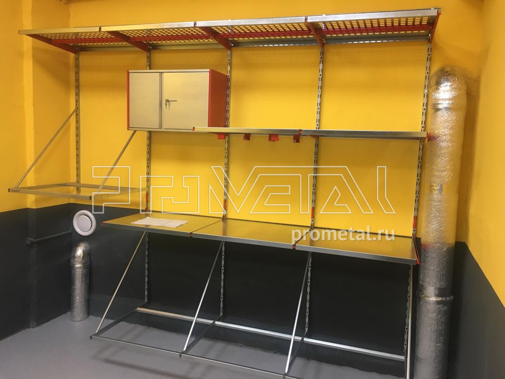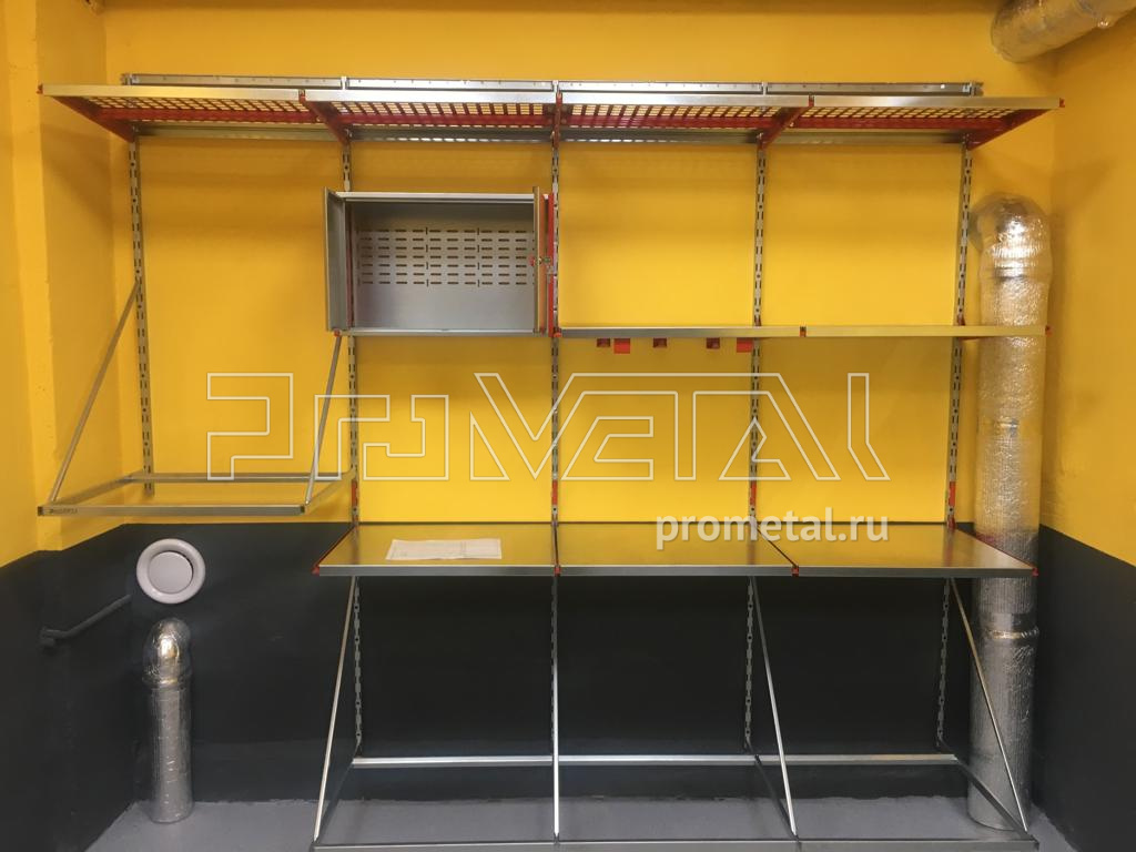 2 комплекта колес храним на подвесах. Над колесами предусмотрели полки глубиной 520мм, верхний ряд полок с перфорацией. Также в проекте предусмотрели шкафчик с замком.