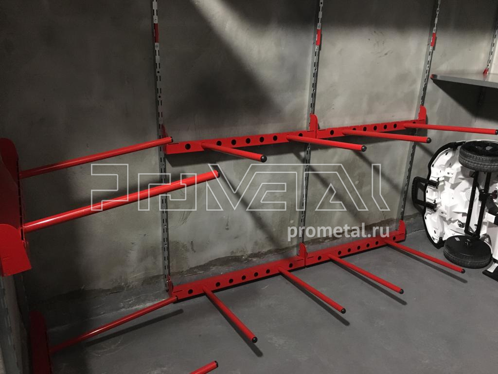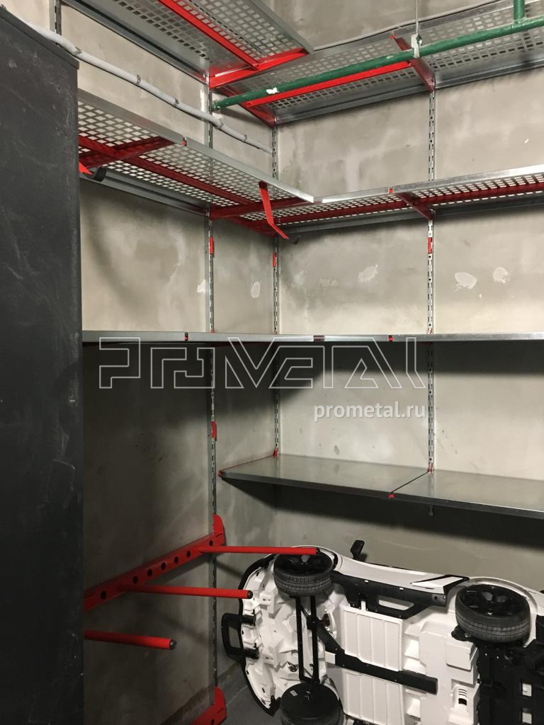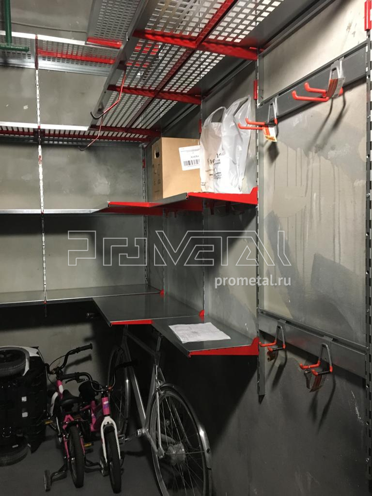 В проекте мы предусмотрели хранение нескольких велосипедов, поэтому полки находятся на высоте 1200мм от уровня пола, а для сезонного хранения предусмотрели несколько крюков для вело под полку. 3 комплекта колес храним на кронштейна-держателях, внизу, чтобы не затаскивать колеса наверх. Остальную площадь стен занимаем полками, для хранения вещей в пластиковых боксах и коробках. Верхние уровниполок с перфорацией и ребрами жесткости, нижние - цельные. При входе справа повесили рейлинги с крюками Эссе, т.к. монтировать в этом месте полки не целесообразно, будут мешать свободному проходу в кладовую.