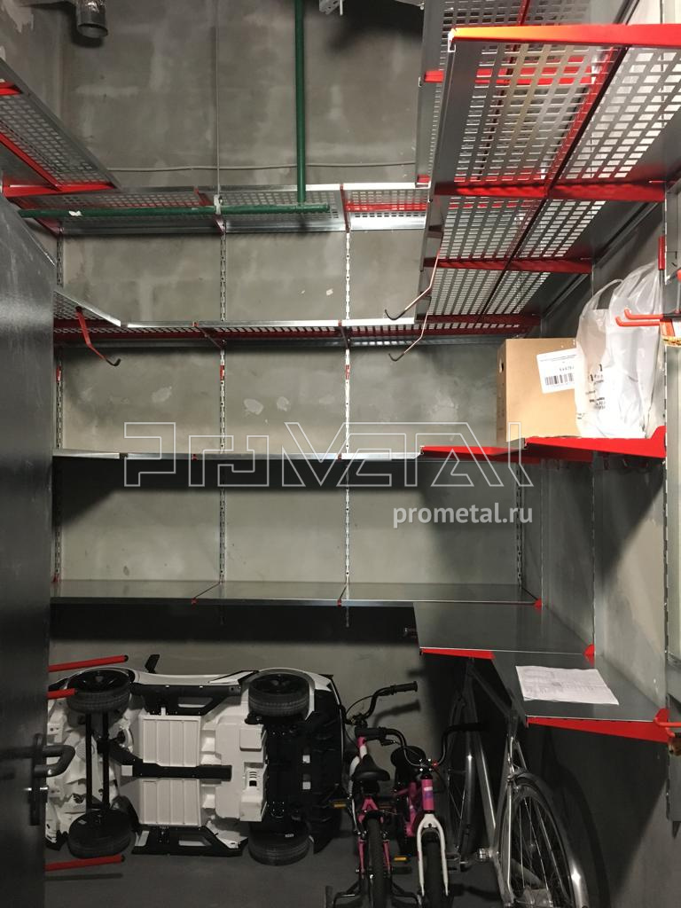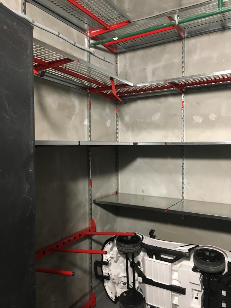 Кладовая в ЖК Береговой в Москве. Стандартное кладовое помещение в подвале дома с высокими потолками (около 4ех метров). Заказчики, как правило, хотят использовать кладовые по максимуму и просят продумать полки до самого верха, мы стараемся останавливаться на высоте 3-3,2м, выше пользоваться полками становится уже просто не безопасно.