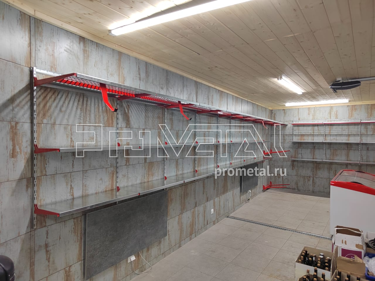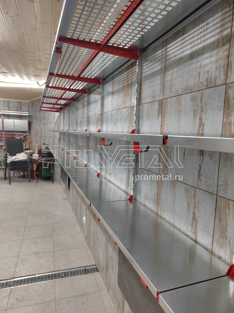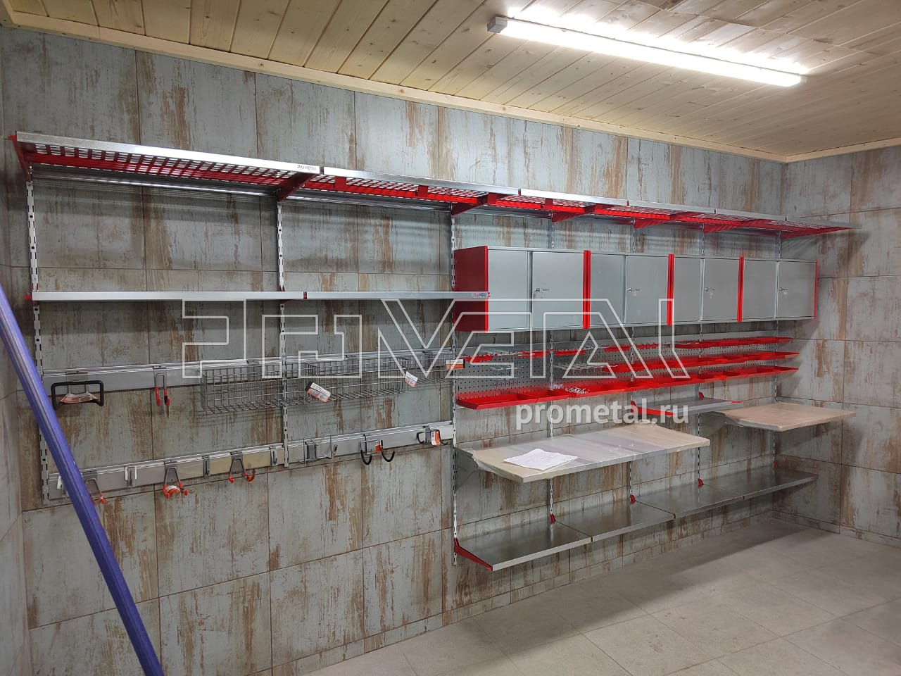 В проекте предусмотрели рабочий уголок с 2-мя верстаками, один из них выполнен из пролаченной фанеры, второй оцинкованный. Над верстаками вешаем перфопанели с крючками, лотками, держателями для различных инструментов и несколько шкафчиков. На этой же стене ближе ко входу размещаем рейлинги с крюками Эссе, под садовый инвентарь и крупные инструменты. Остальные стены занимаем полками, для хранения различных вещей. Верхний ряд полок сделали с перфорацией и усилили ребрами жесткости. На центральной стене храним комплект колес на кронштейнах-держателях.