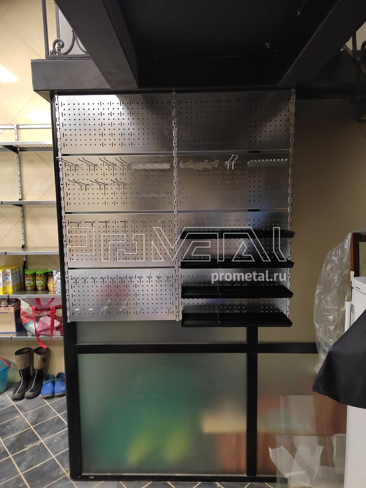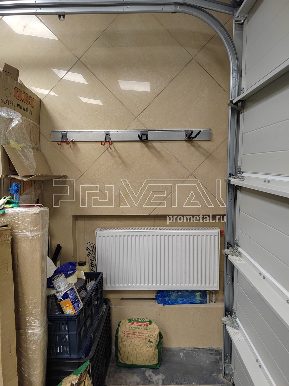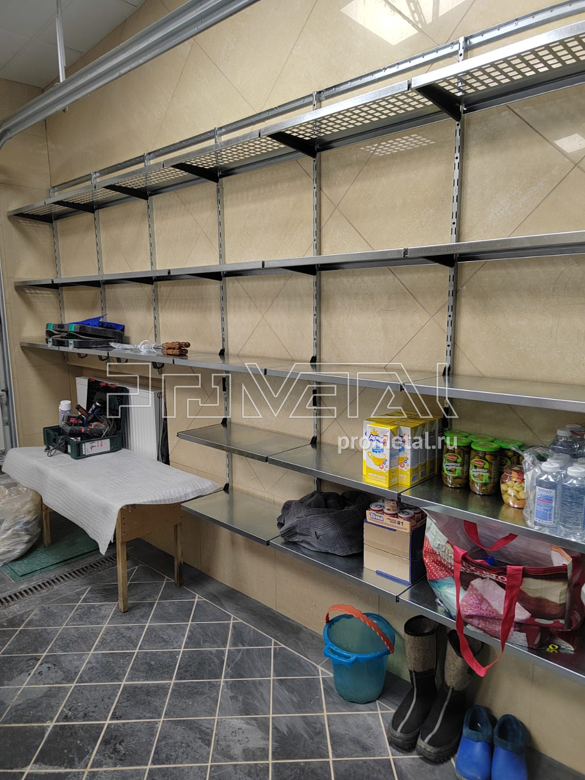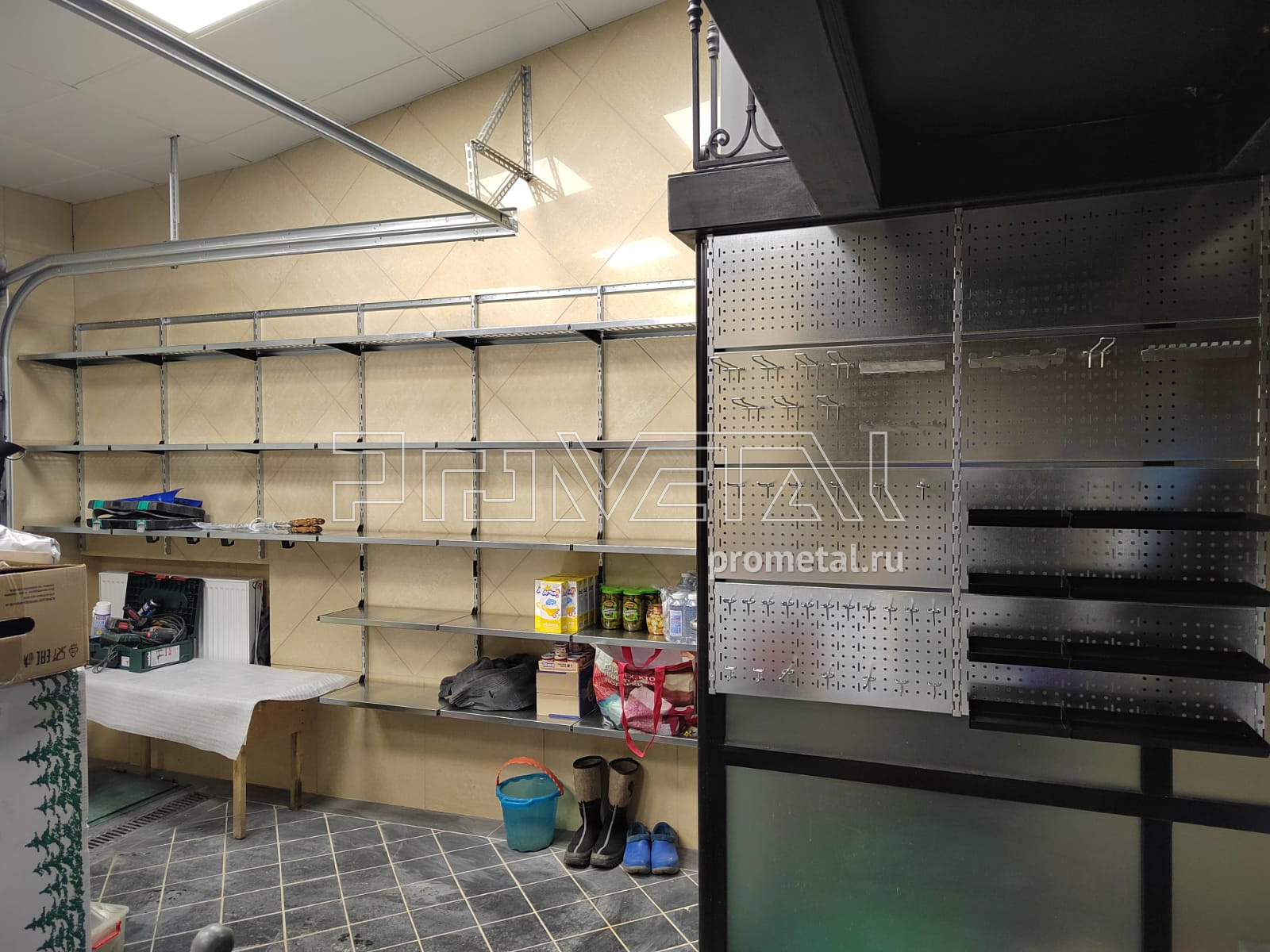 В проекте мы задействовали 3 стены. 1 стена с полками, глубиной 315мм для хранения различных вещей, от коробок с соком до зимней обуви, верхние ряды полок с перфорацией. На второй стенке, которая выполнена из металлического профиля мы повесили несущий каркас с перфопанелями, к перфопанелями предусмотрели крючки, лотки и держатели для различных инструментов. 3 стену использовали для хранения садового инвентаря на рейлинге с крюками Эссе.