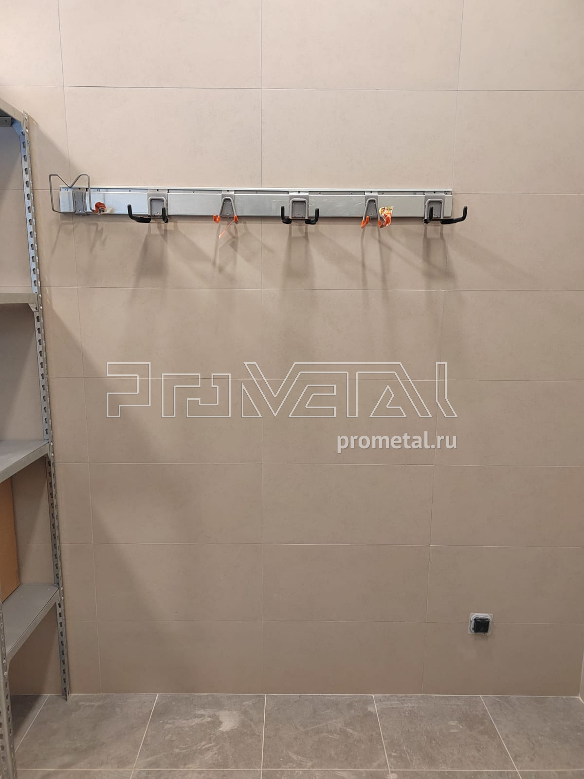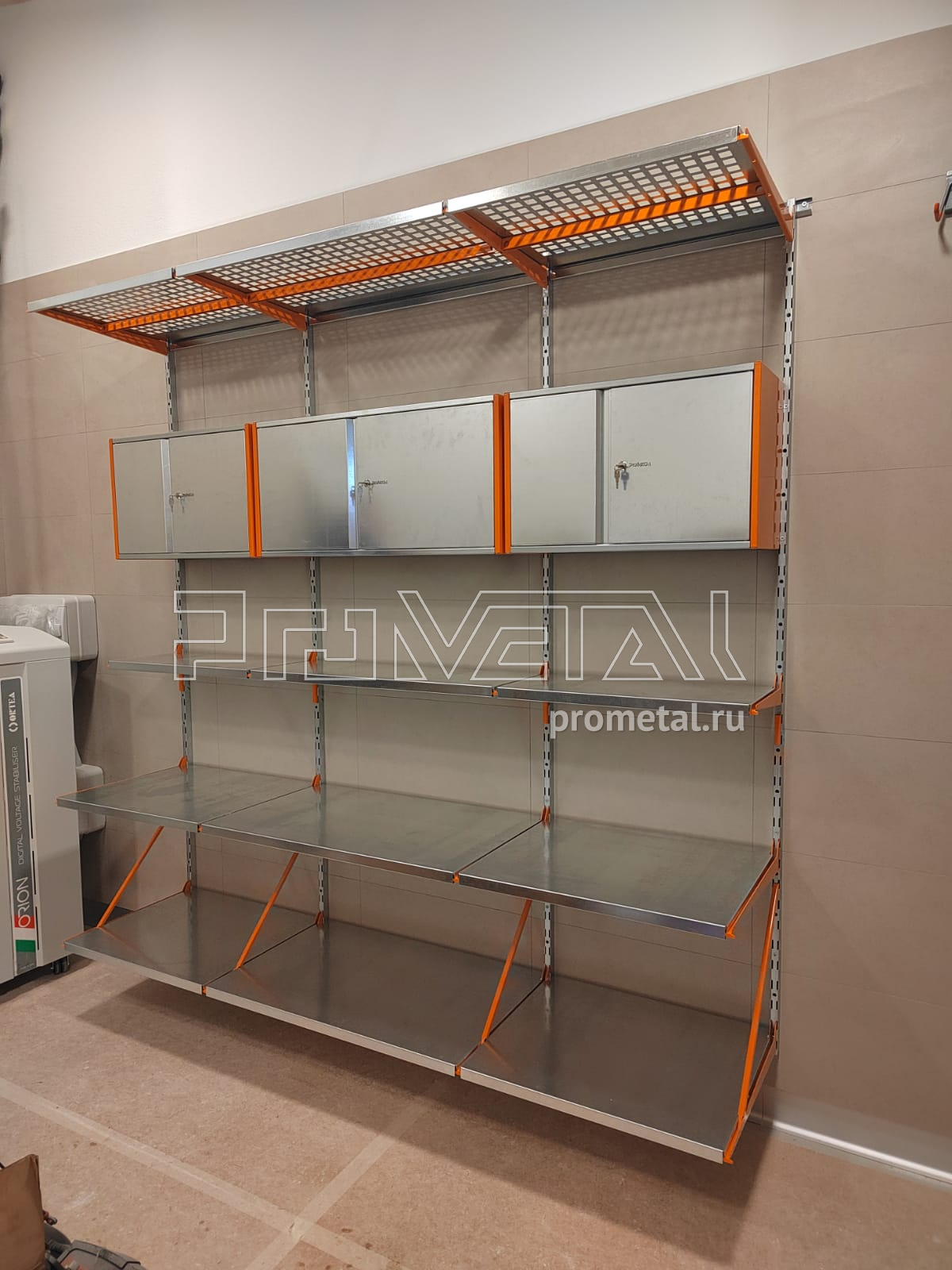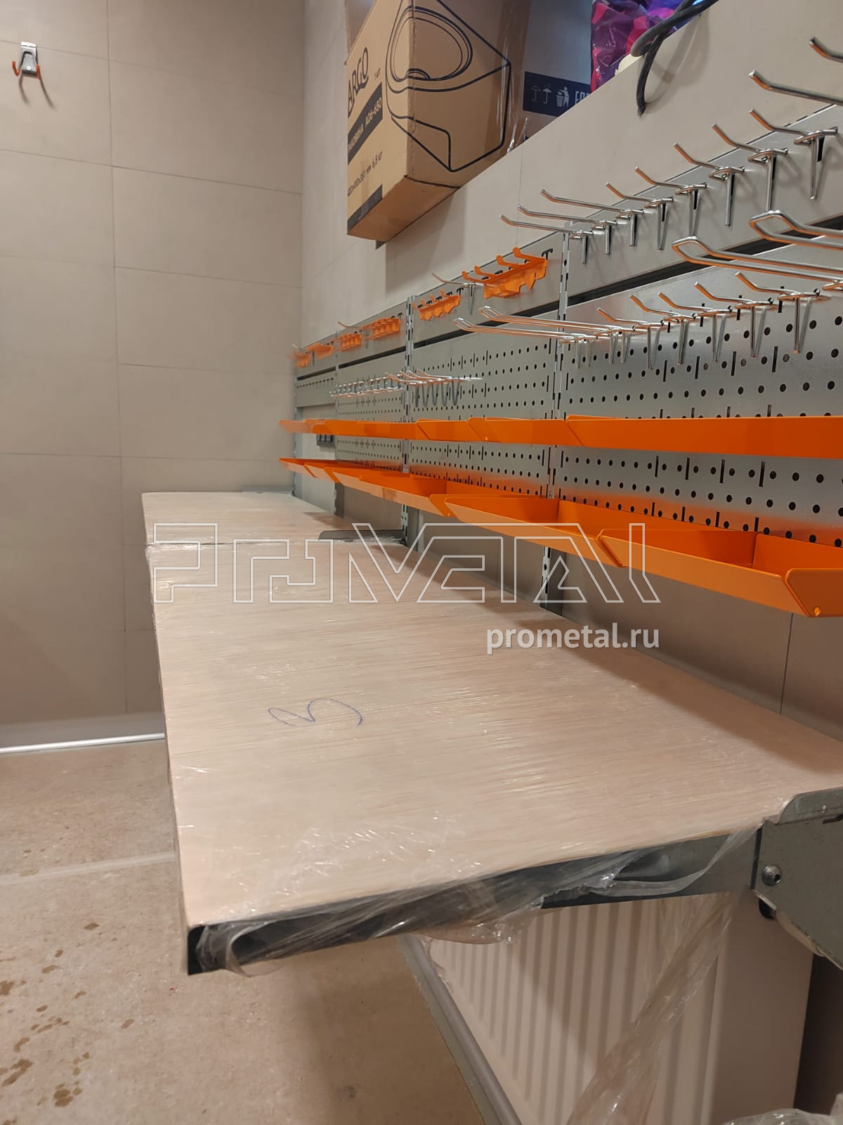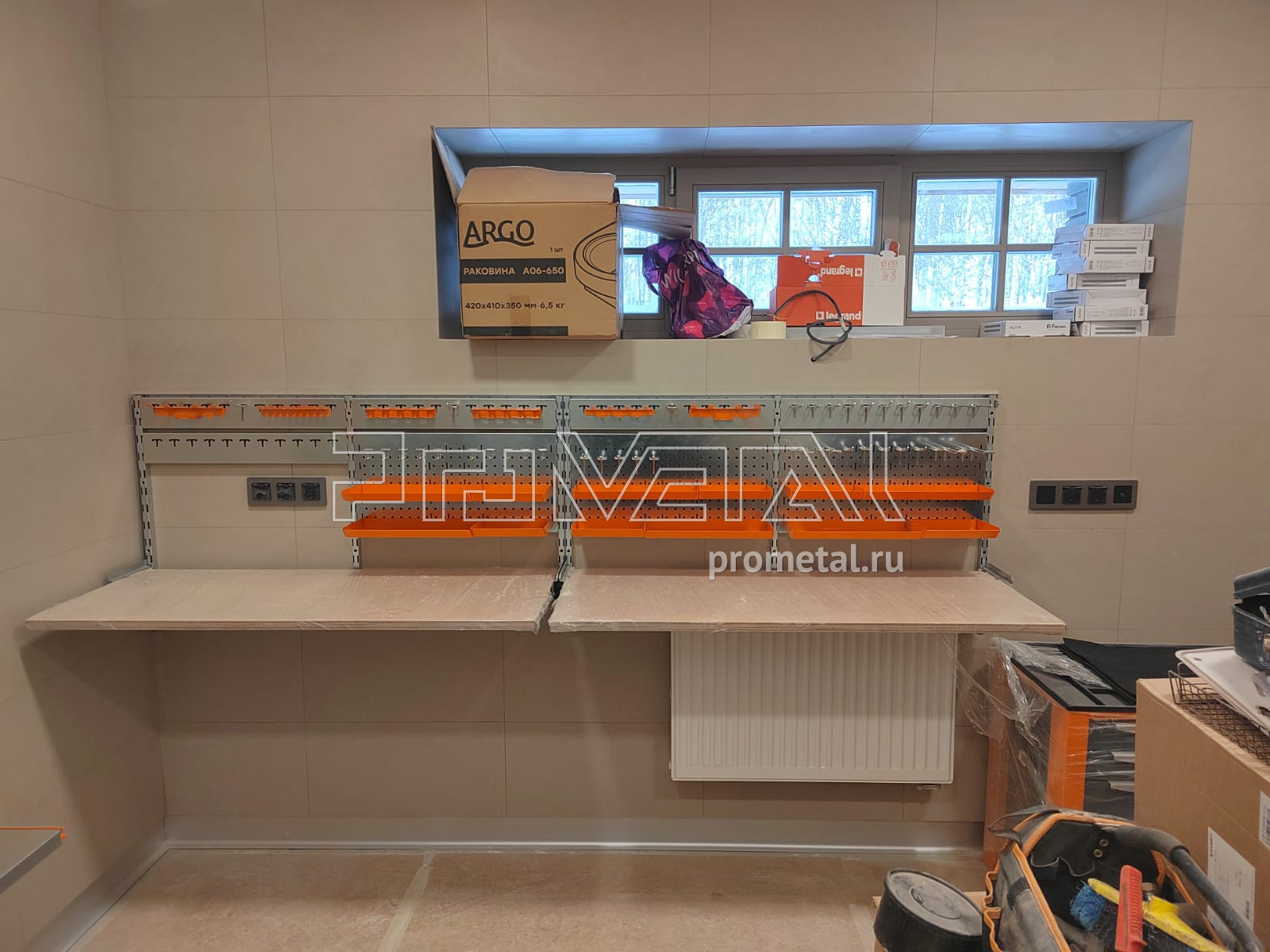 В проекте предусмотрены 2 складных стола-верстака из пролаченной фанеры. Над верстаками предусмотрели перфопанели с крючками, лотками и держателями для инструментов, окрашенных в оранжевый цвет. На соседней стене несколько рядов полок, на нижний ряд полок предусмотрели усиление кронштейнов, верхние ряды полок с перфорацией, усилены ребрами жесткости. На этой же стене предусмотрели 3 шкафчика с замком. В проекте предусмотрен рейлинг с крюками Эссе, располагаем на 3-ей стене.