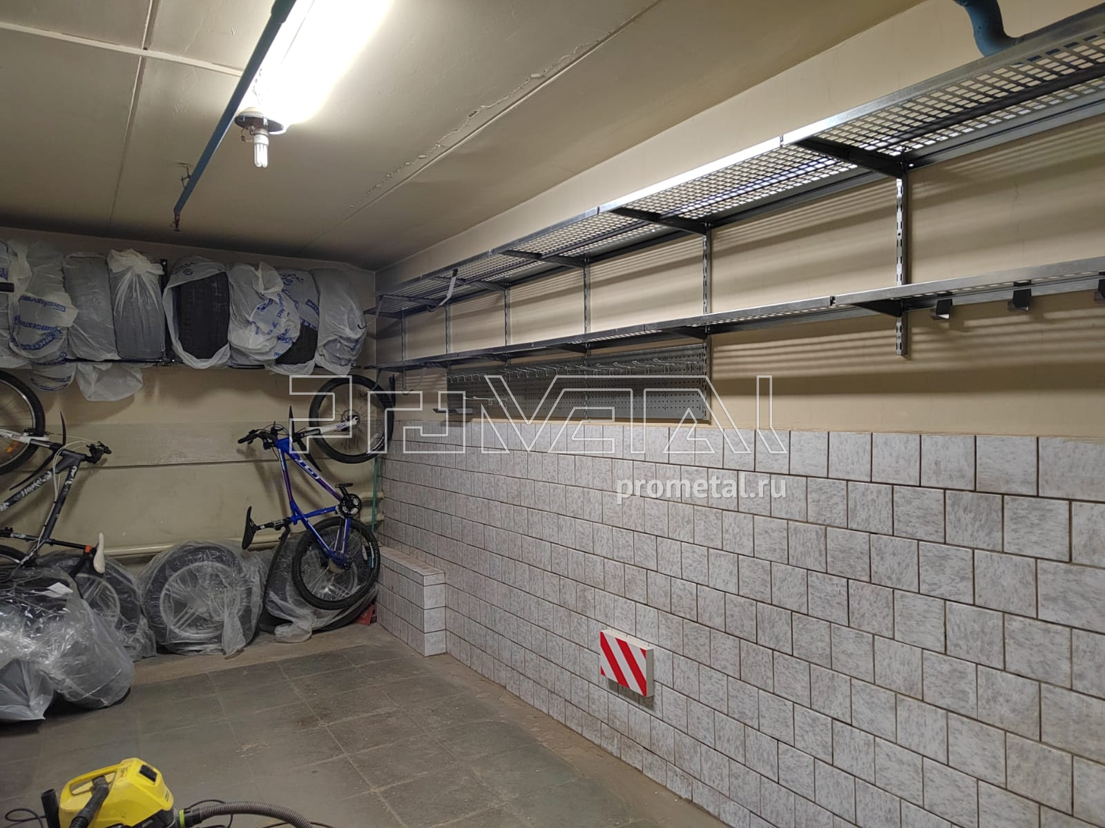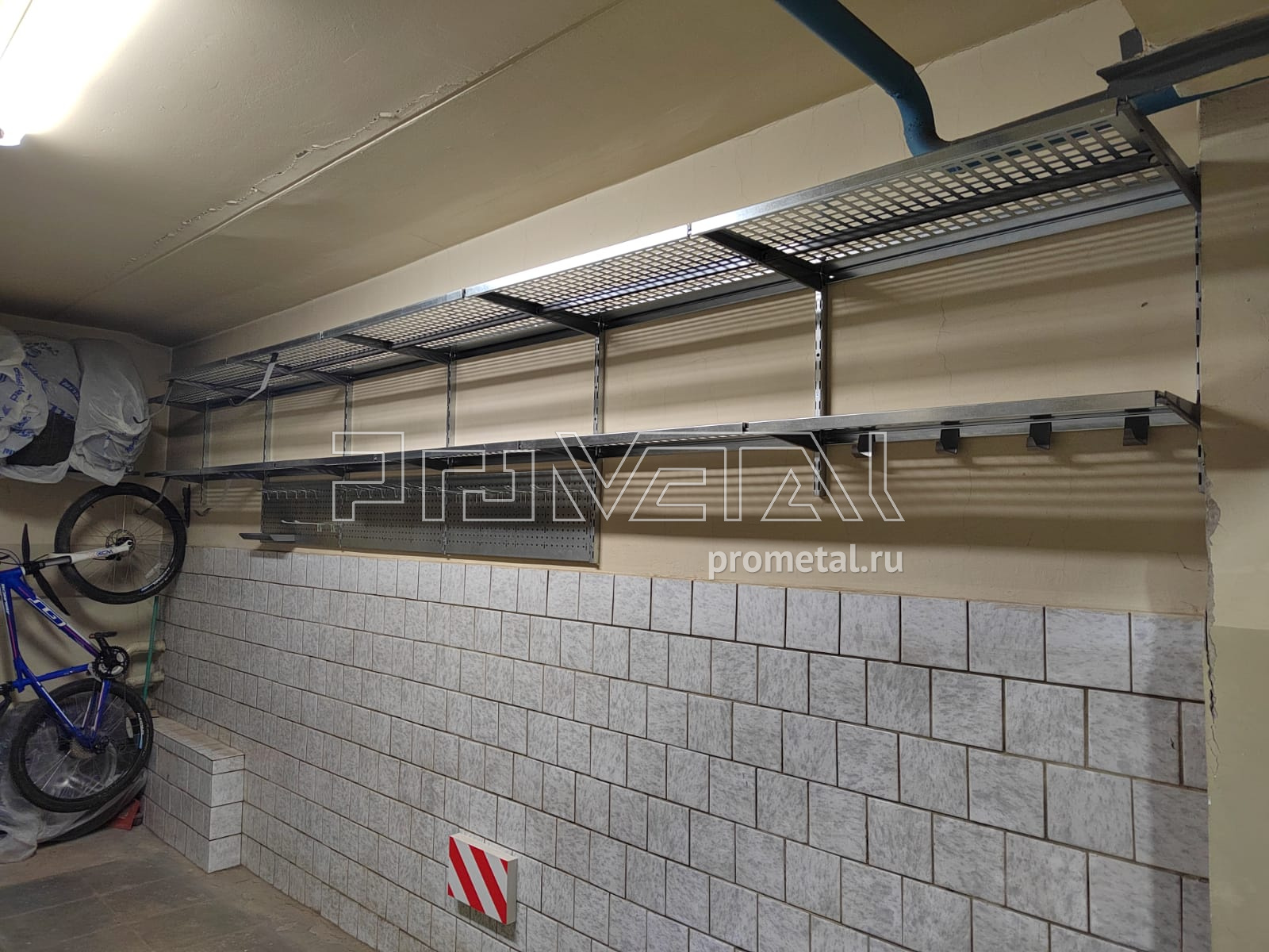 Сразу скажем что на фотографии подвесы для колес на него производства, установлены не нами, наша продукция только на правой стене. Проект - 2 ряда перфорированных полок глубиной 520мм, усиленных ребрами жесткости. Под центральными секциями предусмотрели 3 перфопанели с лотками и крючками, для небольших инструментов и мелочей. В проекте предусмотрено несколько крюков под полку и крюков под полку для вело.