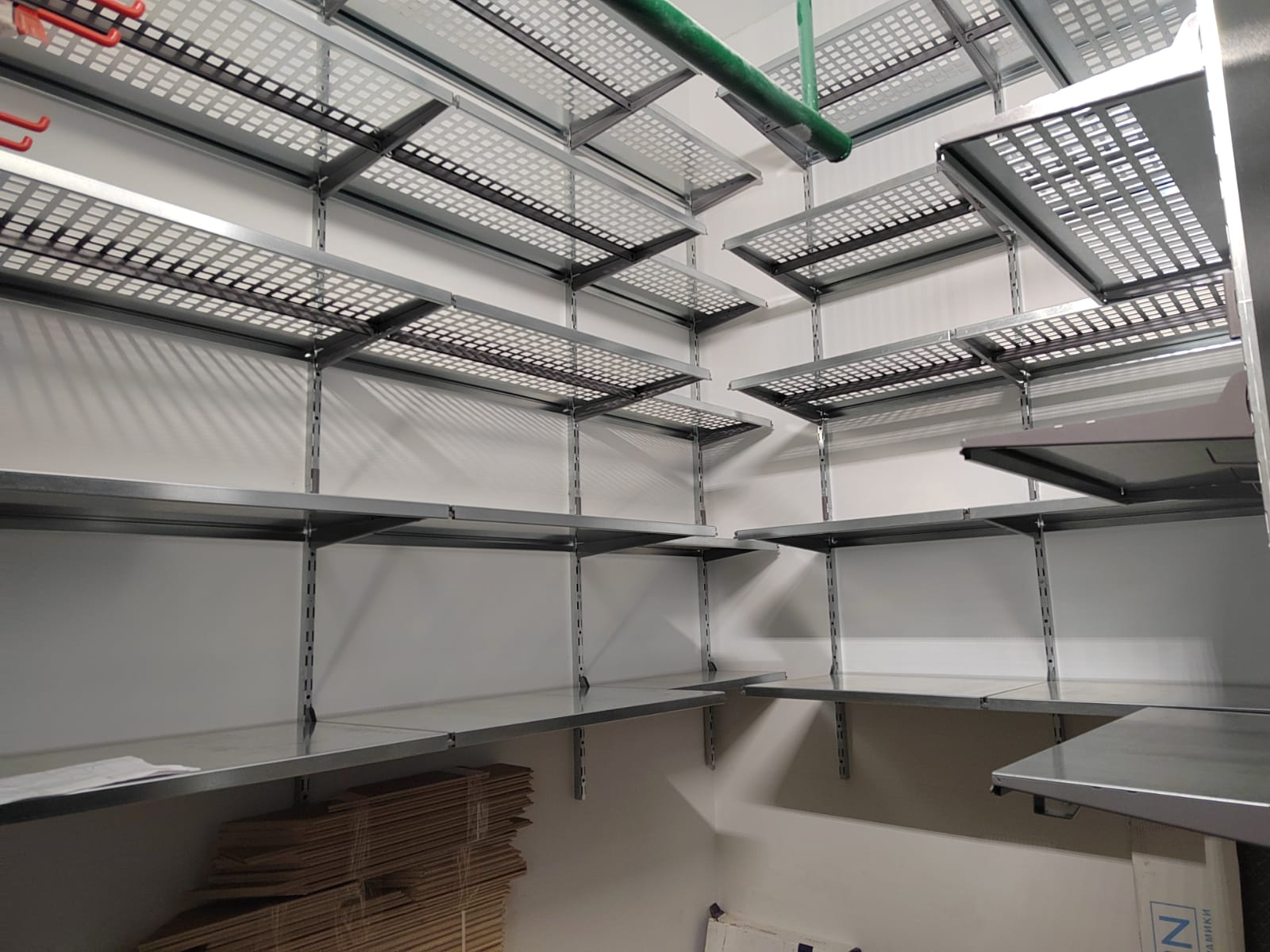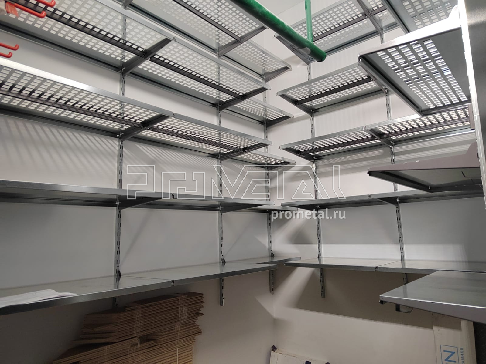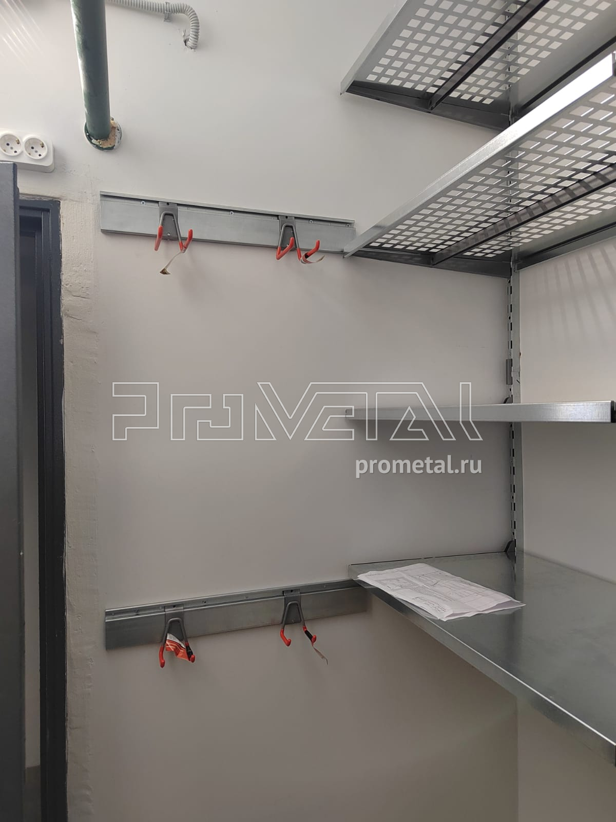 Проект был сделан по пожеланиям заказчика, основную площади стен занимают полки, глубиной 520 и 315мм. Верхние ряды полок с перфорацией, нижние цельные. При входе слева от двери, чтобы избежать "туннельный эффект" располагаем рейлинги с крюками Эссе, в нише за дверью также рейлинги под стремянку и штанга под плечики для одежды.