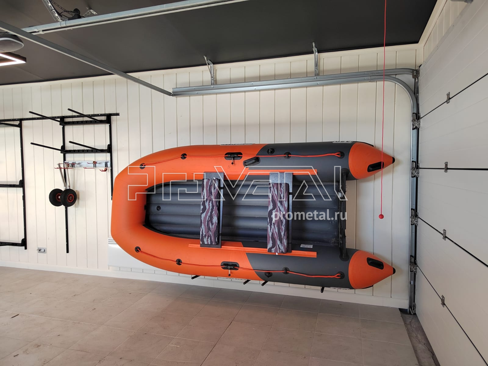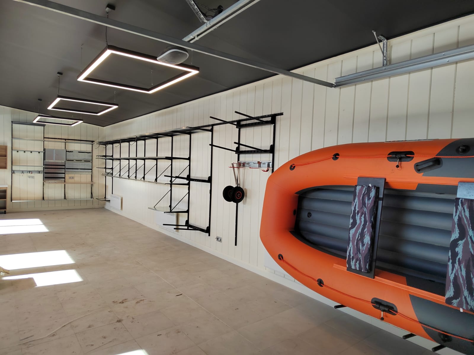 Проект получился достаточно интересный. По длинной стене мы предусмотрели большую зону хранения с полками 520мм. На короткой стене располагаем верстак для работы, над рабочей поверхностью предусматриваем перфопанели с крючками, лотками и держателями для инструментов, шкафчик на замке. Слева от верстака рейлинги с крюками Эссе для хранения крупного инструмента и хоз. инвентаря. Для хранения комплекта колес и лодки на длинной стене предусмотрели модули-держатели.