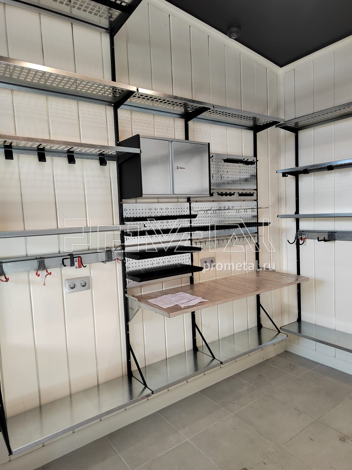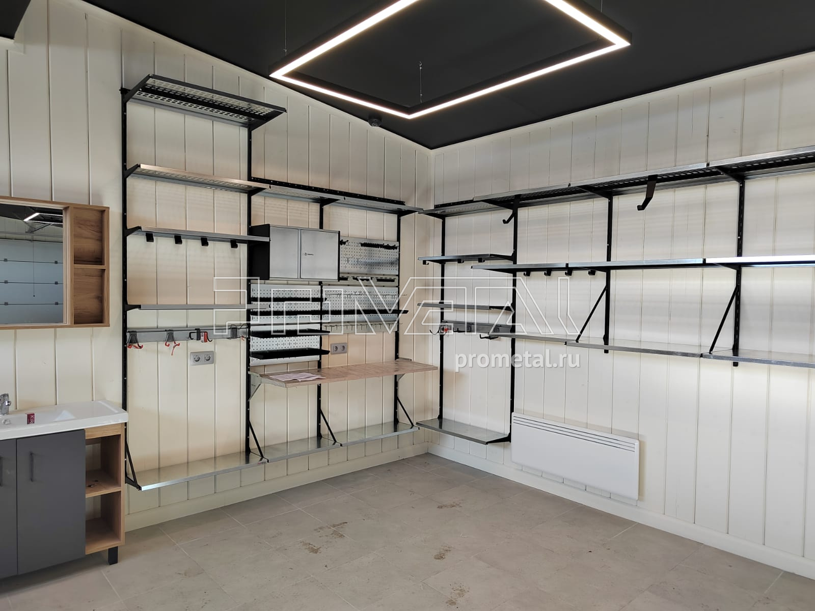 Гараж в Тверской области, Конаково. Максим обратился с просьбой обустроить каркасный гараж в Тверской области. Стены под наши конструкции предварительно были обшиты доской. Проект с Максимом сделали дистанционно, заказчик выслал размеры помещения, фотографии и свои пожелания. Несущий каркас окрасили в черный цвет, по пожеланию заказчика.