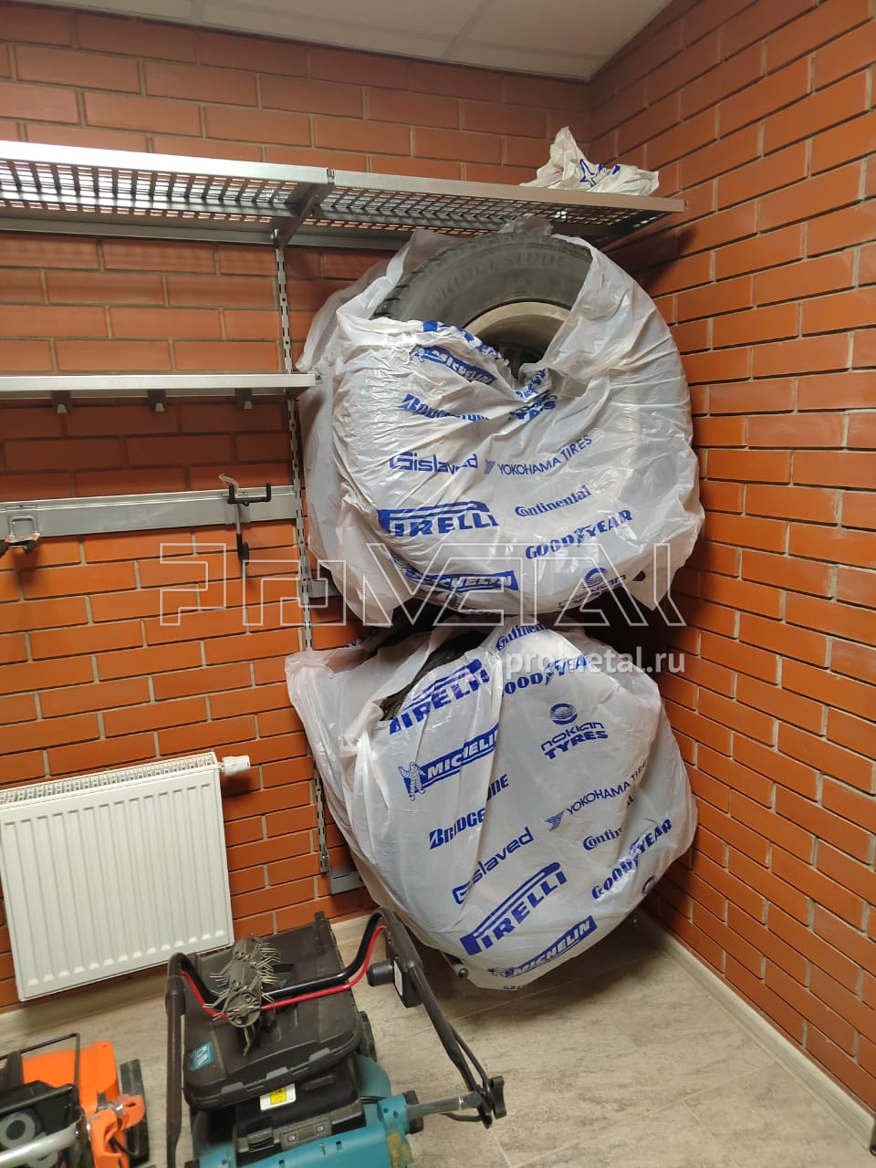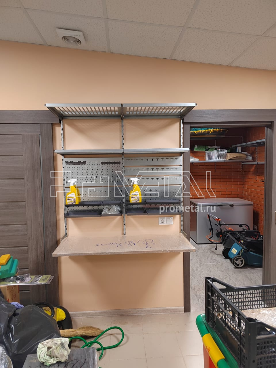 Что касается самого проекта, то он получился довольно интересным. Помещение должно было вмещать в себя множество различных конструкций, таких как модули-кронштейнов для колес, перфорированные и цельные полки с крюками и без, а также полки с усилением для тяжелых вещей. Из-за большого количества инструментов и садового инвентаря, наш проектировщик предусмотрел рейлинги с различными крюками Эссе для хранения мётел, лопат, шлангов, различных щеток. Особое пожелание заказчика - разместить верстак. Для этого в проекте было предусмотрено место под фанерный складной стол-верстак, а над ним перфопланки и перфопанели с лотками, крючками и держателями для инструментов, чтобы все необходимые вещи были под рукой.