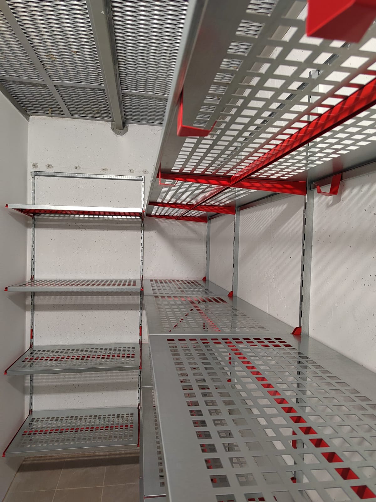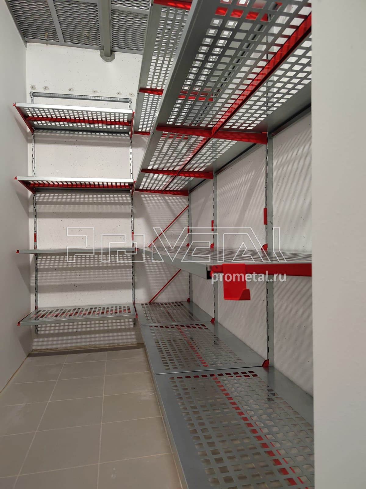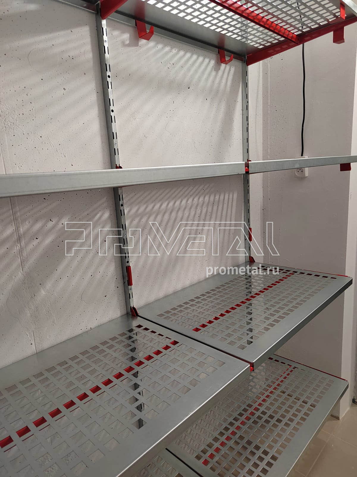 В проекте предусмотрели глубокие перфорированные полки с усилением для хранения габаритных вещей. Кладовая получилась эффективной и удобной в использовании.