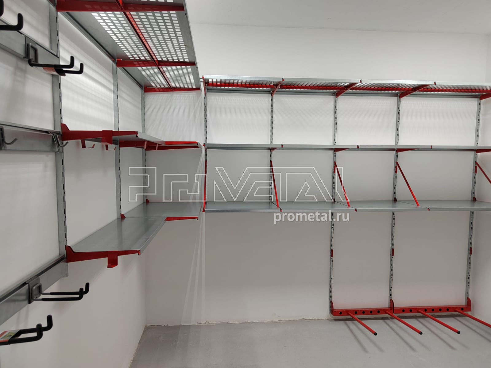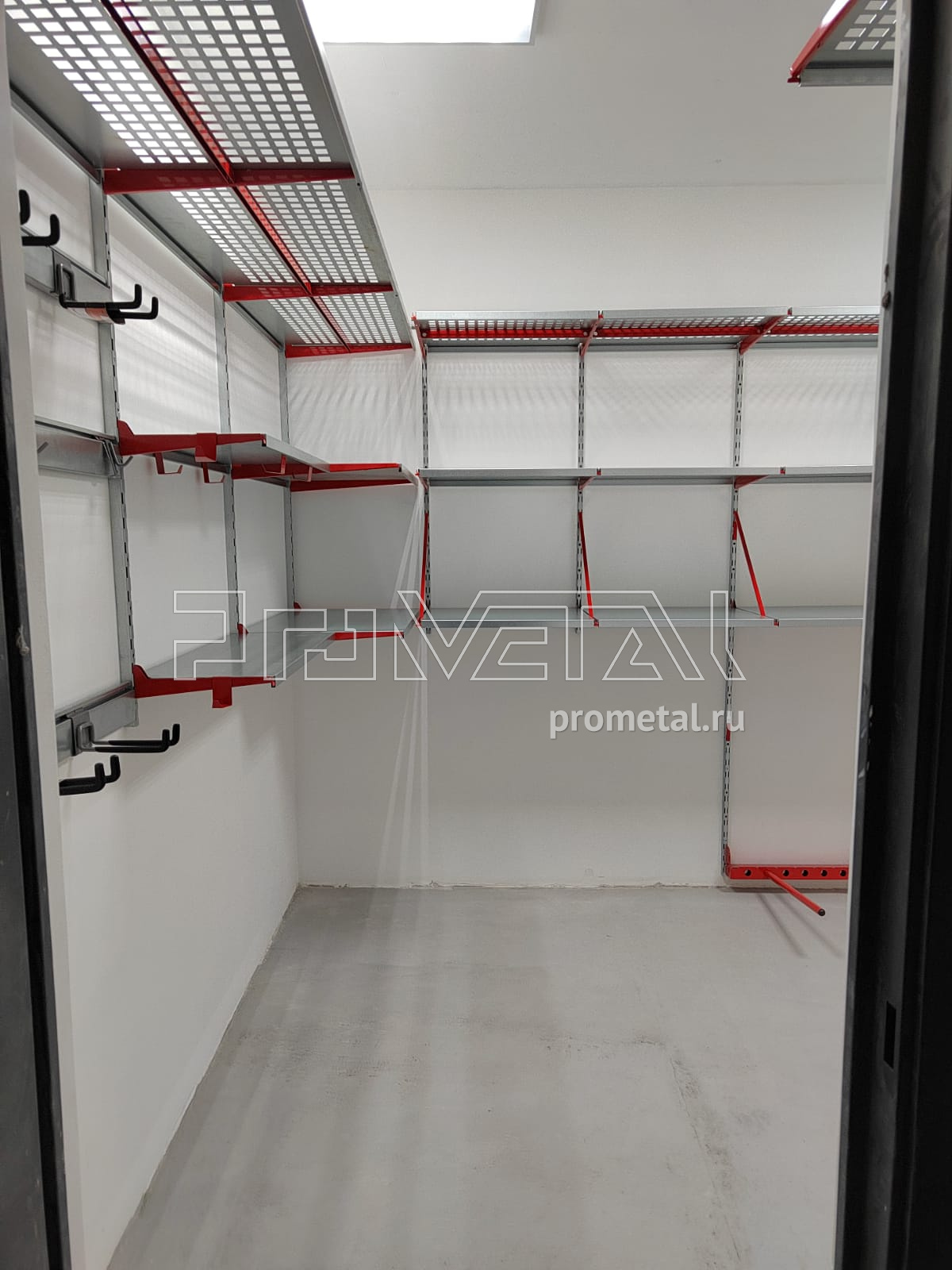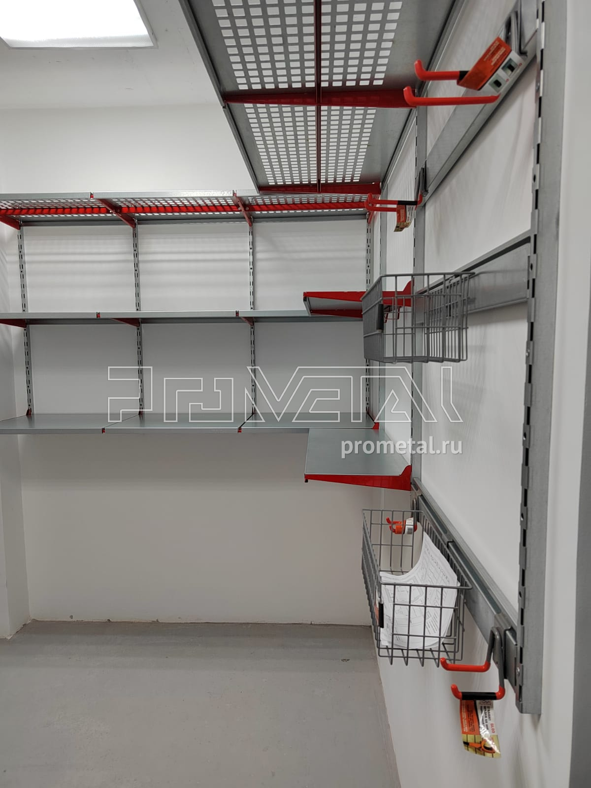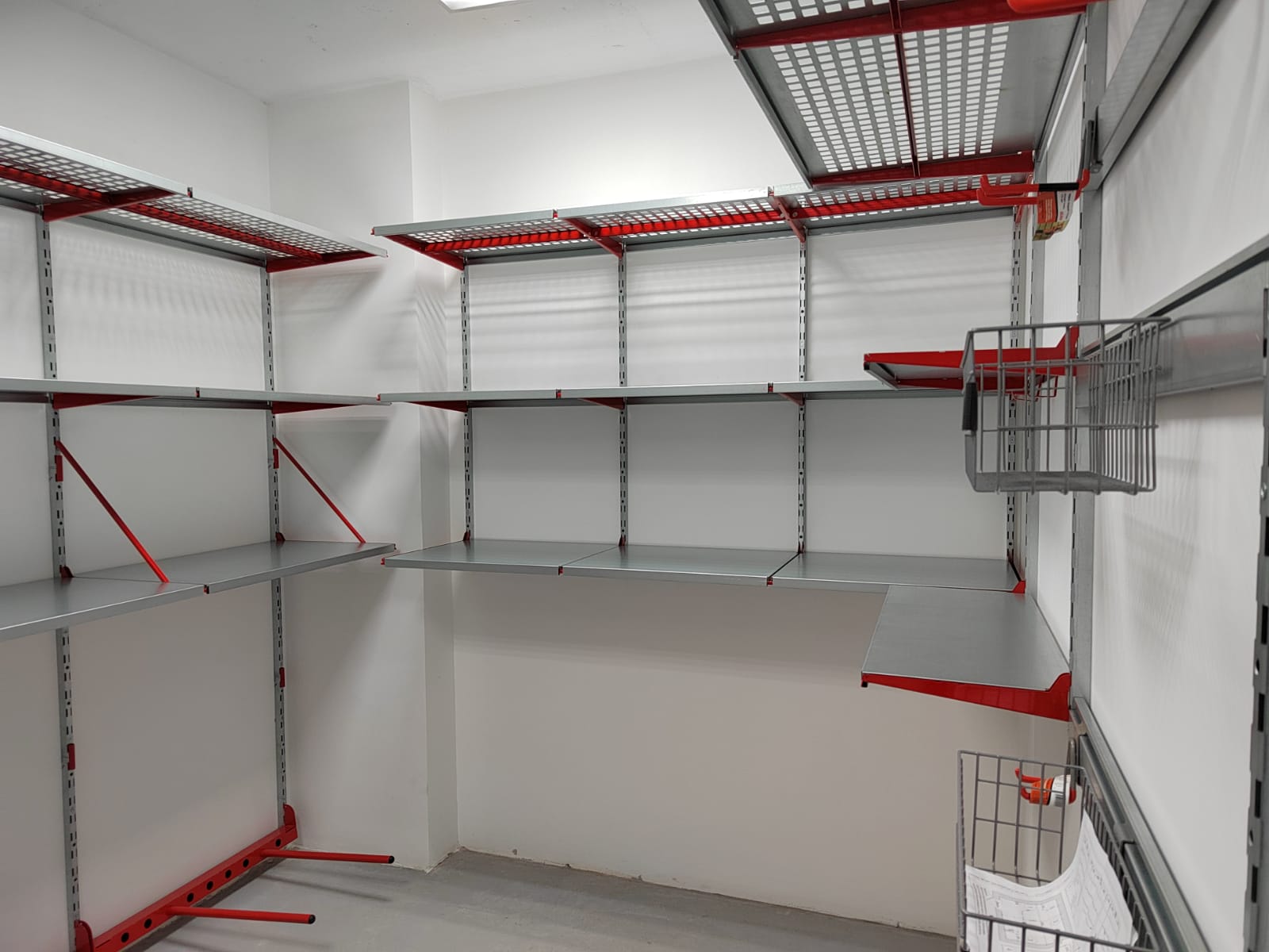 Большую часть площади стен занимают полки глубиной 520мм, верхний ряд полок выполнен с перфорацией, такие полки частично пропускают свет и снизу видно что на них лежит, на некоторых полках предусмотрено усиление, для хранения тяжелых вещей. Комплект колес размещаем в дальнем углу кладовой на модулях-держателях. При входе где нет возможности установить полки, запланировали рейлинги с крючками и корзинками Эссе.