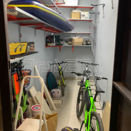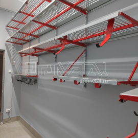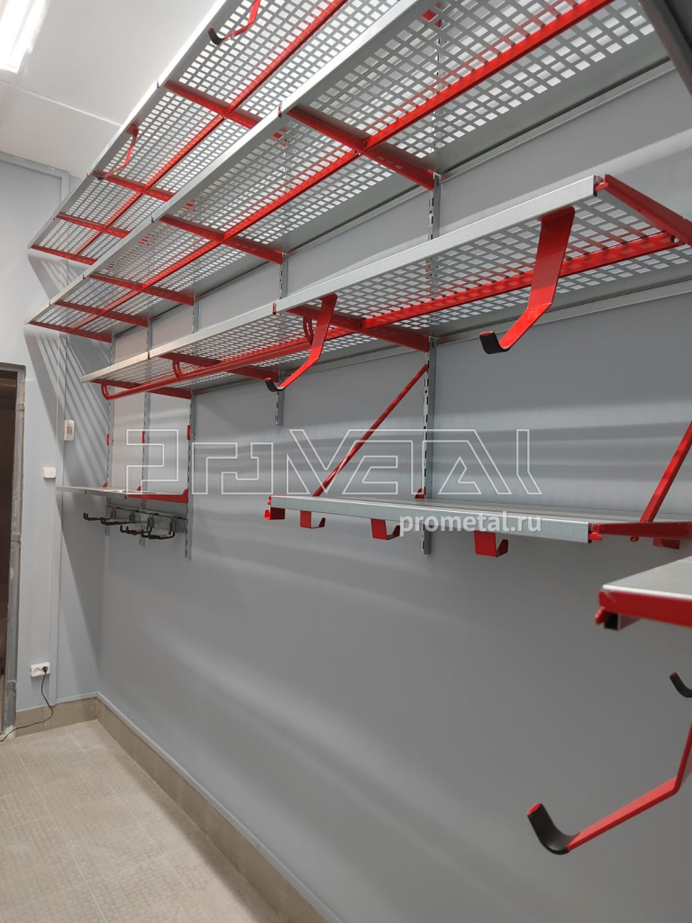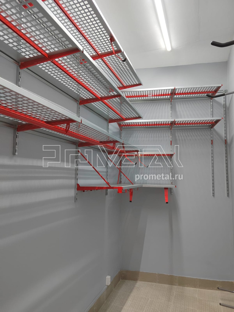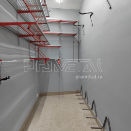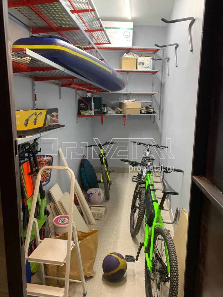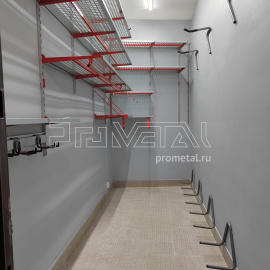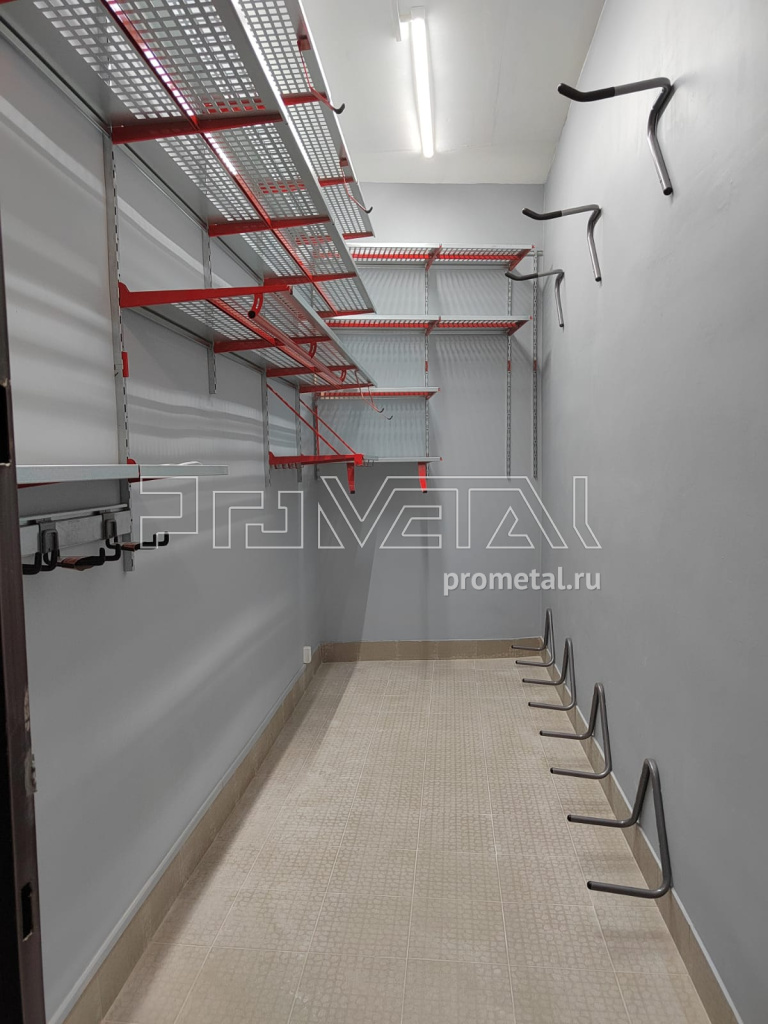 Особенность проекта - нестандартная форма помещения, используя наши системы хранения, функционал помещения не сужается, из-за такой формы. Предусмотрели побольше полок глубиной 520 и 315мм, верхние ряды выполнены с перфорацией, нижние цельные. Полки начинаются на высоте 1200мм от пола, под полками паркуем велосипеды/самокаты. Также велосипеды/стремянку храним на правой стене на крюках 1-вело. Для некоторых полок предусмотрели усиление. При входе разместили рейлинги с крюками Эссе.