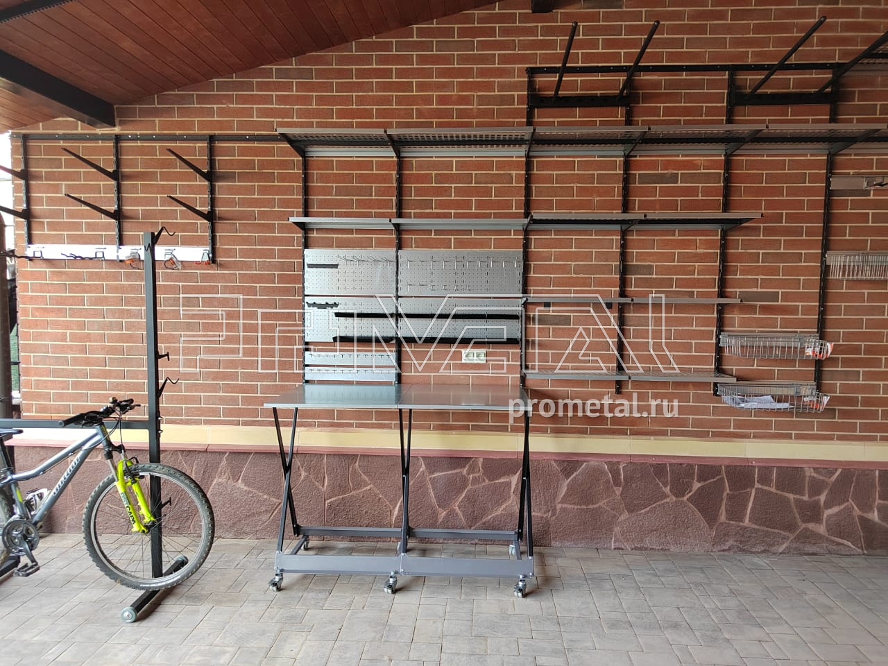 Проект предусматривает комфортное хранение автомобиля под навесом, в некоторых случаях влезут и 2 автомобиля, если переместить стойку на 4 велосипеда. В проекте мы предусмотрели колесный стеллаж на 1 комплект широких колес (для Land Cruser), с фанерной полкой "обитой" оцинкованным листом, стеллаж очень удобно использовать как рабочую поверхность, можно прикрутить тиски и т.д. Для хранения второго комплекта колес предусмотрели модули-держатели для колес, на центральной стене, за дверью. На таких же модулях, на левой стене храним автобокс. Над колесным стеллажом предусмотрели перфопанели с крючками, лотками и держателями для инструментов. Для хранения сад. и хоз. инвентаря в проекте предусмотрены рейлинги с крюками и корзинками Эссе. Велосипеды храним на стойке 4-вело универсал. Над стойкой разместили кронштейны для длинномеров, под хранение лыж/сноубордов в чехлах.