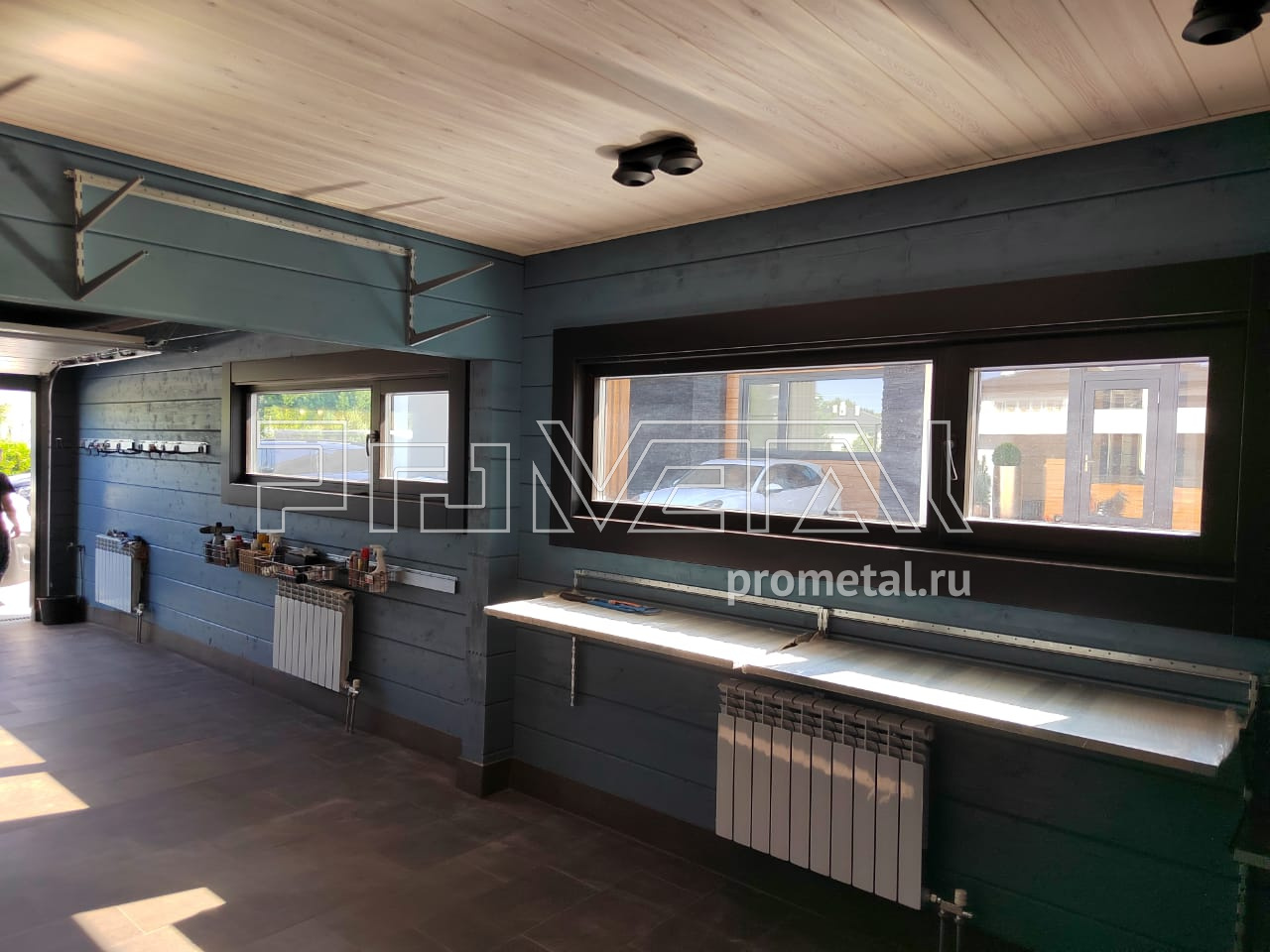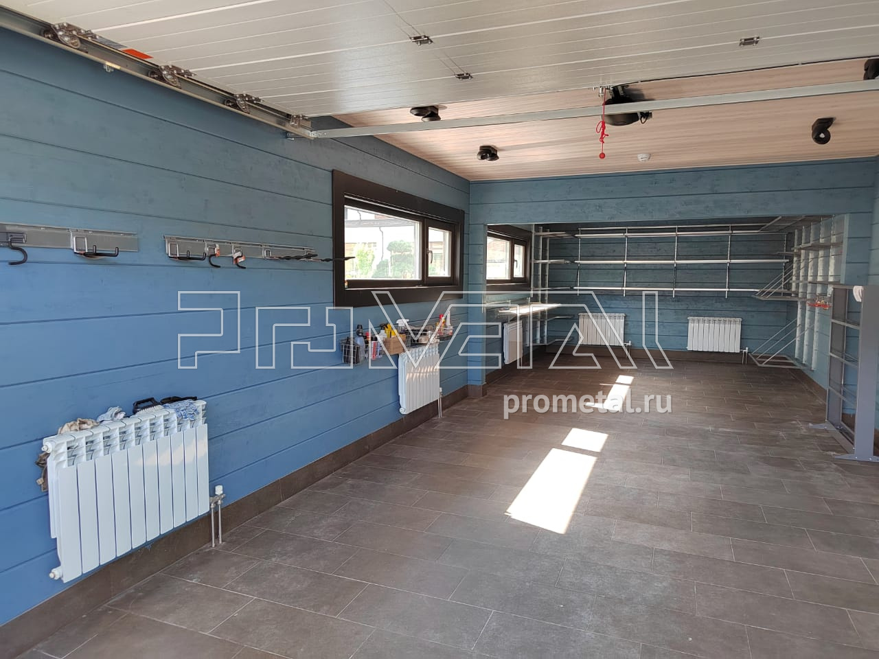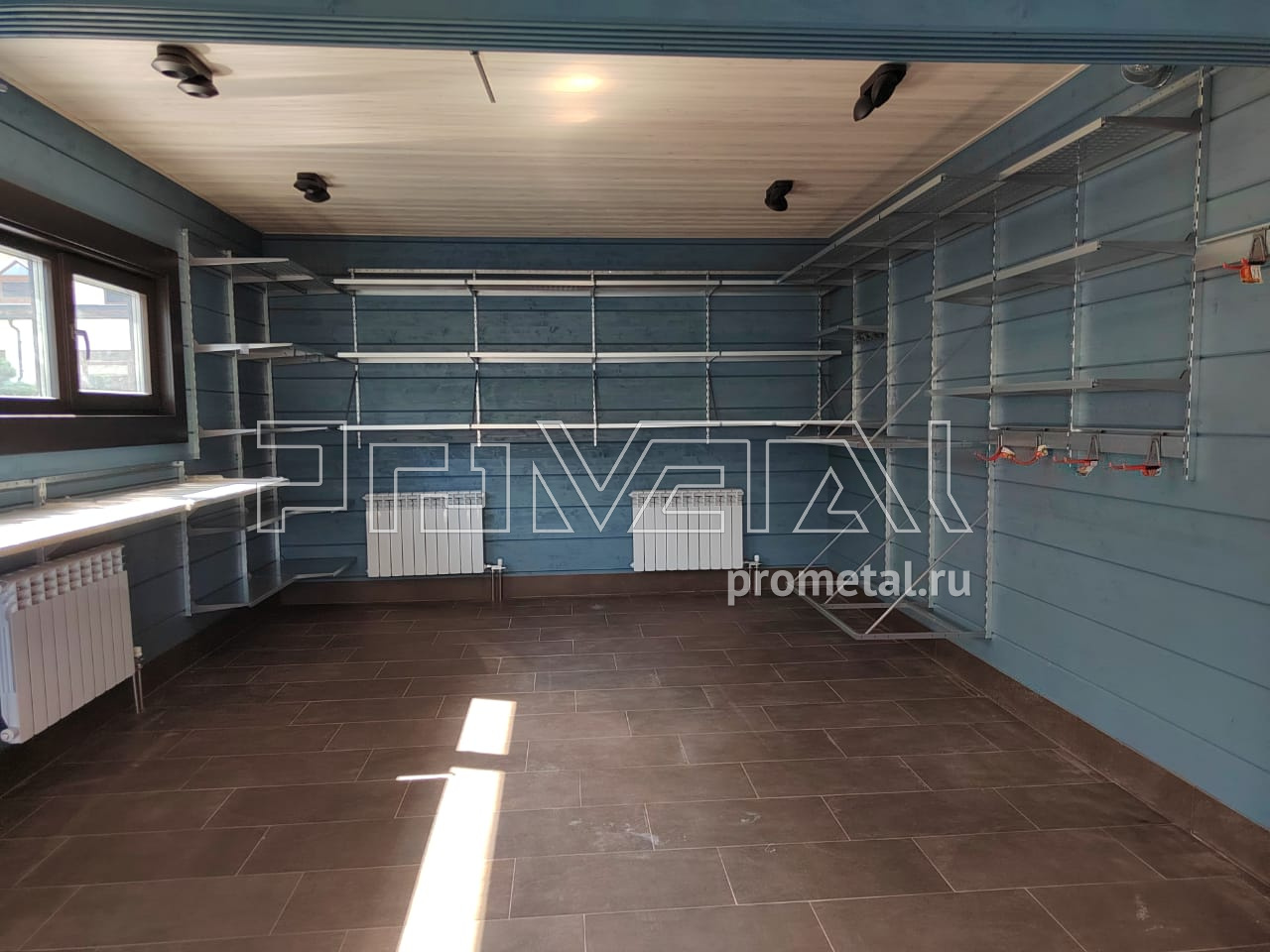 Помещение условно можно разделить на две части, в первой паркуется автомобиль, во второй необходимо предусмотреть систему хранения. В первой части помещения при входе мы предусмотрели рейлинги с крючками Эссе для хранения сад. и хоз. инвентаря, проходу к машине они не мешают, но очень удобны для хранения не габаритного инвентаря, под окном - рейлинги с корзинками Эссе. В этой же части предусмотрели стойку для кулерных бутылей. Во второй части помещения над окном обустроили рабочее место с откидными верстаками, по центральной стене полки глубиной 520мм для хранения любого крупного инвентаря, на правой стенке подвесы для 2-ух комплектов колес, рейлинги с крючками Эссе под сад инвентарь и стремянку.