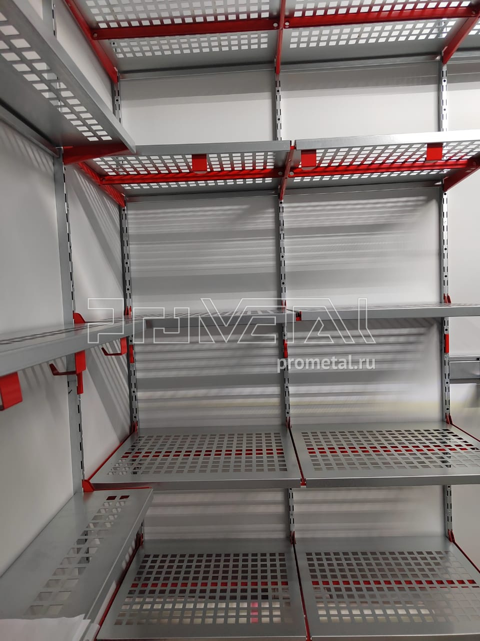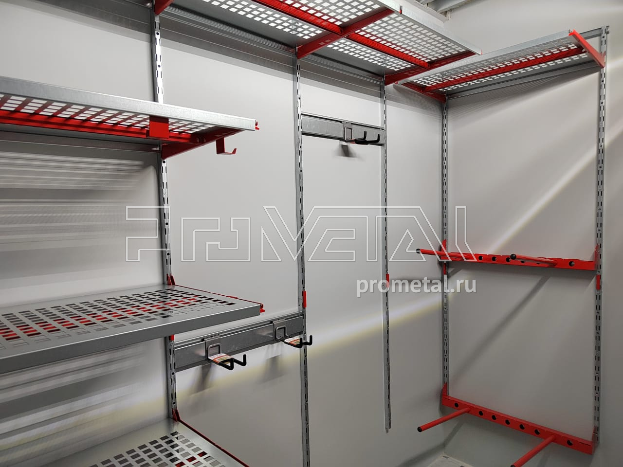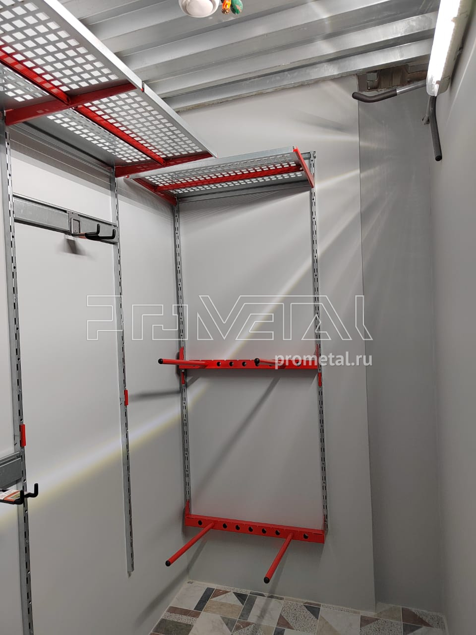 В дальнем углу предусмотрено хранение 2-ух комплектов колёс на модулях-держателях. Основную площадь стен помещения занимают полки с перфорацией для хранения различных вещей в коробках и пластиковых боксов. На центральной стене разместили рейлинги с крюками Эссе для различного хоз.инвентаря. В проекте предусмотрели несколько крюков на полку. Все перфорированные полки глубиной 520 мм усилены рёбрами жёсткости.